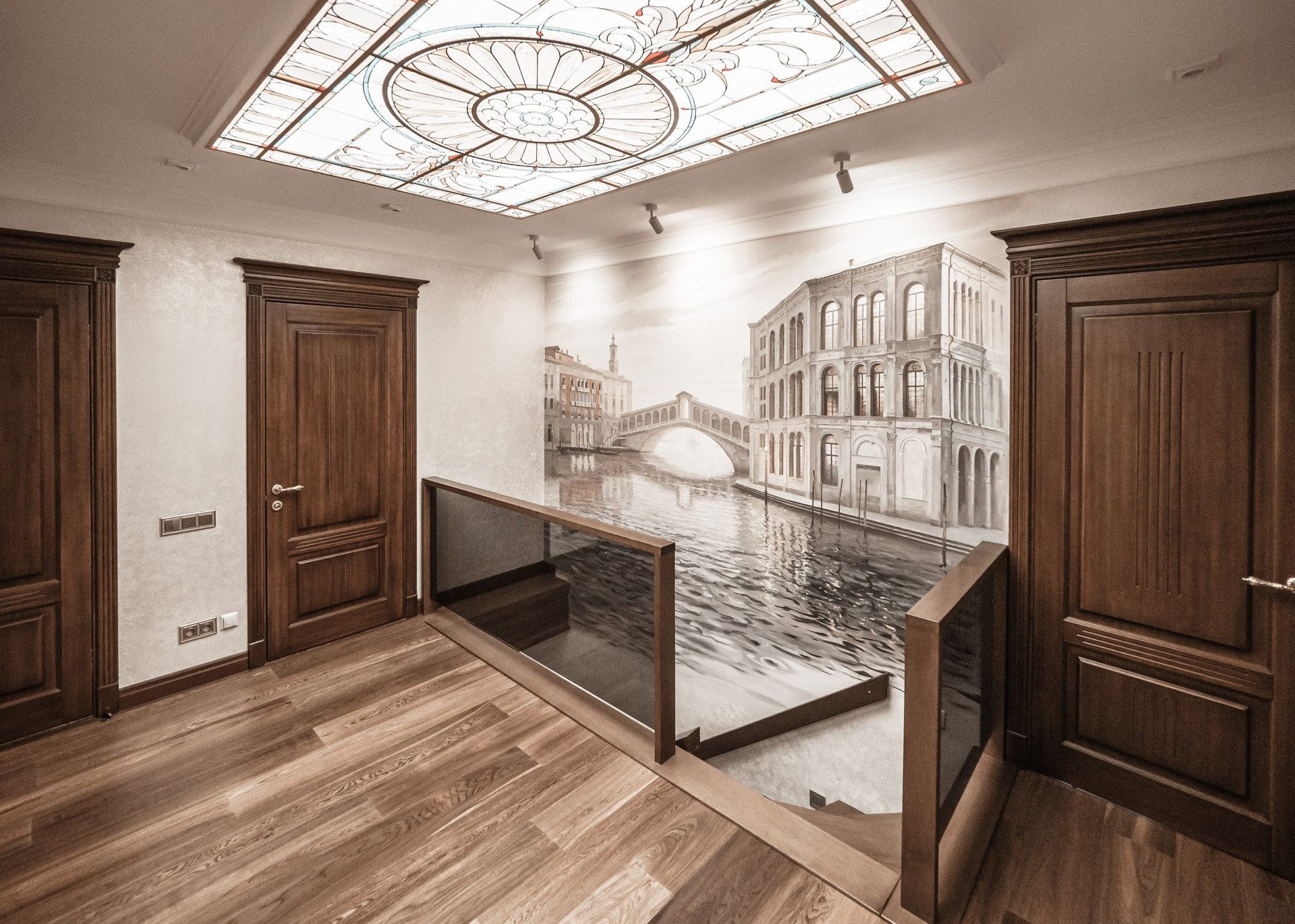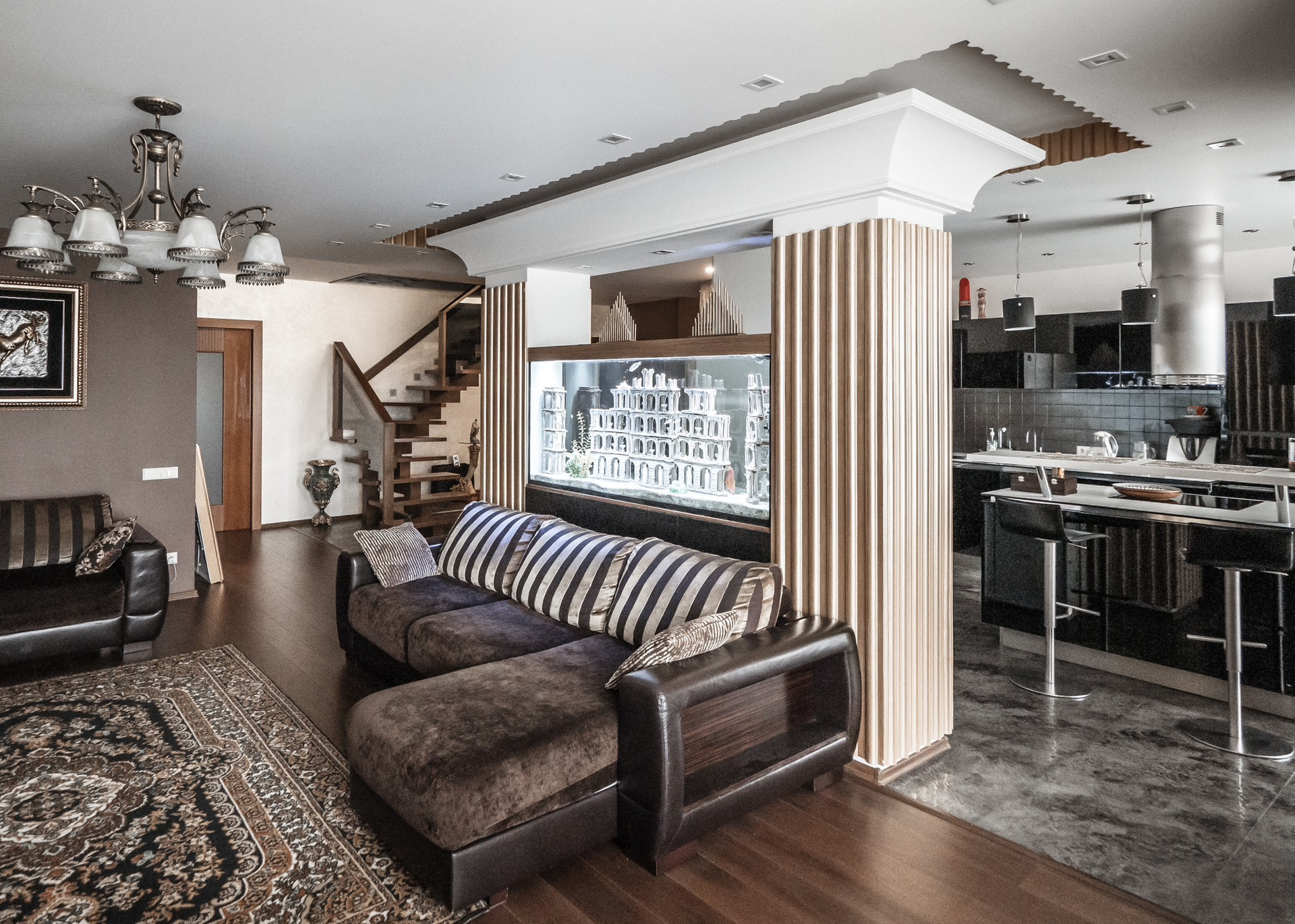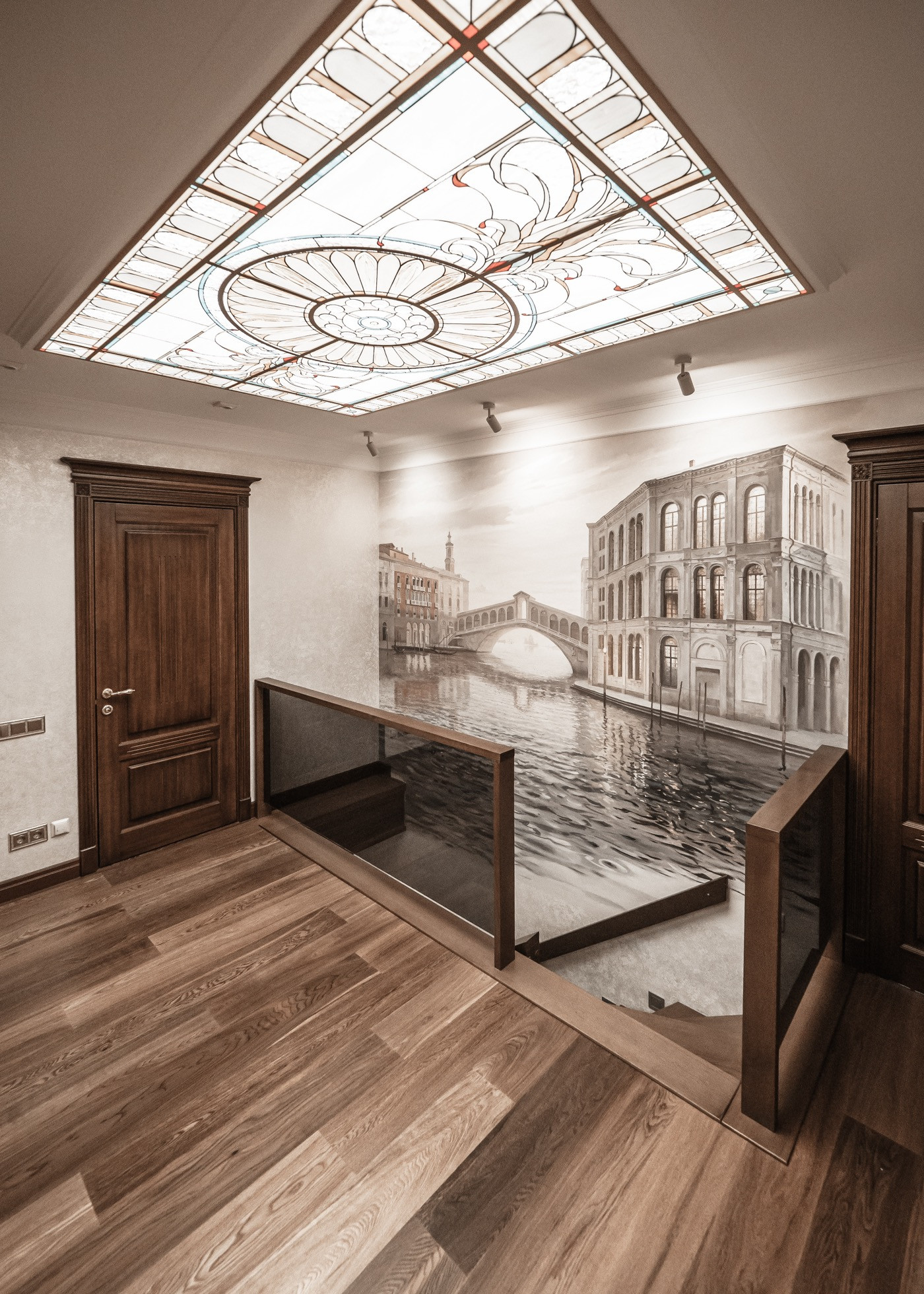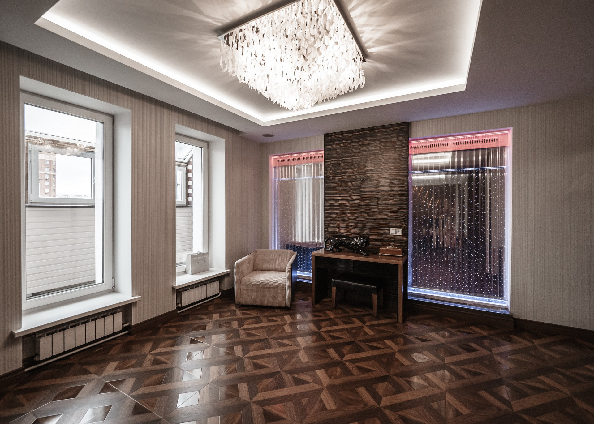 Квартира премиум класса для тех, кто ценит роскошь и комфорт в мелочах. В интерьере используются натуральные материалы: двери из бразильского дерева, потолок из бамбуковых обоев, рабочий кабинет украшает камень из итальянской каменоломни Antolini. Известный российский художник Александр Рихтер создал для квартиры уникальные произведения искусства: барельеф в холле и картину «Вечерняя Венеция» на втором этаже. Для релаксации на первом этаже расположен аквариум водоизмещением 1 тонна воды, а в основной спальне второго этажа— пузырьковые панели. Большая часть мебели — итальянское производство. Освещение холла второго этажа выполнено из настоящего витража из стекла Германии и Мексики (аналога такому произведению искусства точно нет). Вся квартира имеет прекрасную шумоизоляцию. Рядом с рабочим кабинетом расположена лоджия со стеклянным потолком, итальянским диваном и камином.