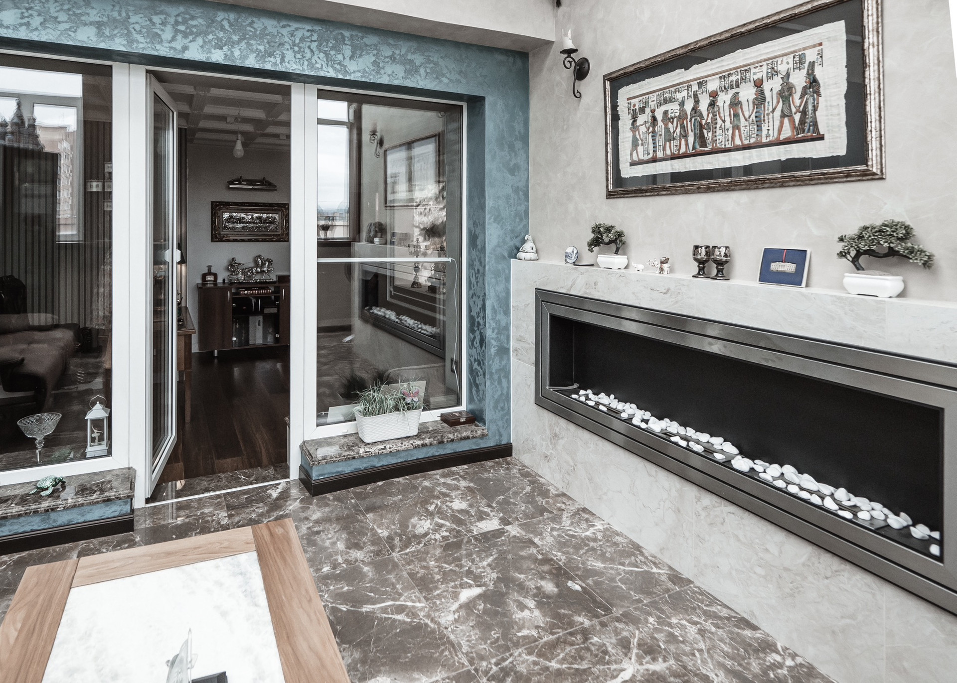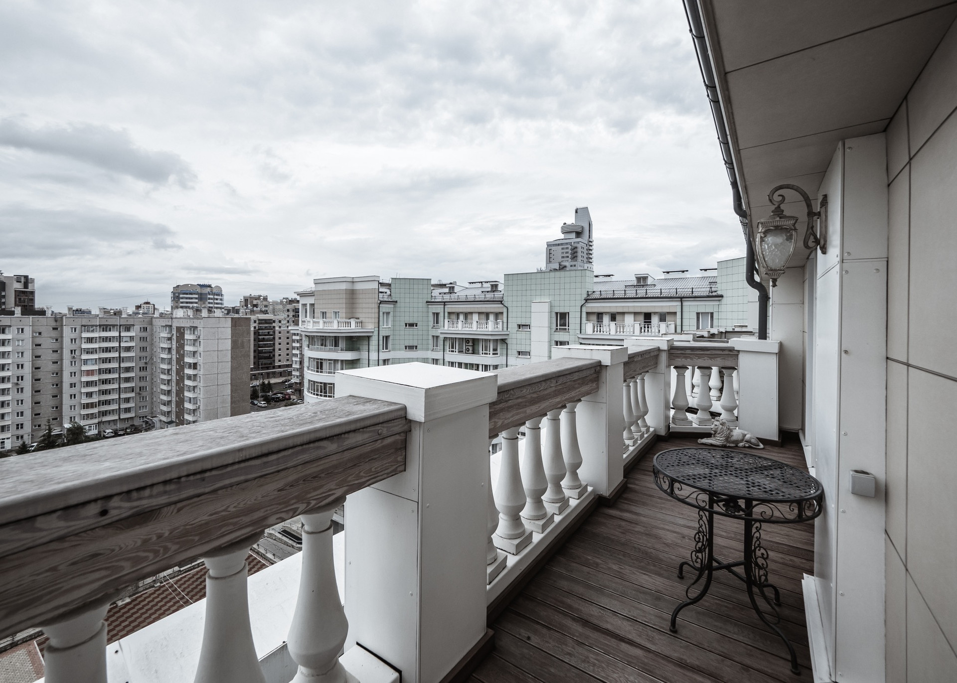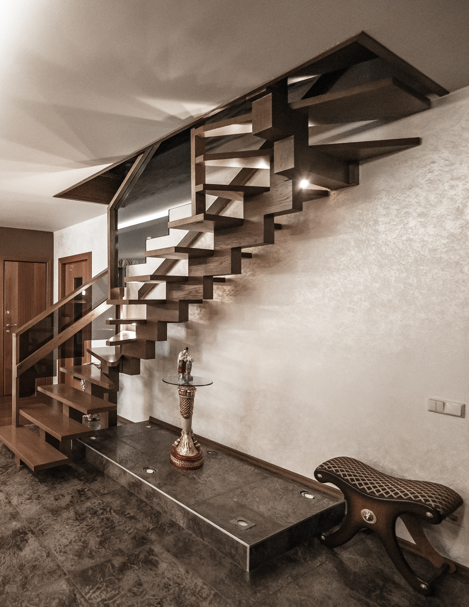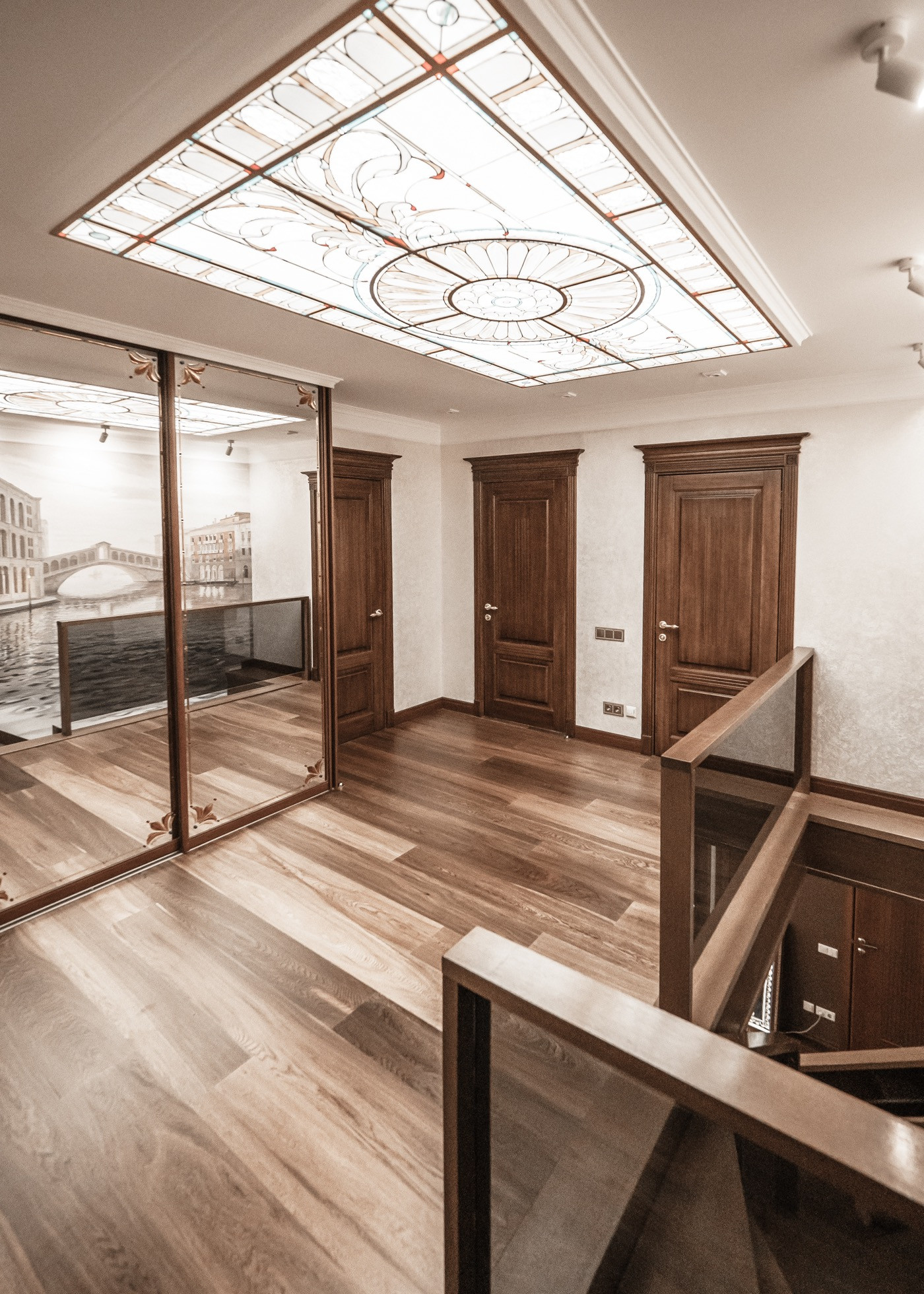Квартира премиум класса для тех, кто ценит роскошь и комфорт в мелочах. В интерьере используются натуральные материалы: двери из бразильского дерева, потолок из бамбуковых обоев, рабочий кабинет украшает камень из итальянской каменоломни Antolini. Известный российский художник Александр Рихтер создал для квартиры уникальные произведения искусства: барельеф в холле и картину «Вечерняя Венеция» на втором этаже. Для релаксации на первом этаже расположен аквариум водоизмещением 1 тонна воды, а в основной спальне второго этажа— пузырьковые панели. Большая часть мебели — итальянское производство. Освещение холла второго этажа выполнено из настоящего витража из стекла Германии и Мексики (аналога такому произведению искусства точно нет). Вся квартира имеет прекрасную шумоизоляцию. Рядом с рабочим кабинетом расположена лоджия со стеклянным потолком, итальянским диваном и камином.