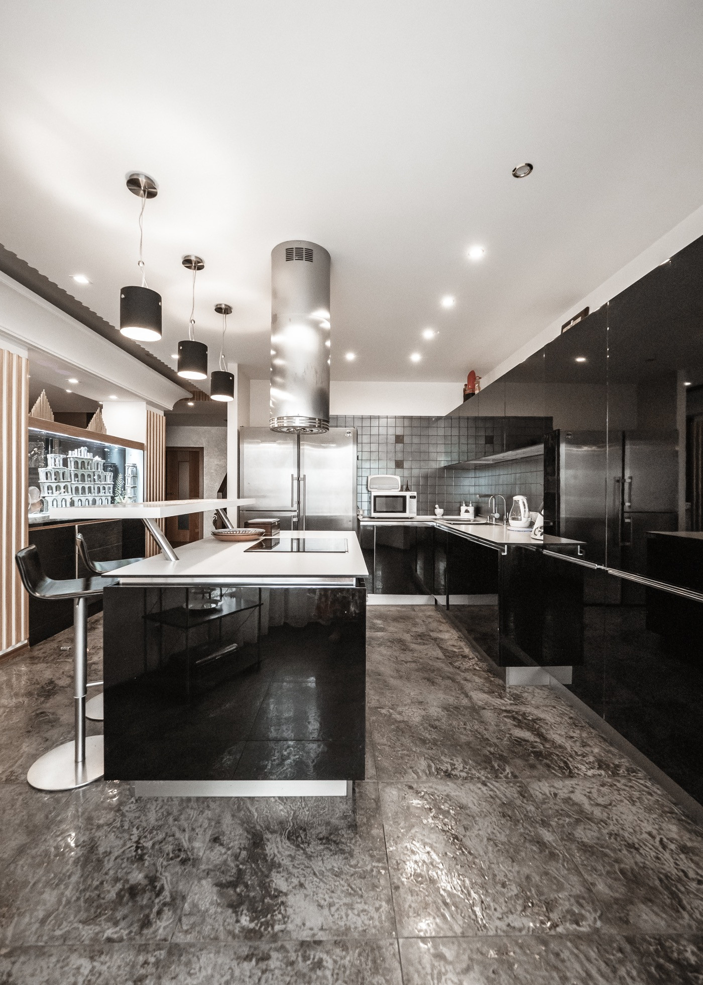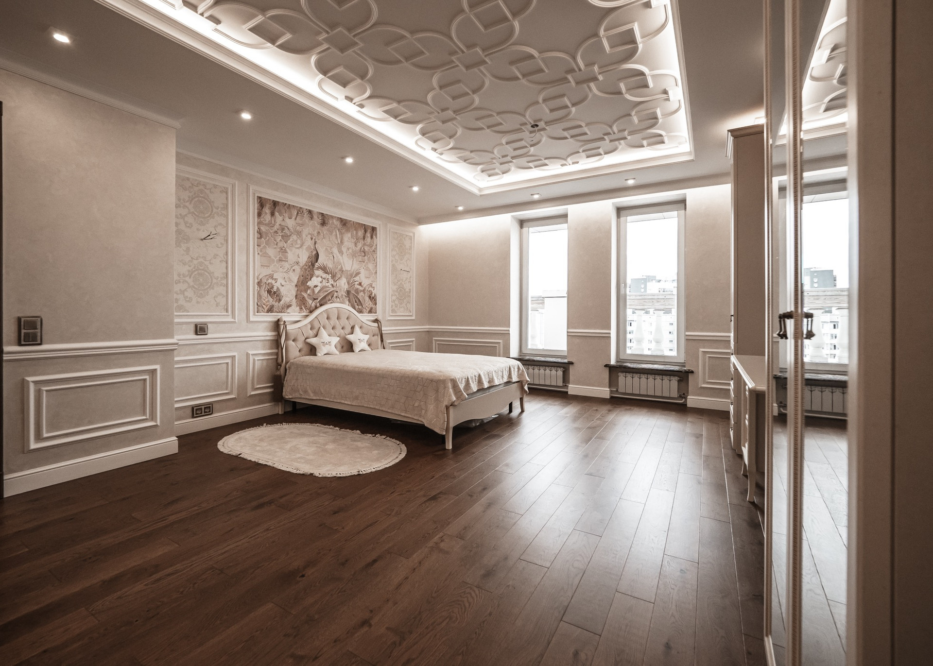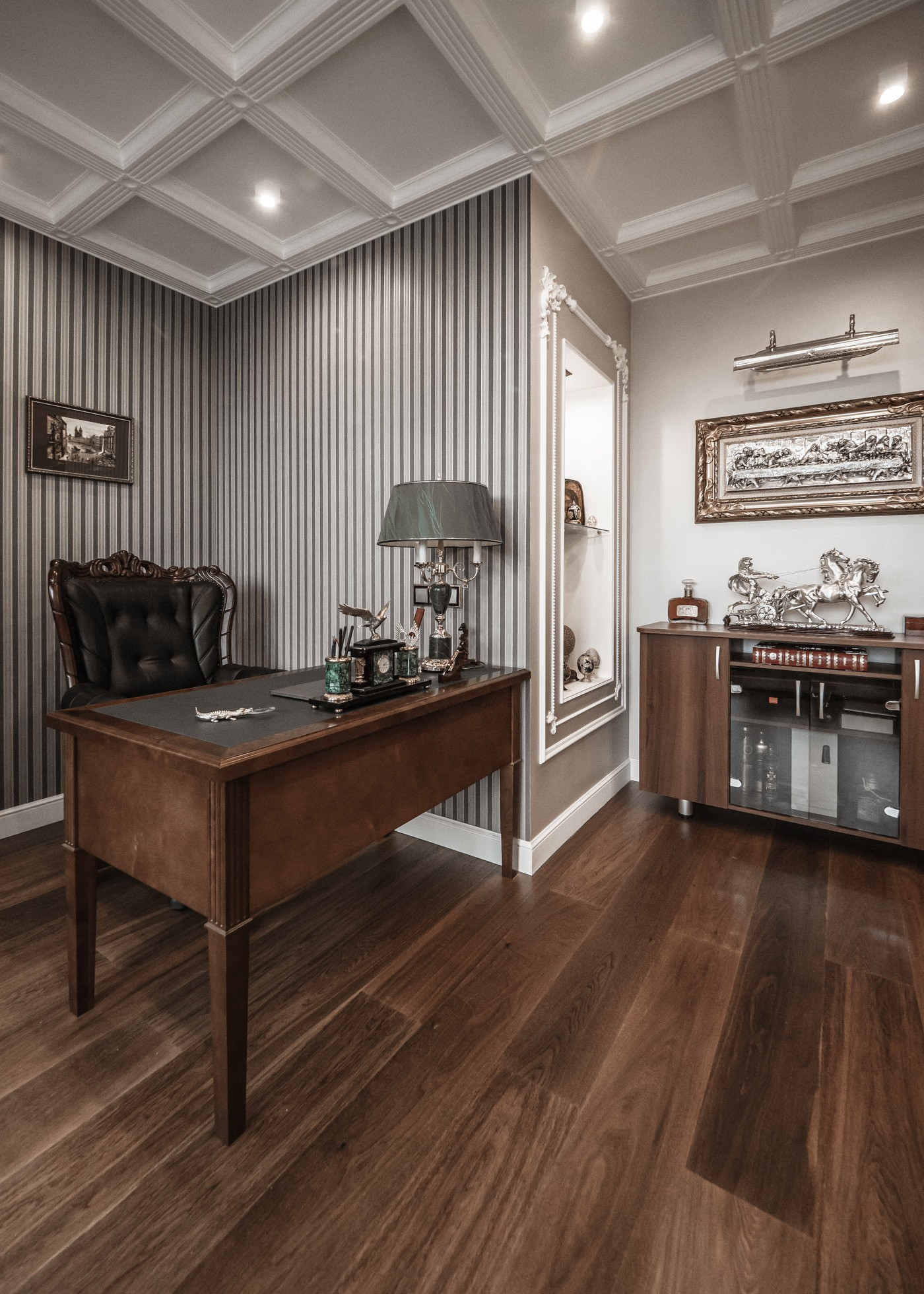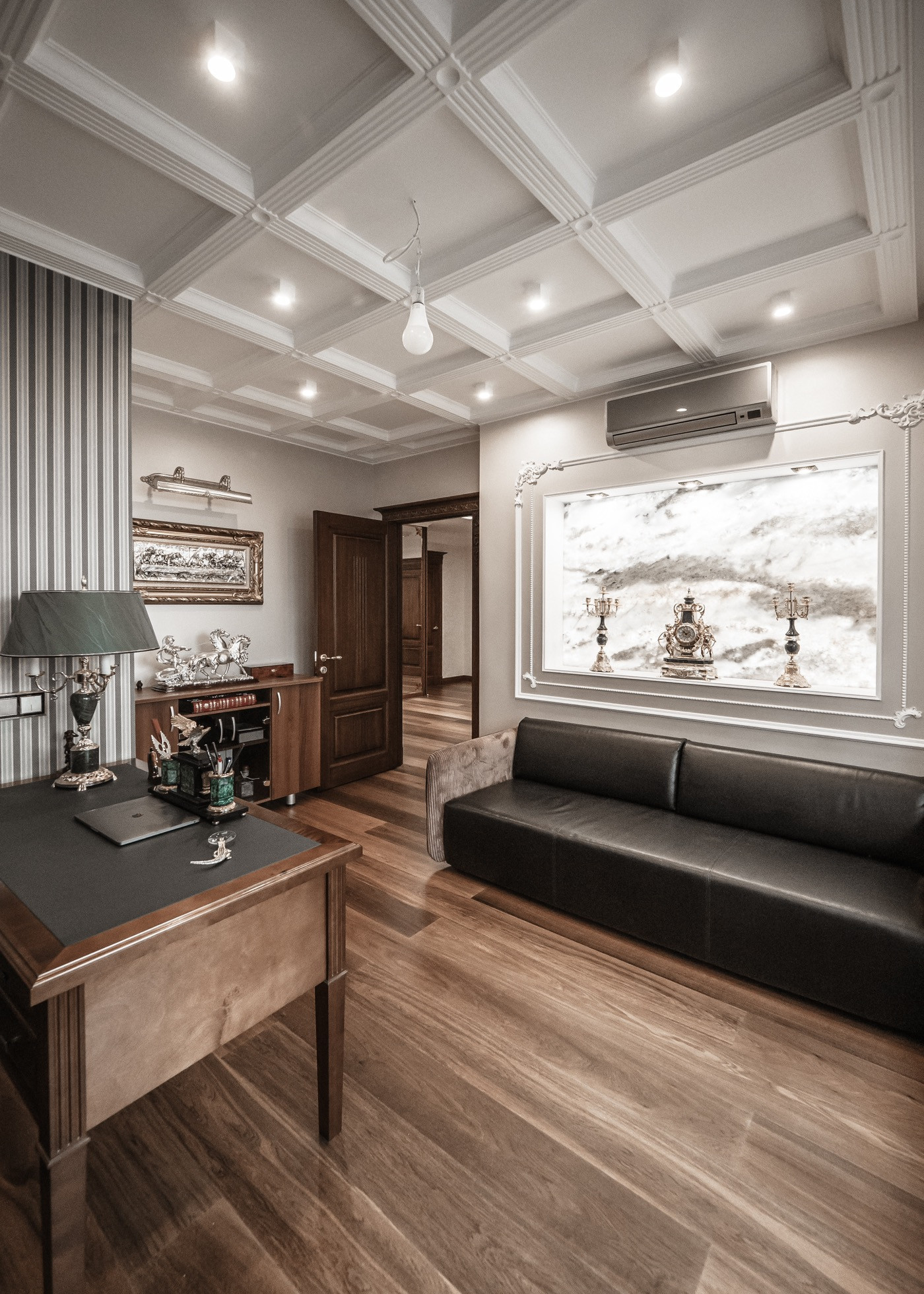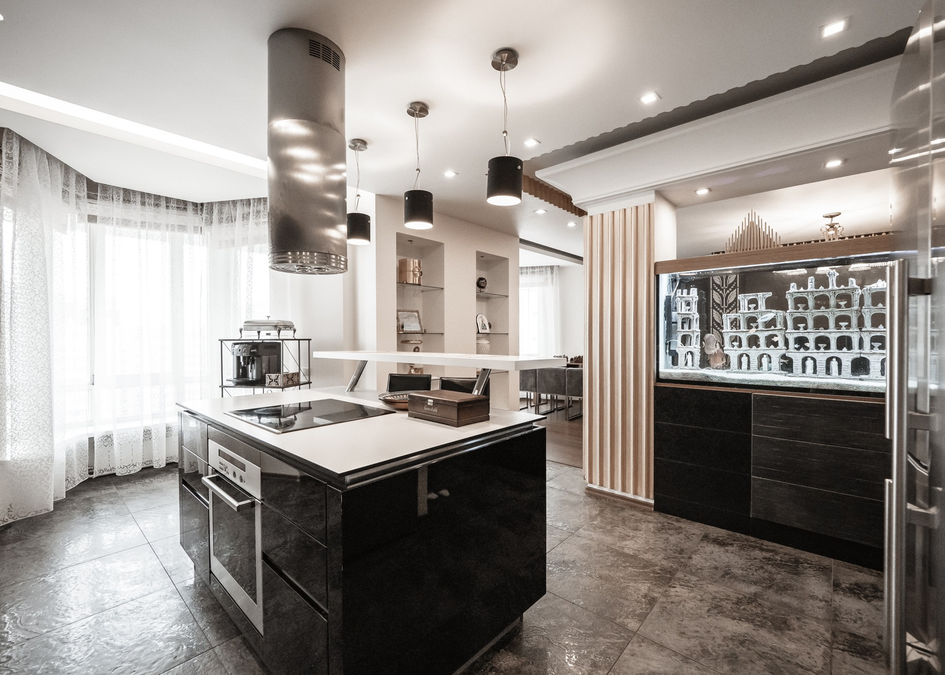 Квартира премиум класса для тех, кто ценит роскошь и комфорт в мелочах. В интерьере используются натуральные материалы: двери из бразильского дерева, потолок из бамбуковых обоев, рабочий кабинет украшает камень из итальянской каменоломни Antolini. Известный российский художник Александр Рихтер создал для квартиры уникальные произведения искусства: барельеф в холле и картину «Вечерняя Венеция» на втором этаже. Для релаксации на первом этаже расположен аквариум водоизмещением 1 тонна воды, а в основной спальне второго этажа— пузырьковые панели. Большая часть мебели — итальянское производство. Освещение холла второго этажа выполнено из настоящего витража из стекла Германии и Мексики (аналога такому произведению искусства точно нет). Вся квартира имеет прекрасную шумоизоляцию. Рядом с рабочим кабинетом расположена лоджия со стеклянным потолком, итальянским диваном и камином.