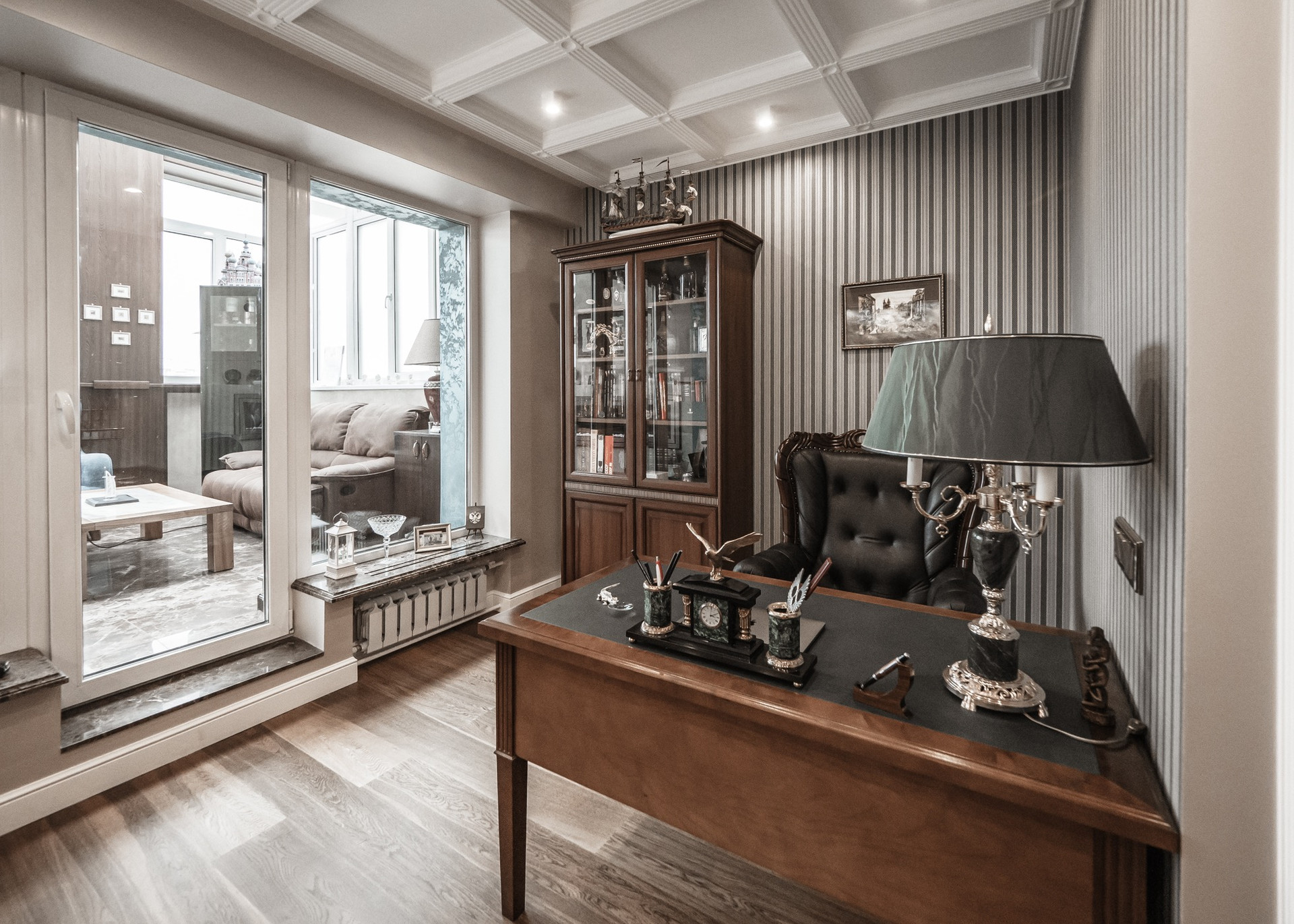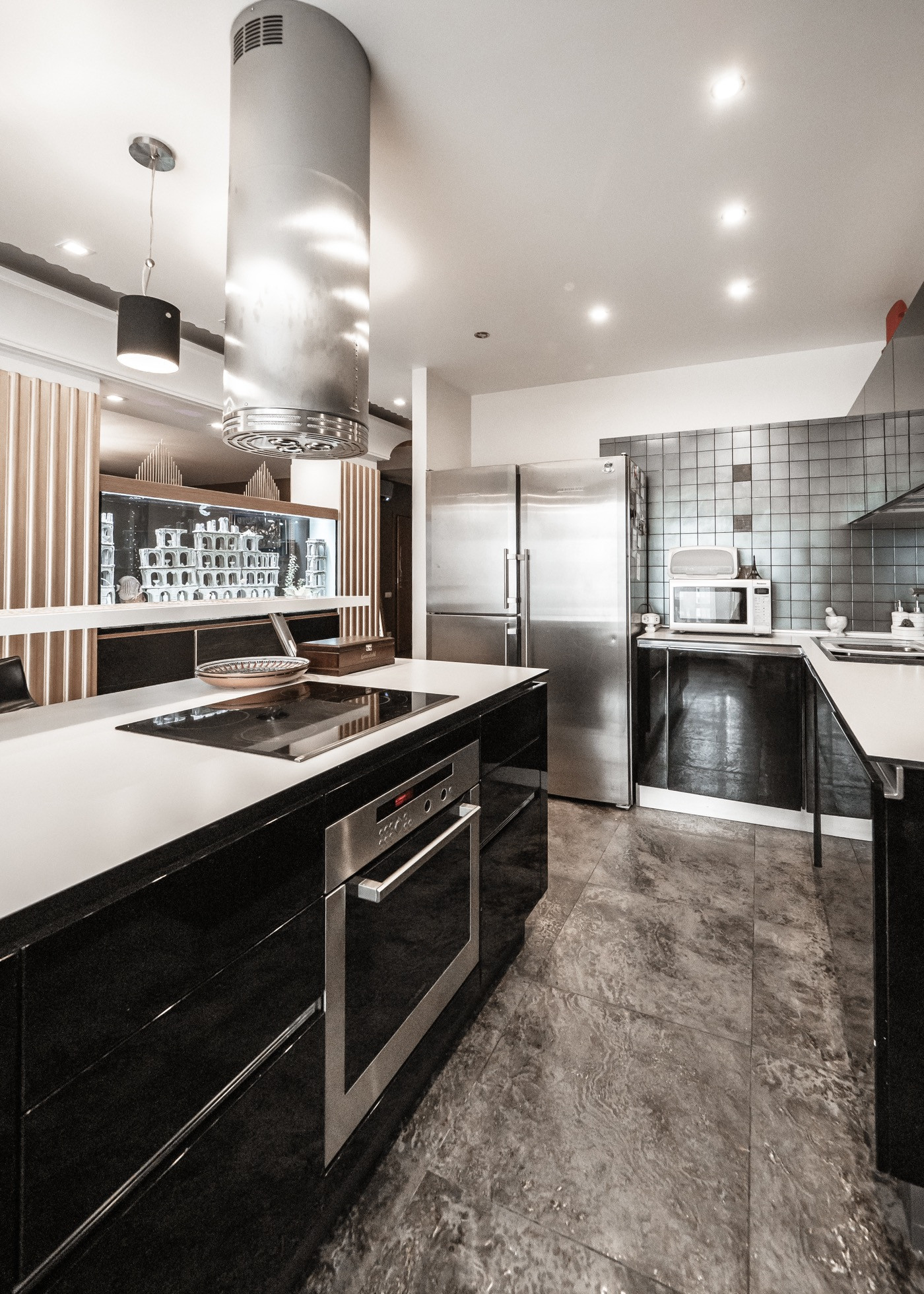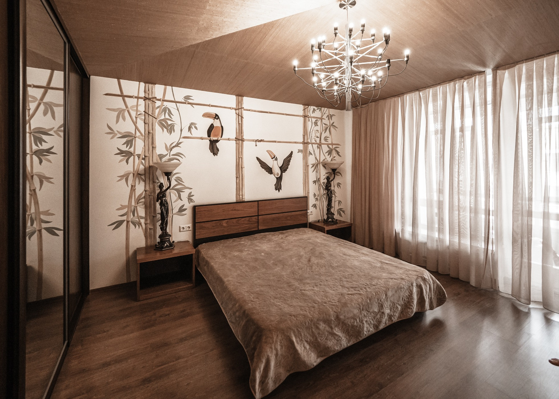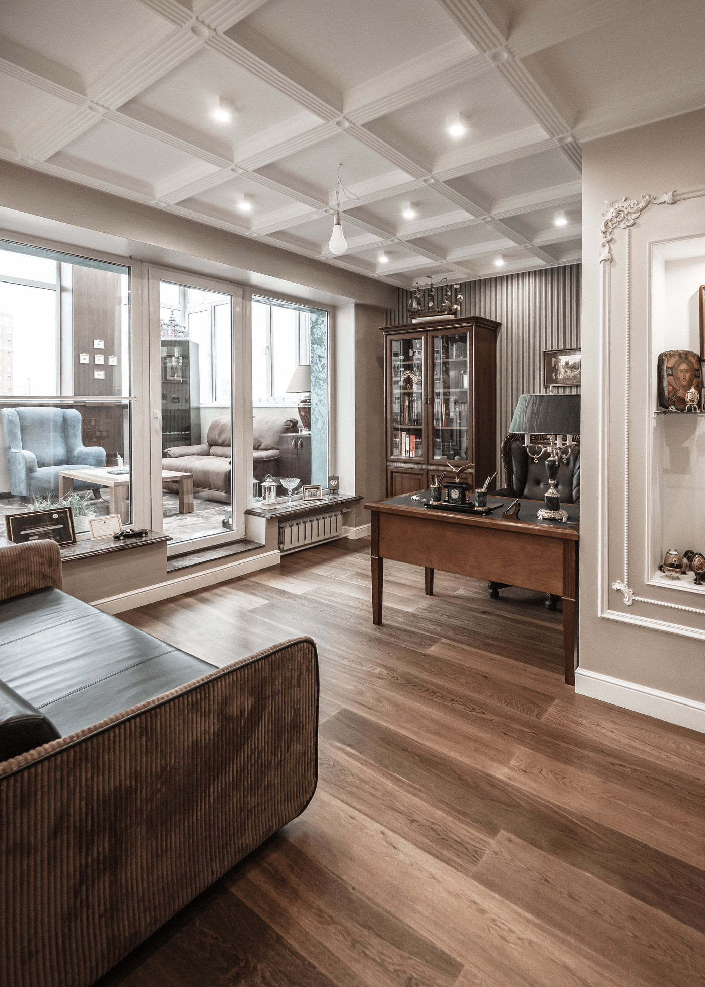 Квартира премиум класса для тех, кто ценит роскошь и комфорт в мелочах. В интерьере используются натуральные материалы: двери из бразильского дерева, потолок из бамбуковых обоев, рабочий кабинет украшает камень из итальянской каменоломни Antolini. Известный российский художник Александр Рихтер создал для квартиры уникальные произведения искусства: барельеф в холле и картину «Вечерняя Венеция» на втором этаже. Для релаксации на первом этаже расположен аквариум водоизмещением 1 тонна воды, а в основной спальне второго этажа— пузырьковые панели. Большая часть мебели — итальянское производство. Освещение холла второго этажа выполнено из настоящего витража из стекла Германии и Мексики (аналога такому произведению искусства точно нет). Вся квартира имеет прекрасную шумоизоляцию. Рядом с рабочим кабинетом расположена лоджия со стеклянным потолком, итальянским диваном и камином.