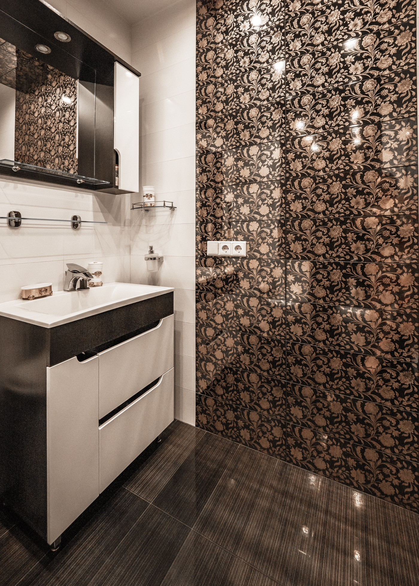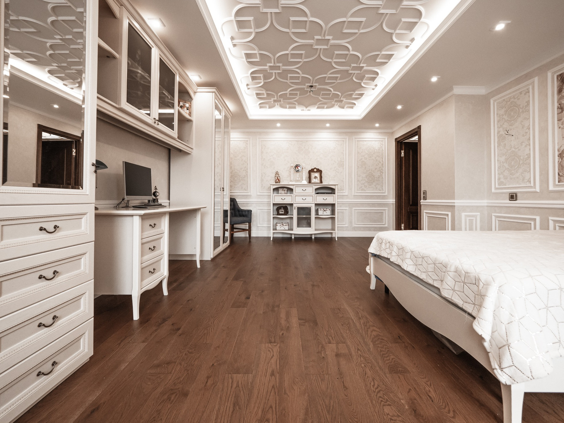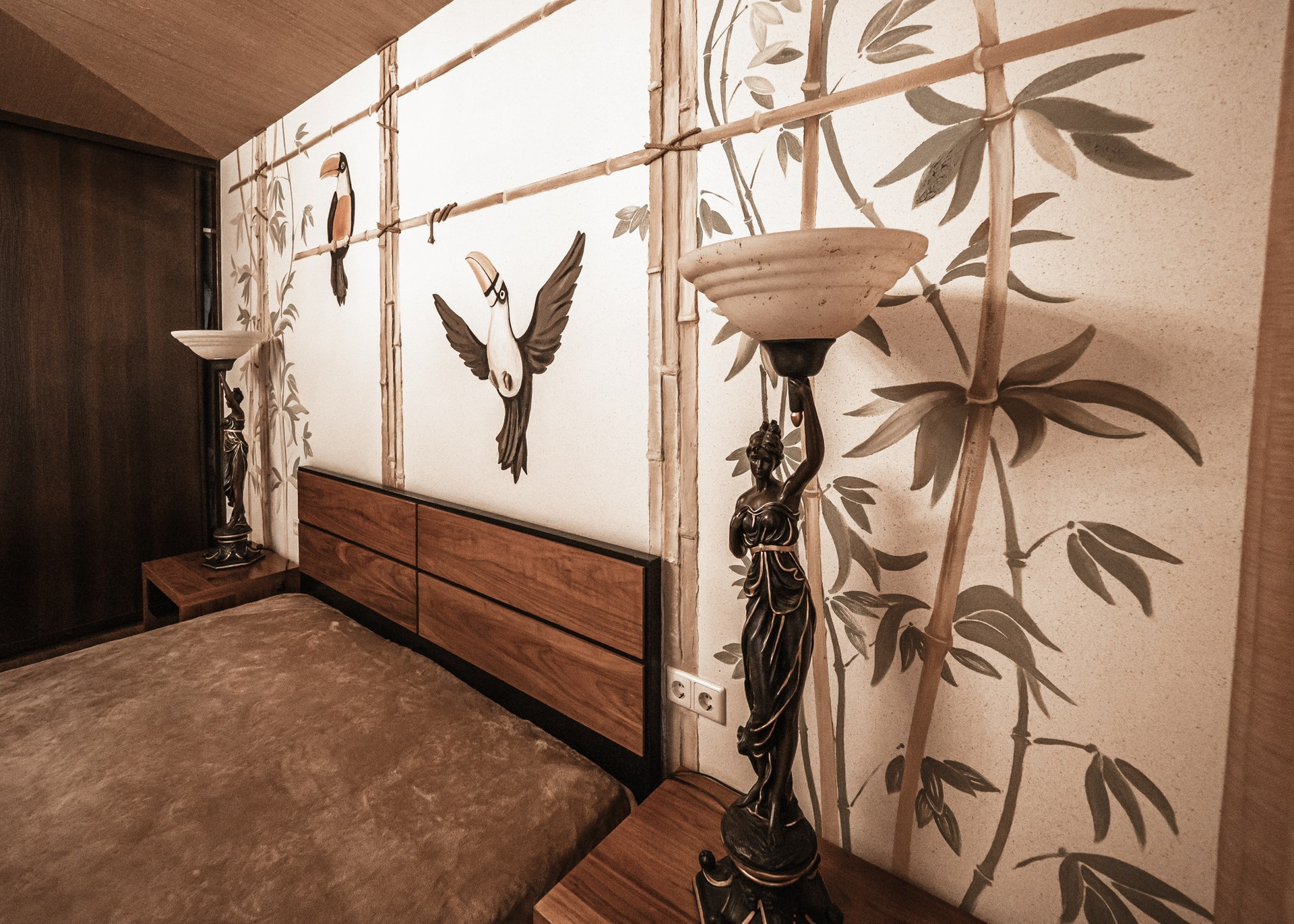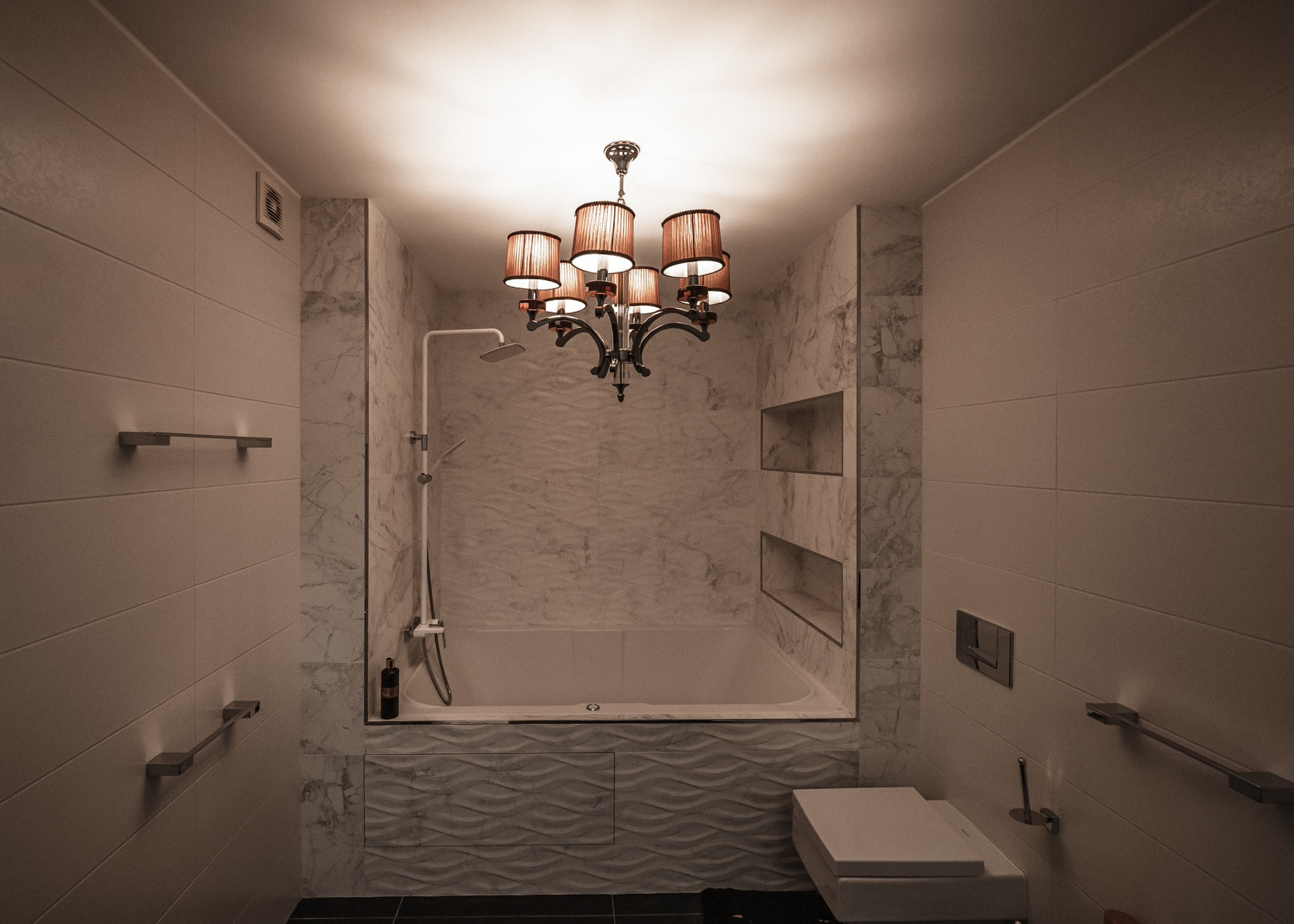 Квартира премиум класса для тех, кто ценит роскошь и комфорт в мелочах. В интерьере используются натуральные материалы: двери из бразильского дерева, потолок из бамбуковых обоев, рабочий кабинет украшает камень из итальянской каменоломни Antolini. Известный российский художник Александр Рихтер создал для квартиры уникальные произведения искусства: барельеф в холле и картину «Вечерняя Венеция» на втором этаже. Для релаксации на первом этаже расположен аквариум водоизмещением 1 тонна воды, а в основной спальне второго этажа— пузырьковые панели. Большая часть мебели — итальянское производство. Освещение холла второго этажа выполнено из настоящего витража из стекла Германии и Мексики (аналога такому произведению искусства точно нет). Вся квартира имеет прекрасную шумоизоляцию. Рядом с рабочим кабинетом расположена лоджия со стеклянным потолком, итальянским диваном и камином.