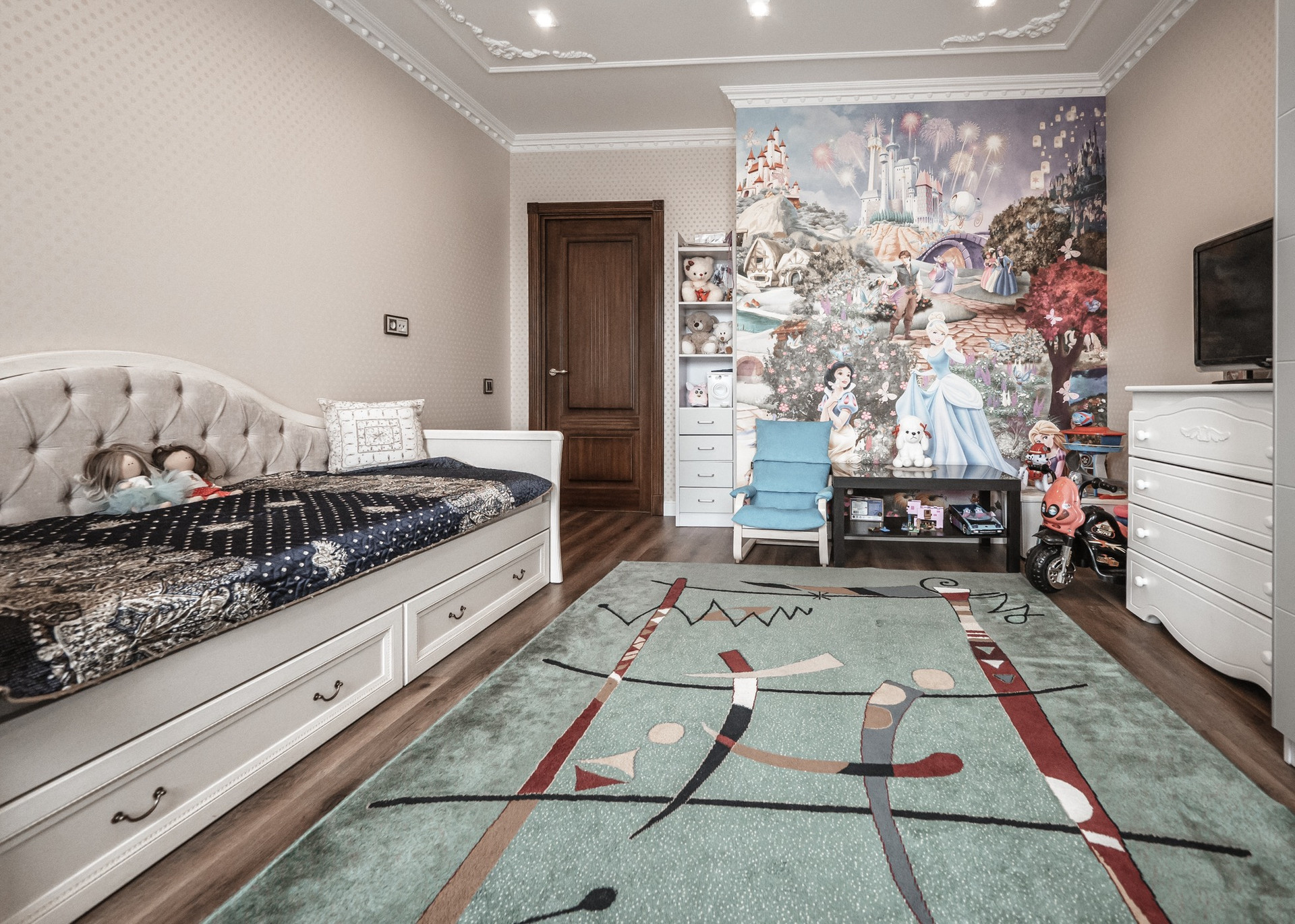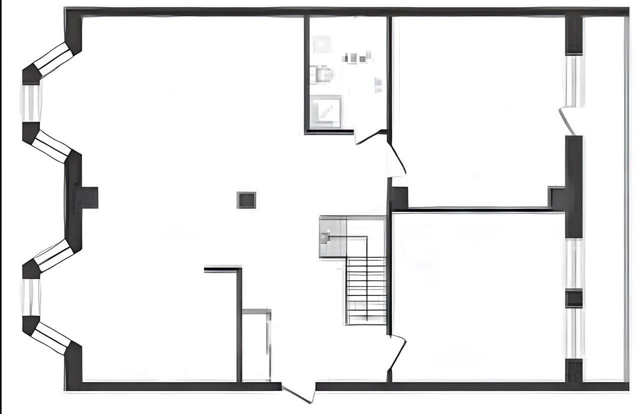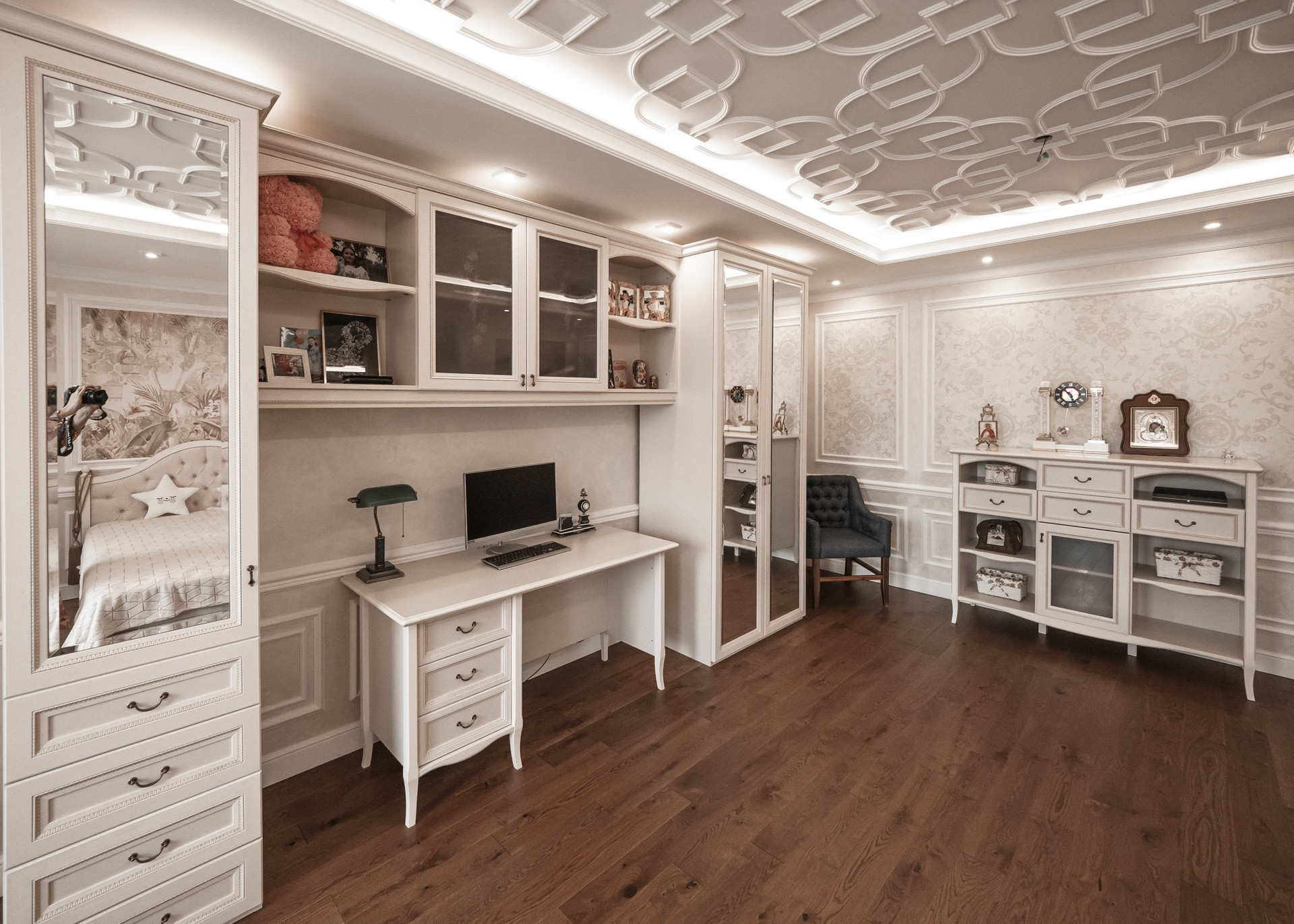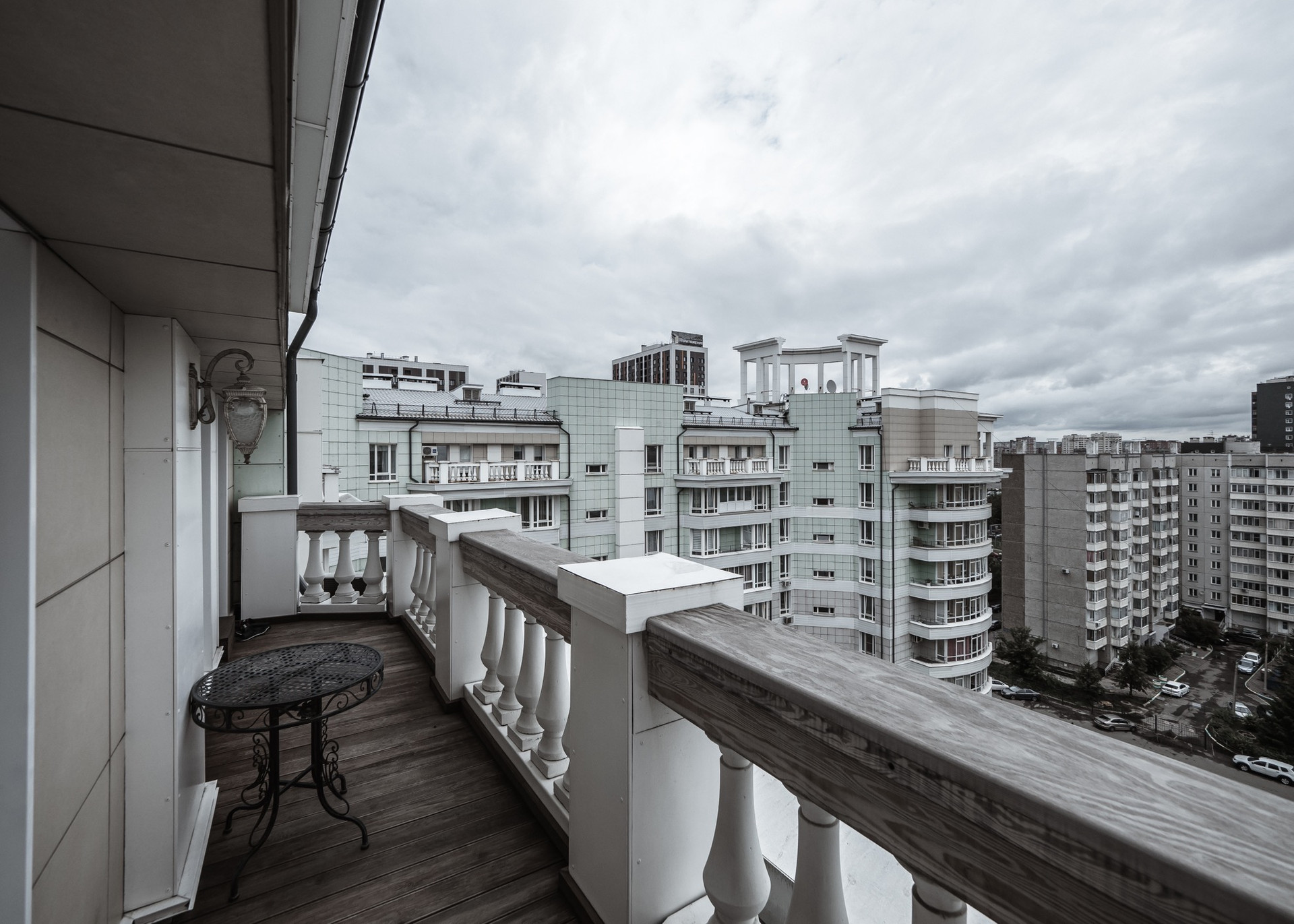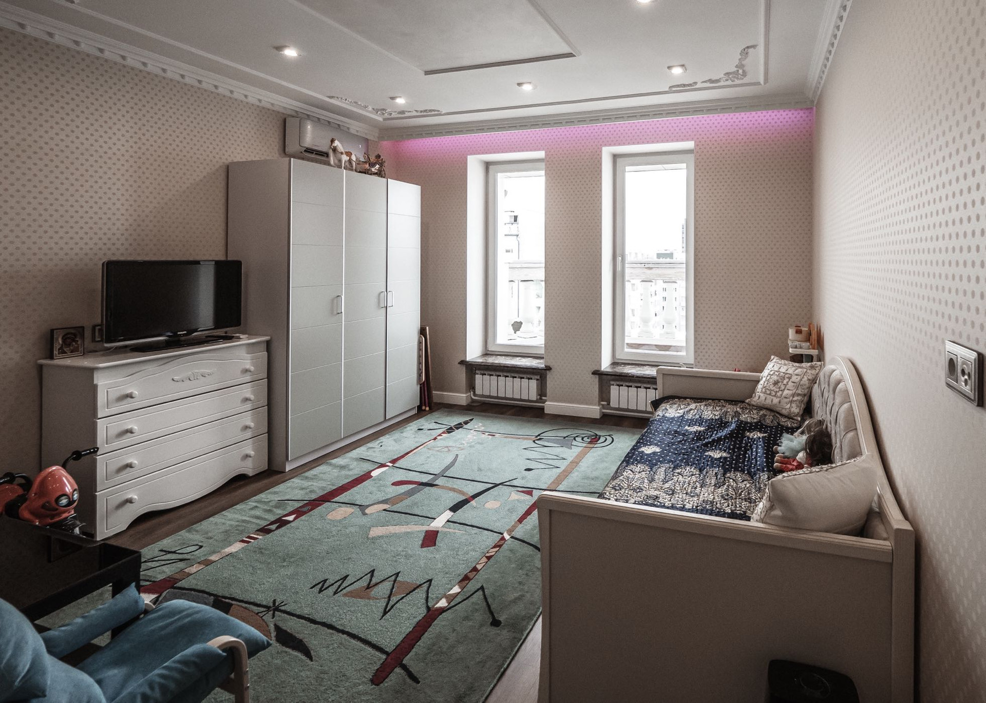 Квартира имеет 2 этажа (9 и 10 этажи дома). На первом этаже расположились зал, кухня-столовая, прачечная, санузел и гостевая спальня. На втором этаже кабинет, лоджия со стеклянным потолком, мастер-спальня, игровая, детская-спальня, санузел. Всего в квартире 7 комнат. Окна выходят на две стороны.