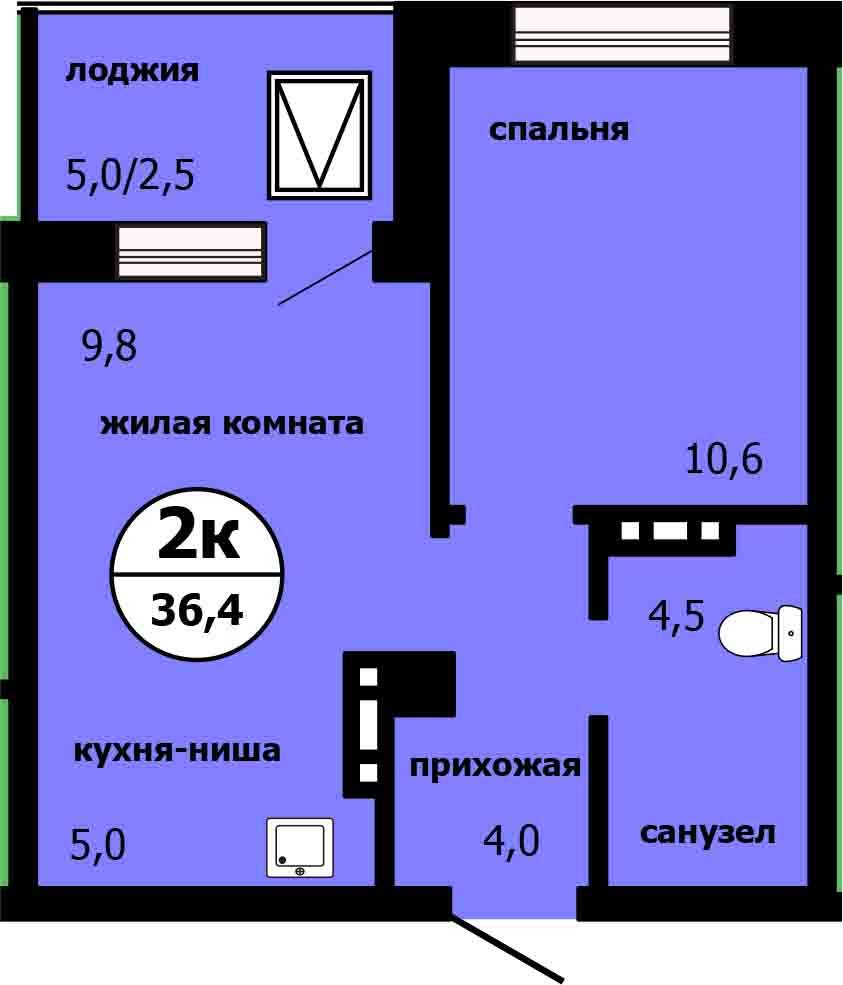 Общая площадь 36.4 м2