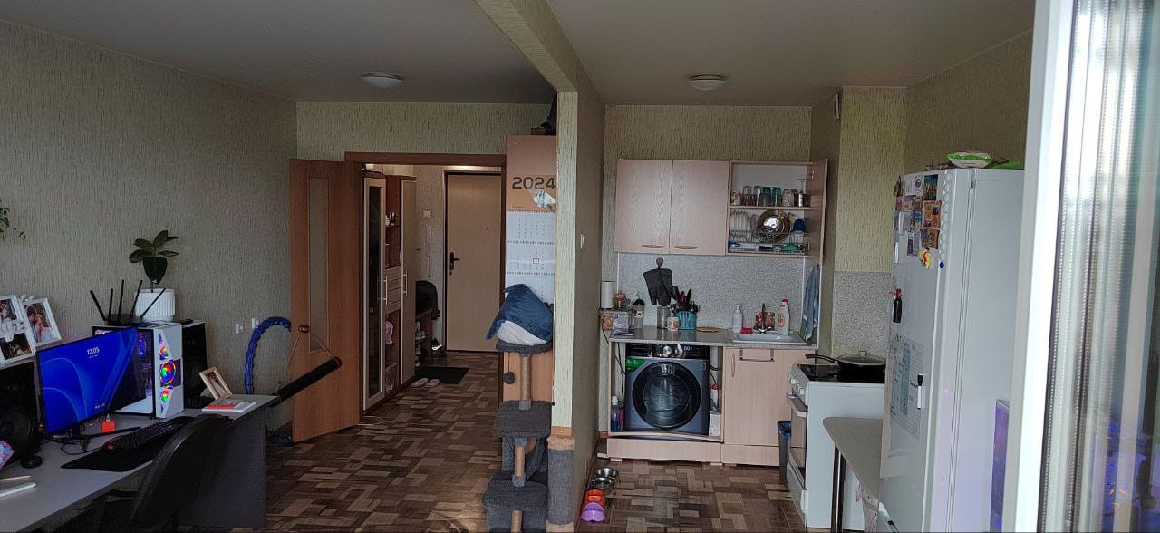 выделенная зона кухни, просторная комната, большая лоджия (застеклена)