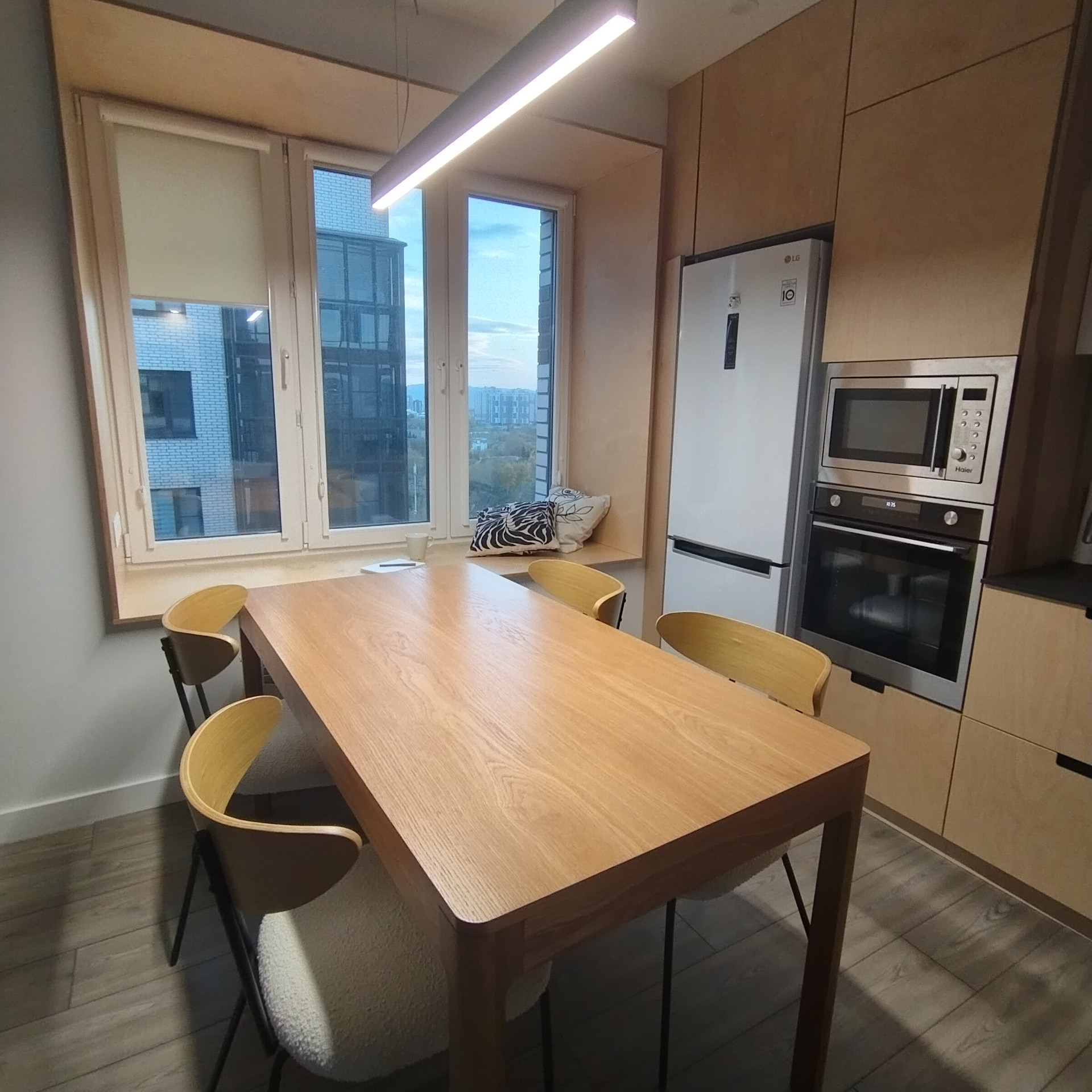 На кухне при продаже остается духовой шкаф, СВЧ-печь, варочная панель, холодильник, посудомоечная машина, измельчитель бытовых отходов, фильтр для воды, вытяжка.