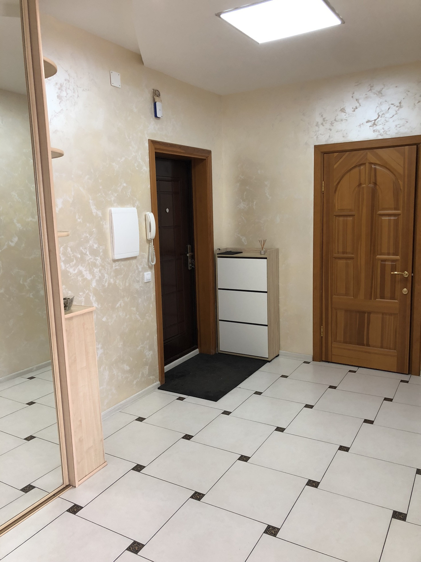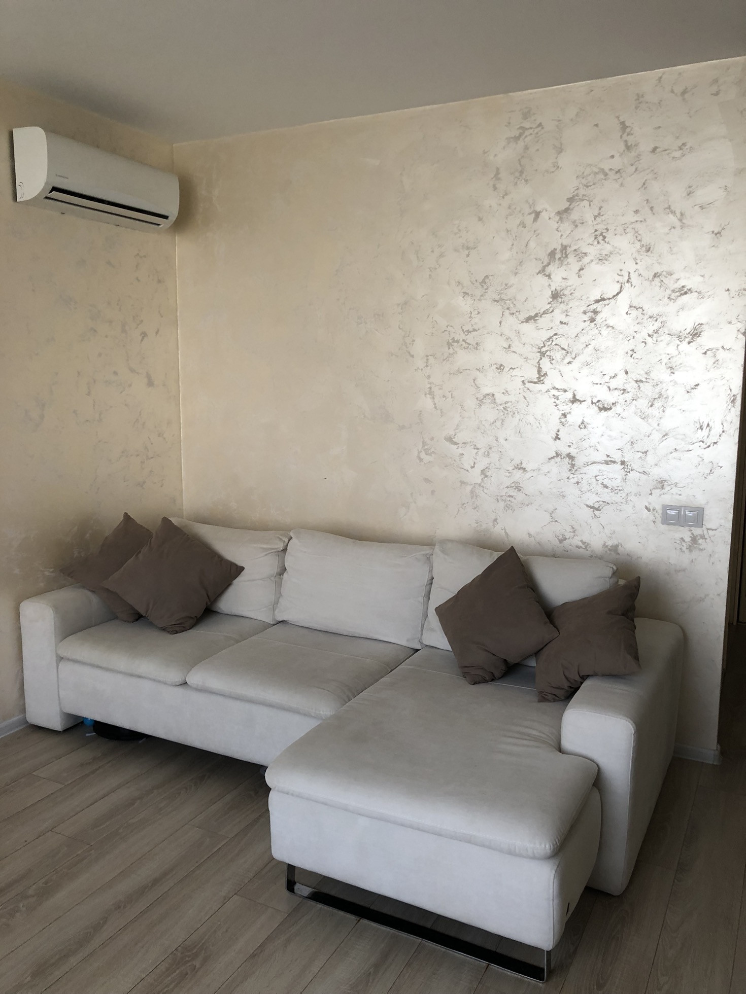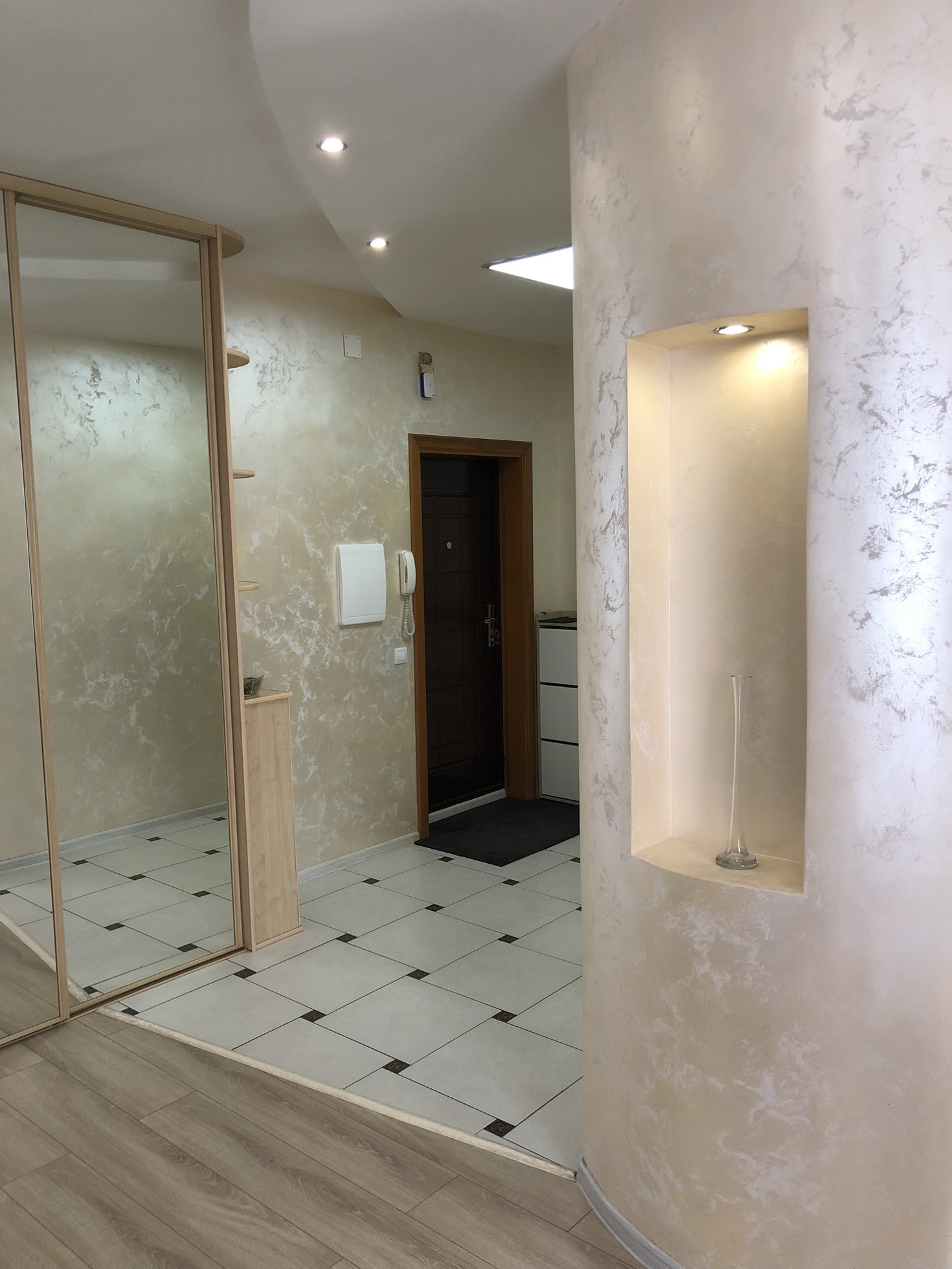 Квартира теплая и светлая, выполнен свежий,современный и качественный ремонт. Материалы использованы дорогие,делали «для себя». Сделана шумоизоляция боковых стен. Имеется кондиционер. На полу кафельная плитка,ламинат. Стены - декоративная штукатурка (фото не передает всю красоту,вживую смотрится очень интересно).