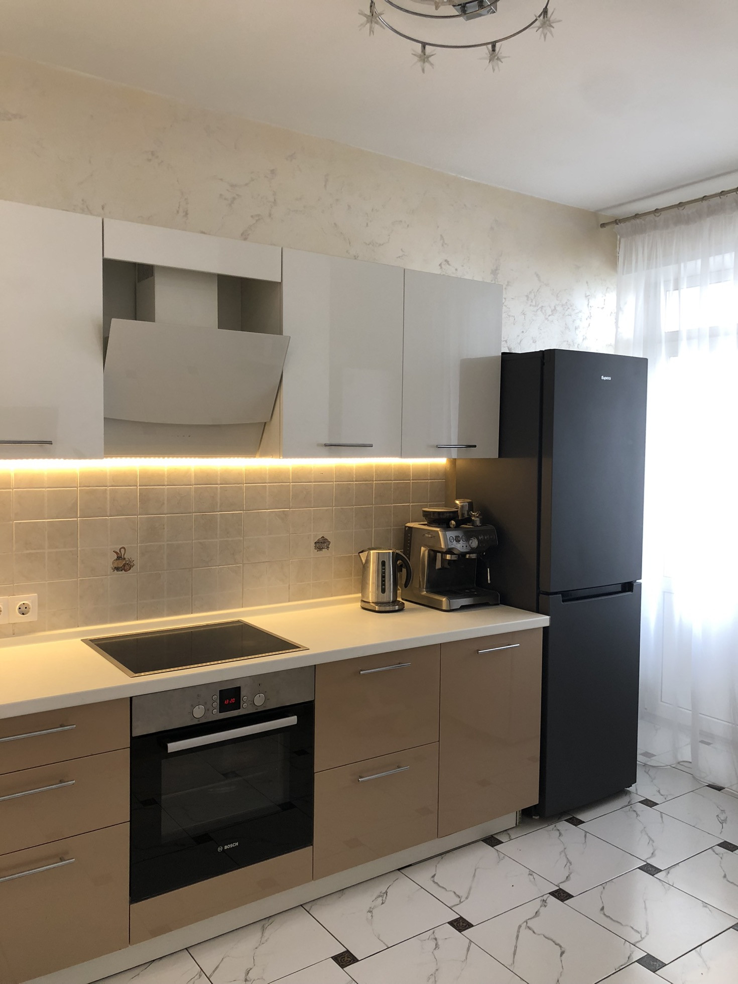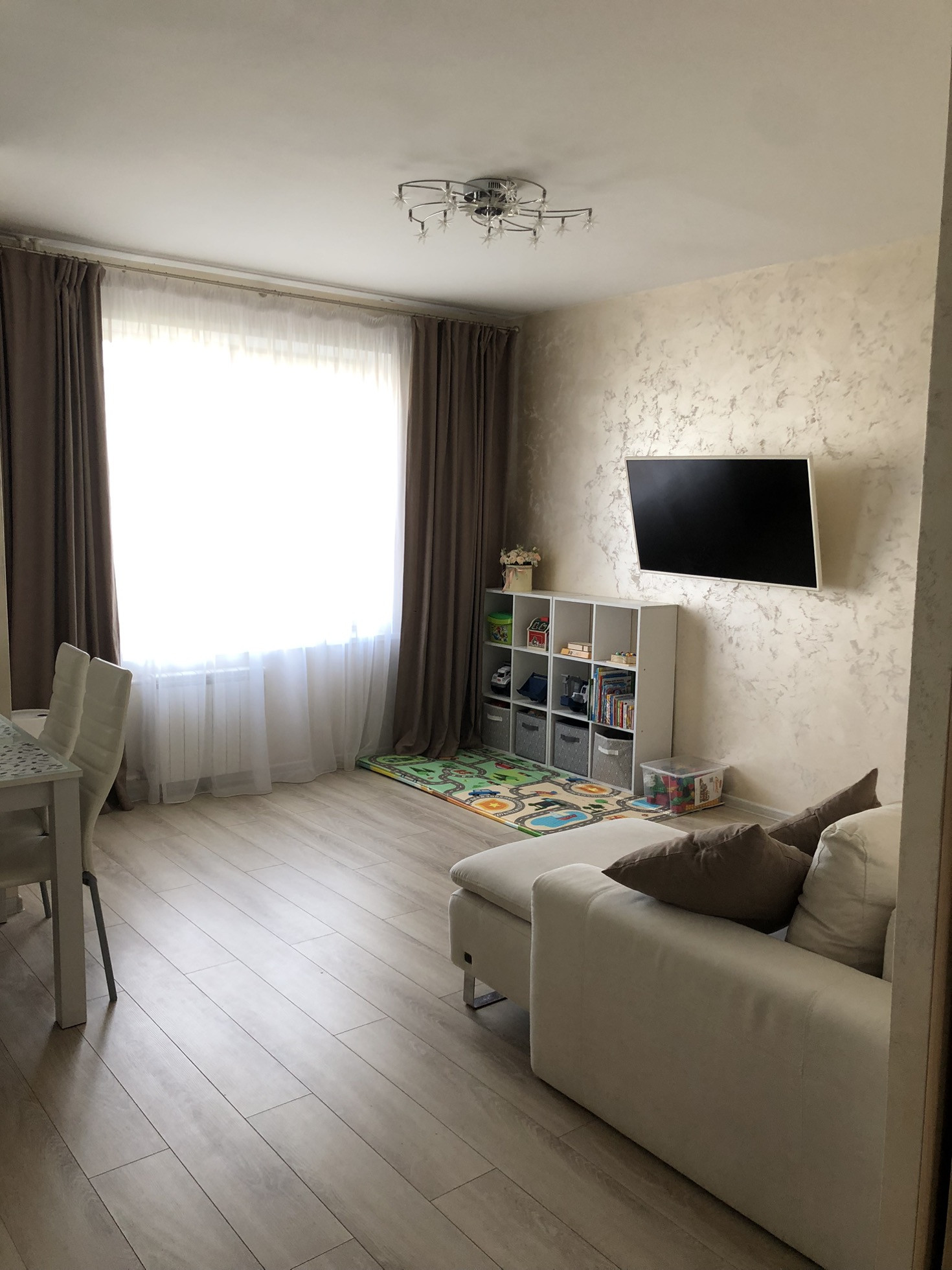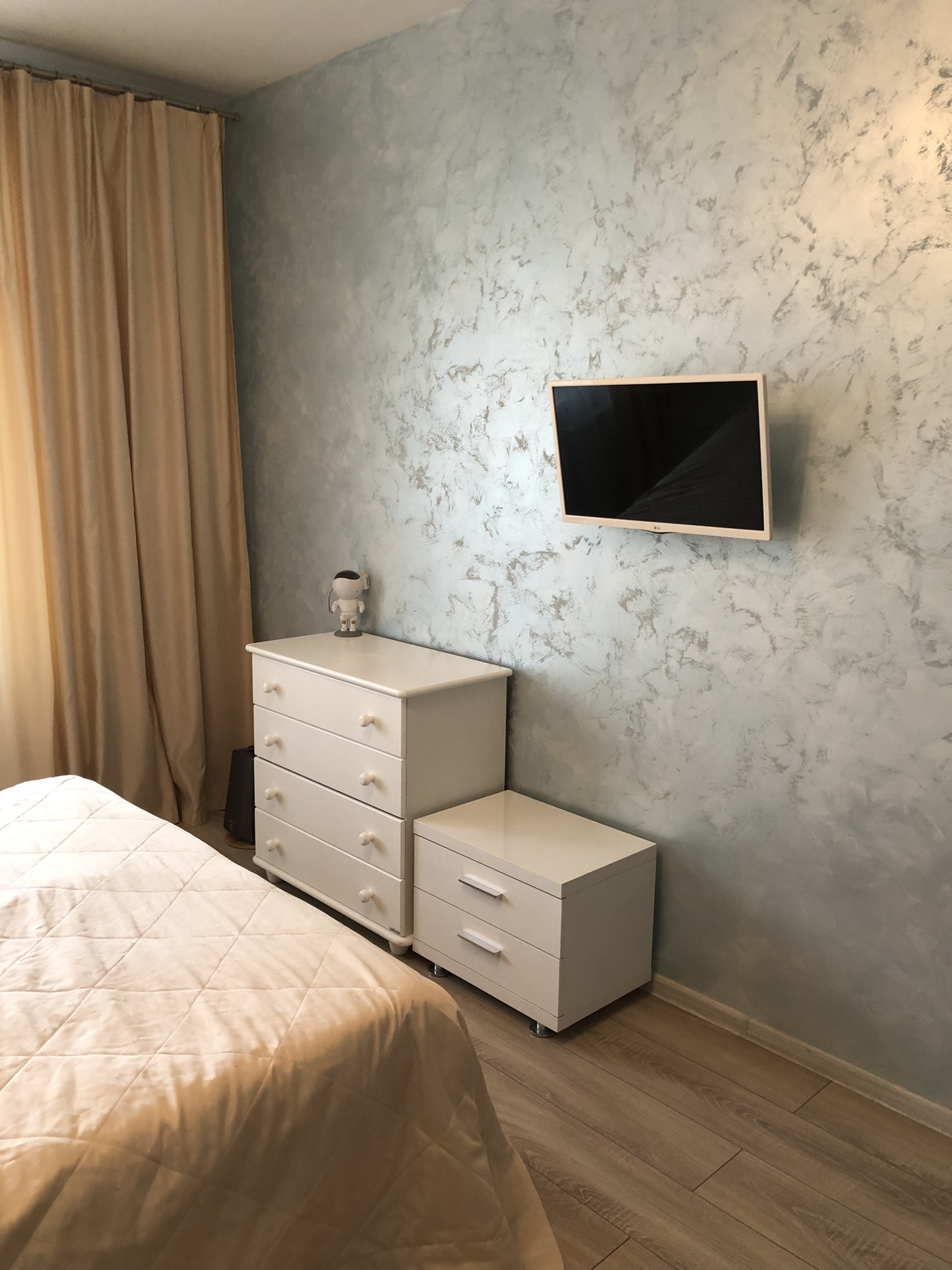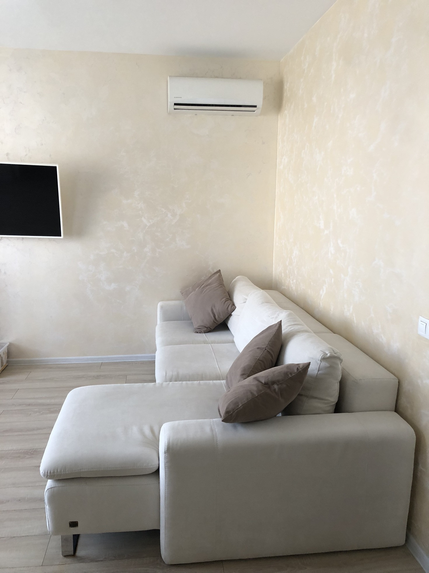 Квартира теплая и светлая, выполнен свежий,современный и качественный ремонт. Материалы использованы дорогие,делали «для себя». Сделана шумоизоляция боковых стен. Имеется кондиционер. На полу кафельная плитка,ламинат. Стены - декоративная штукатурка (фото не передает всю красоту,вживую смотрится очень интересно).