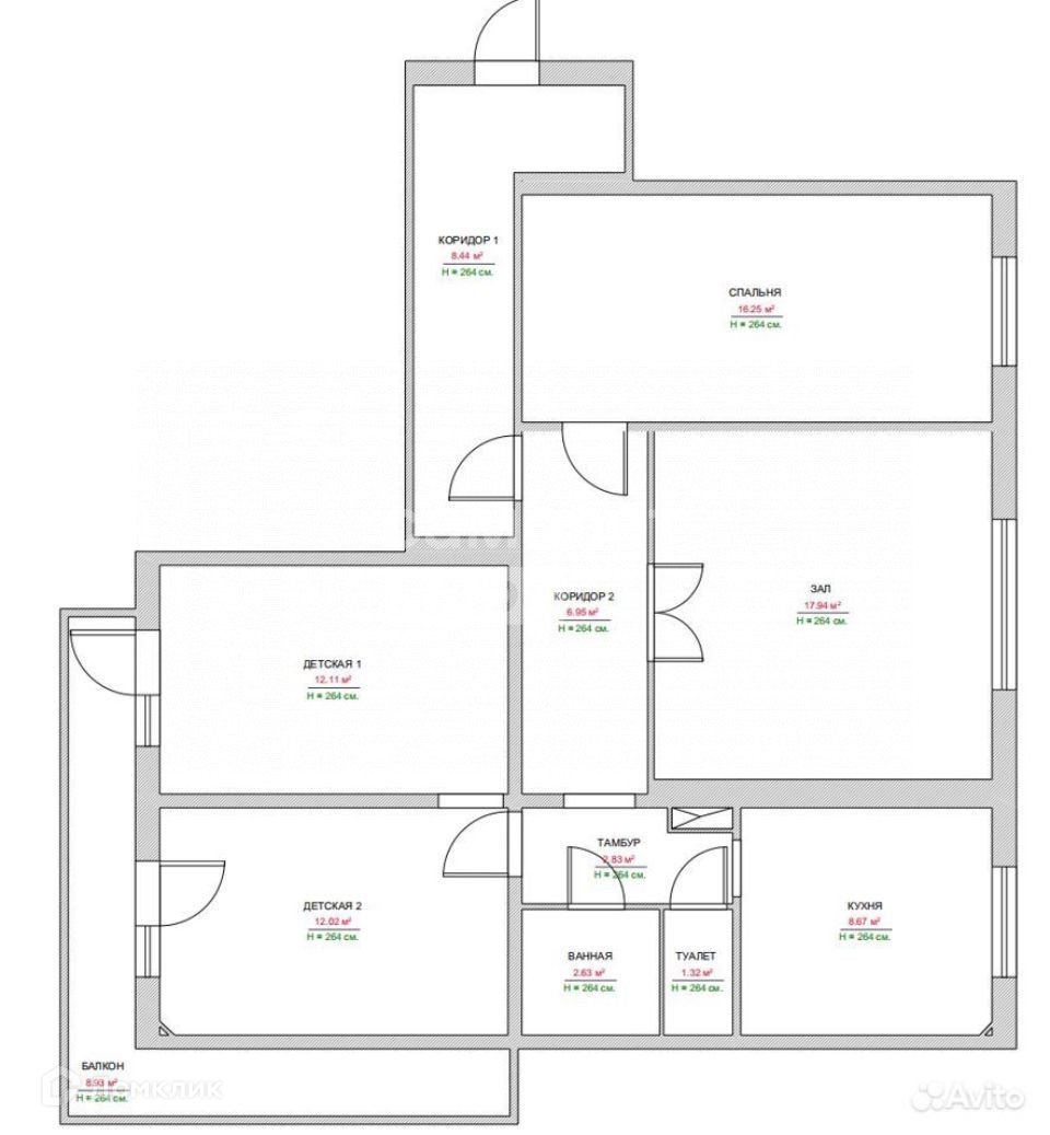 - кухня, 4 комнаты, раздельный санузел, балкон.