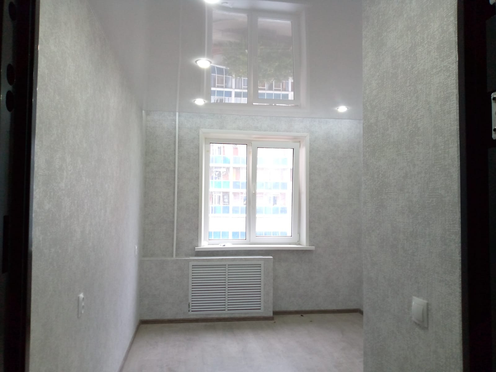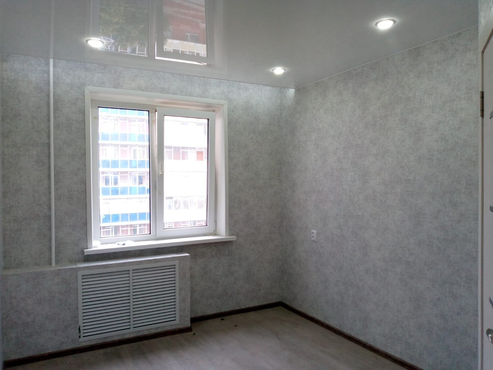Освящение 5-ти режимное, можно выбрать свет именно там, где он вам нужен. Натяжной потолок, на стенах обои в приятных для глаз тонах, окно ПВХ, на полу ламинат.