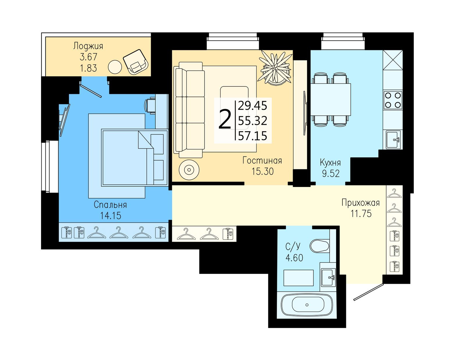 Общая площадь 57.3 м2