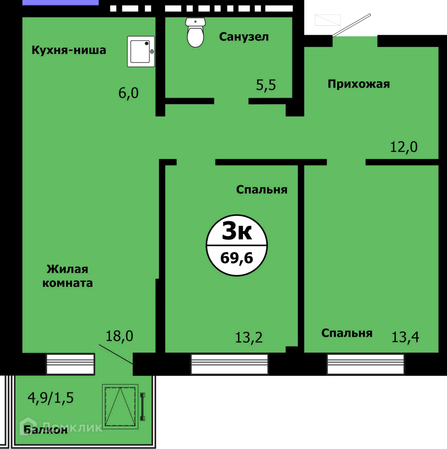 Общая площадь 69.6 м2