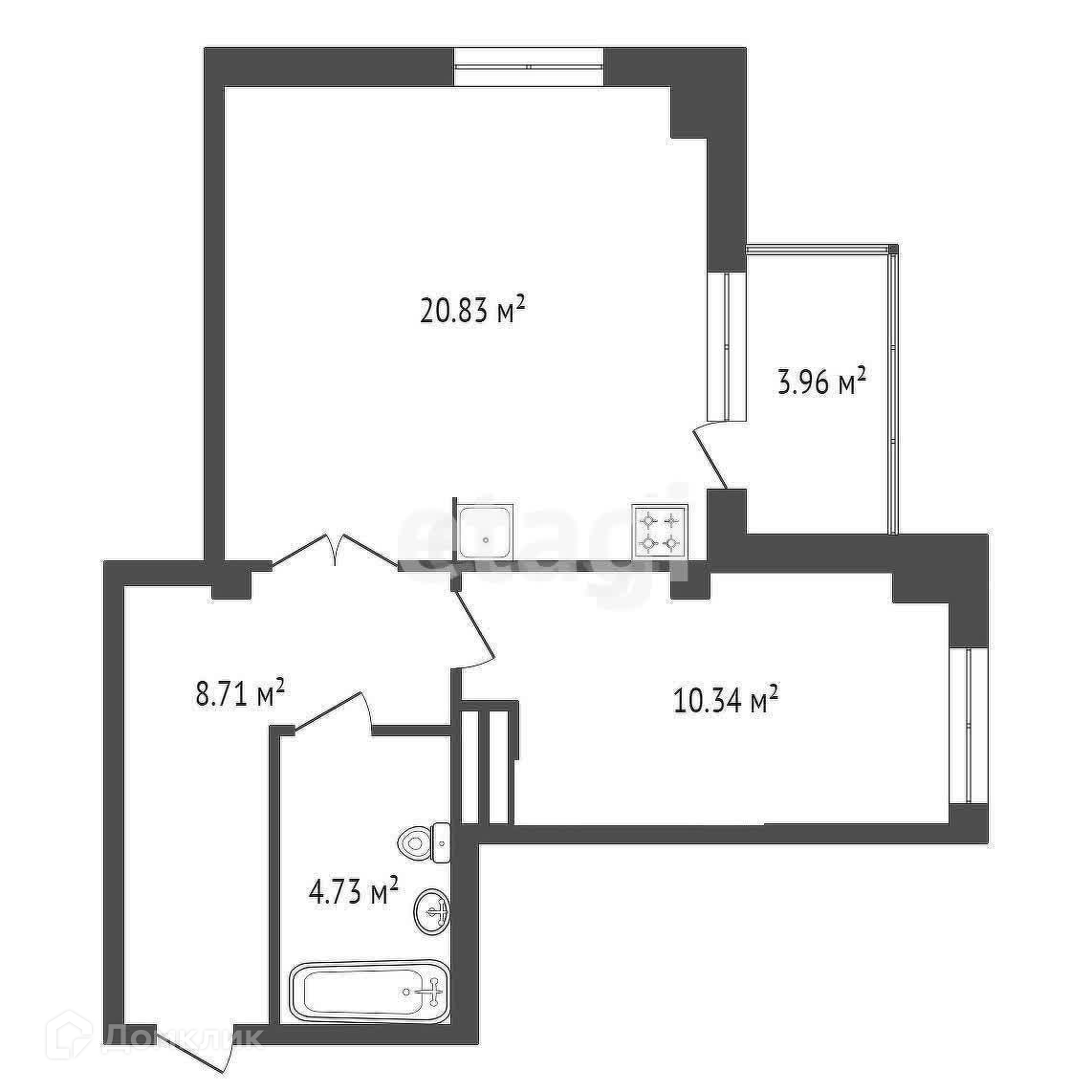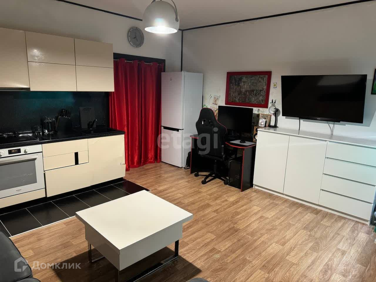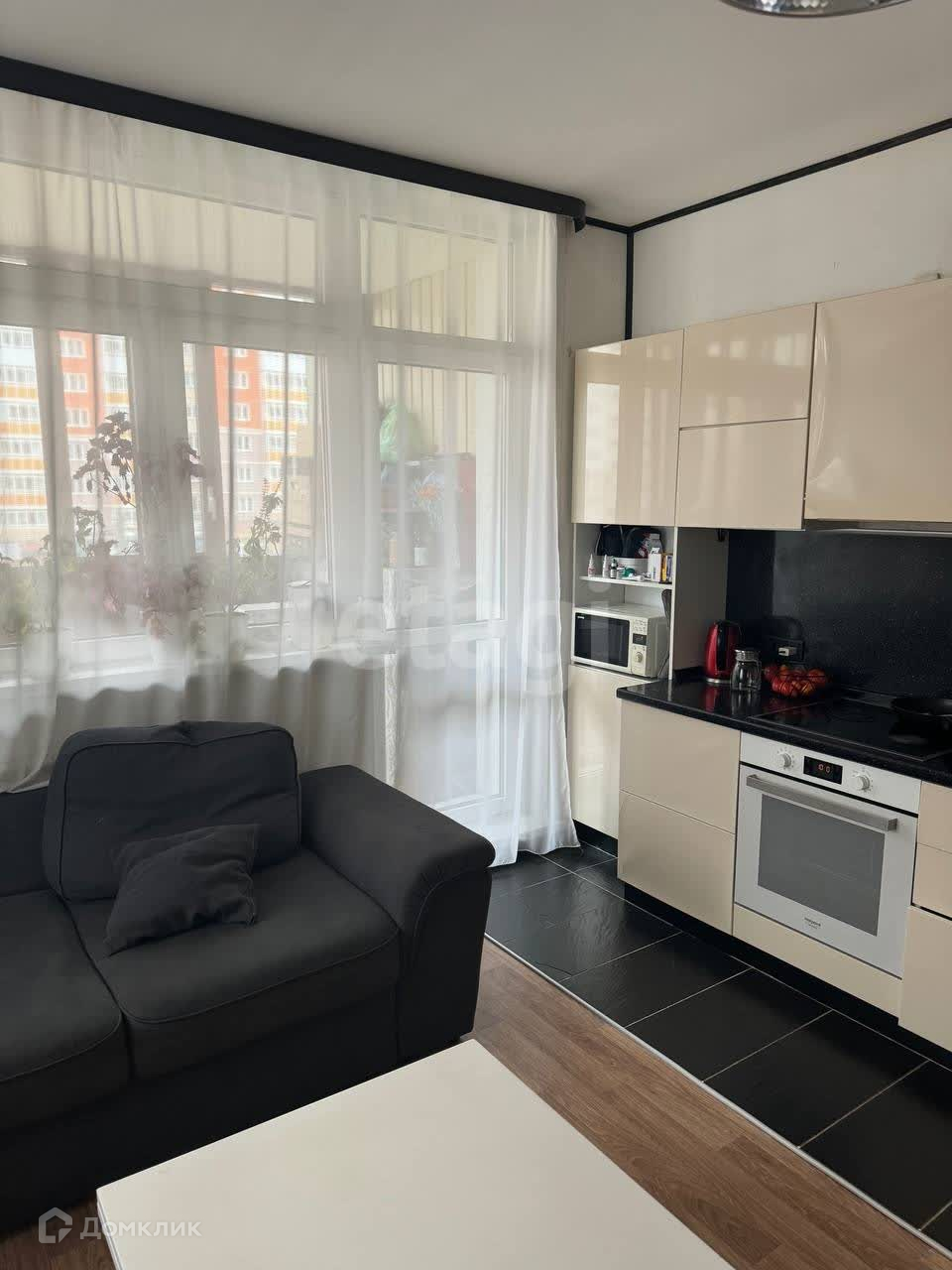 - просторная гостиная зона с объединённой кухней 21м2