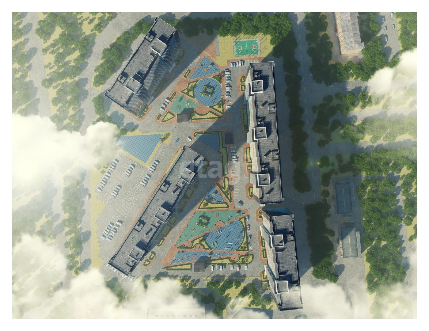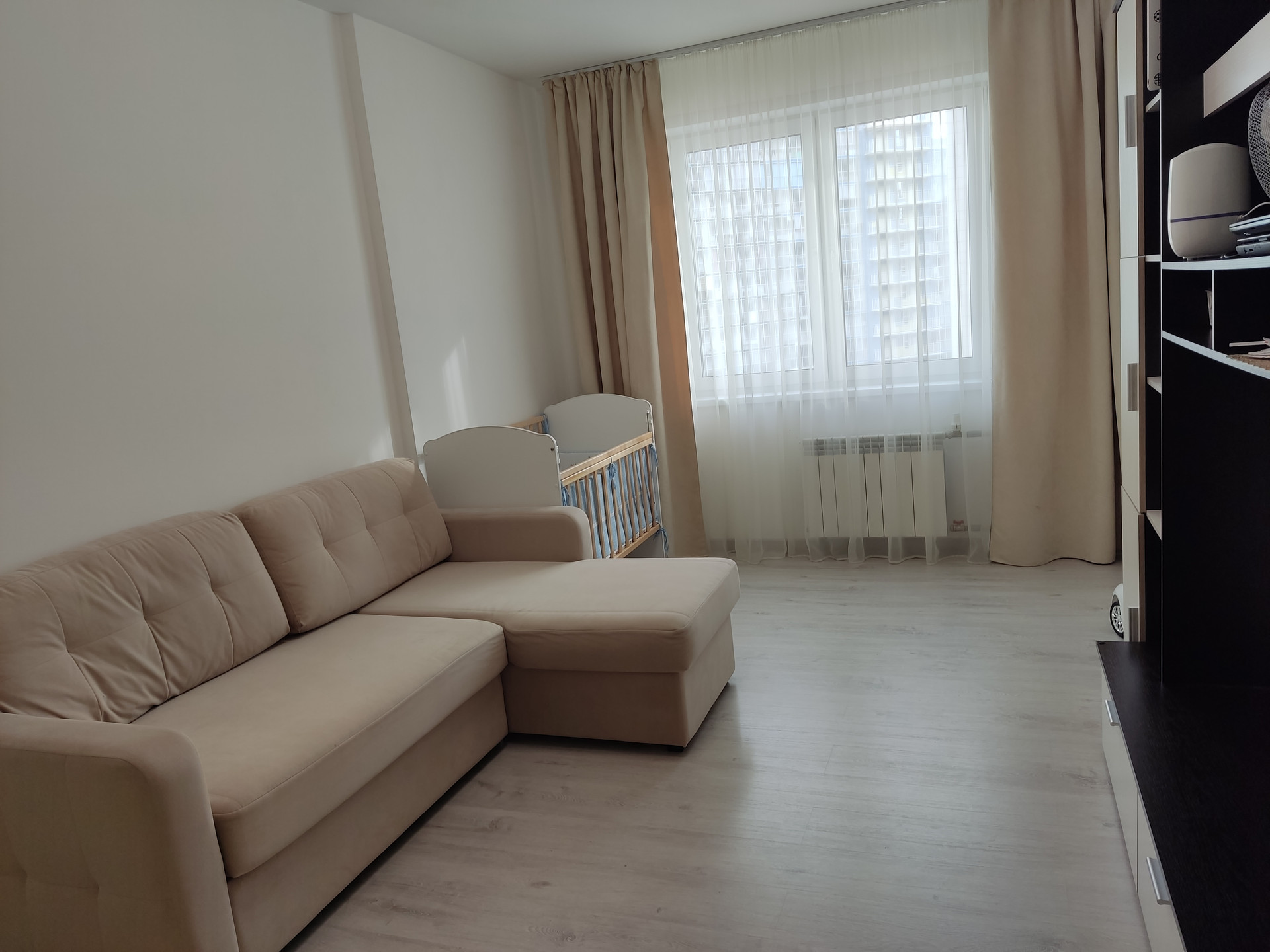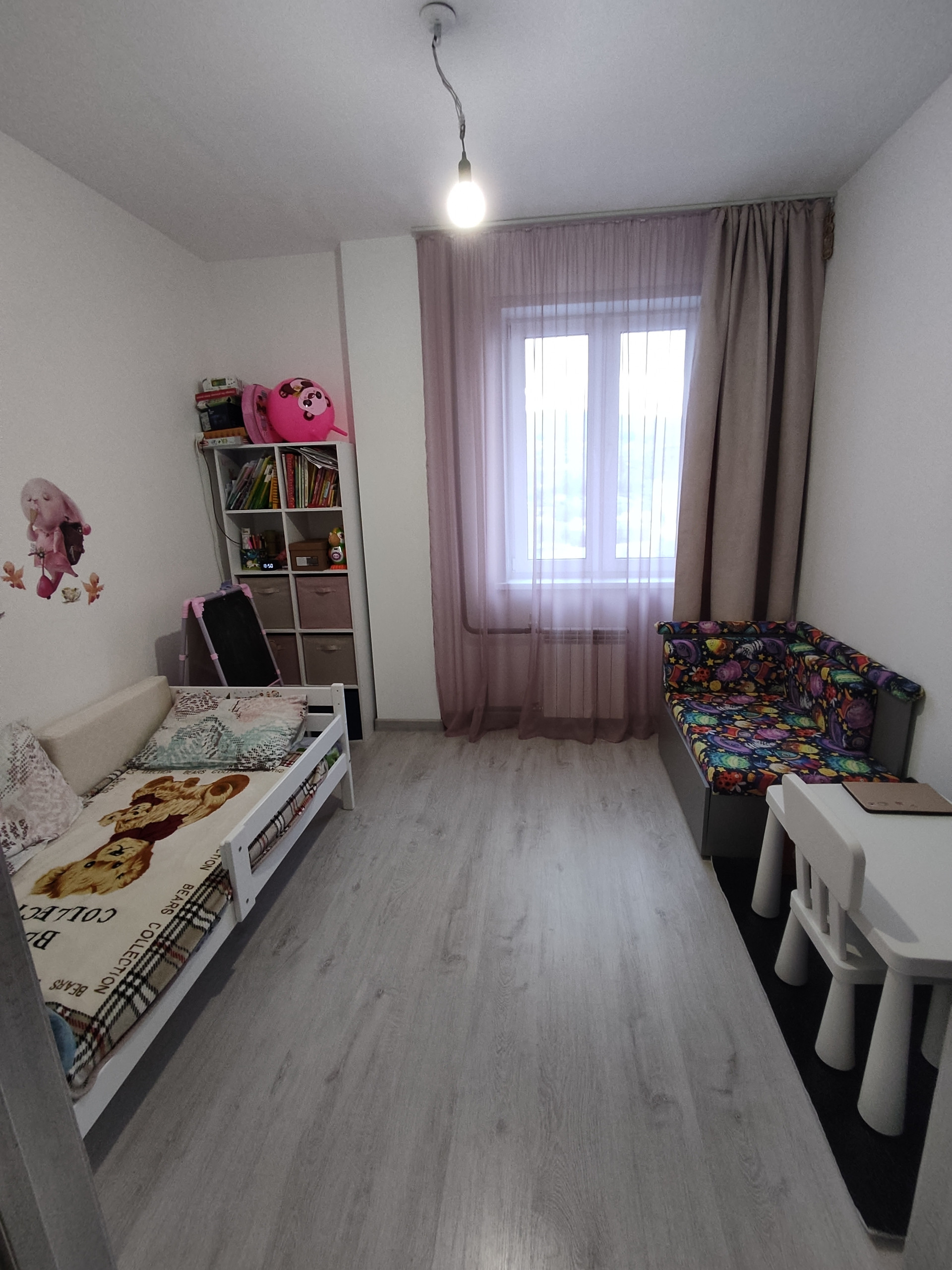 Расположение комнат на две стороны, что очень комфортно для проживания, из окна спальной комнаты открывается прекрасный вид на горы, а из других окон во двор на шикарную детскую площадку.