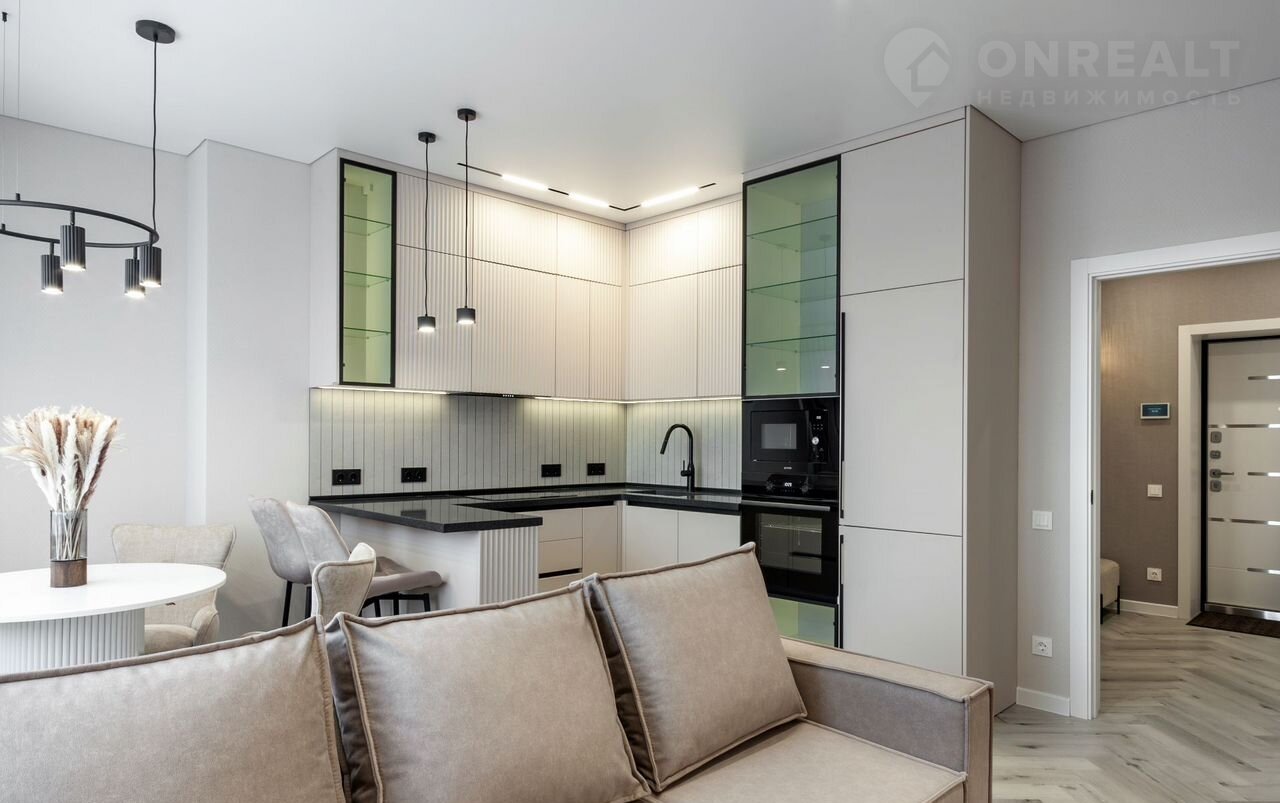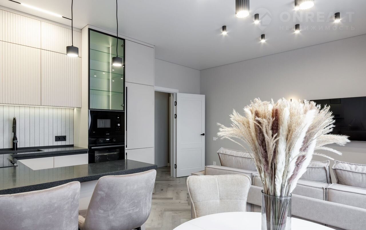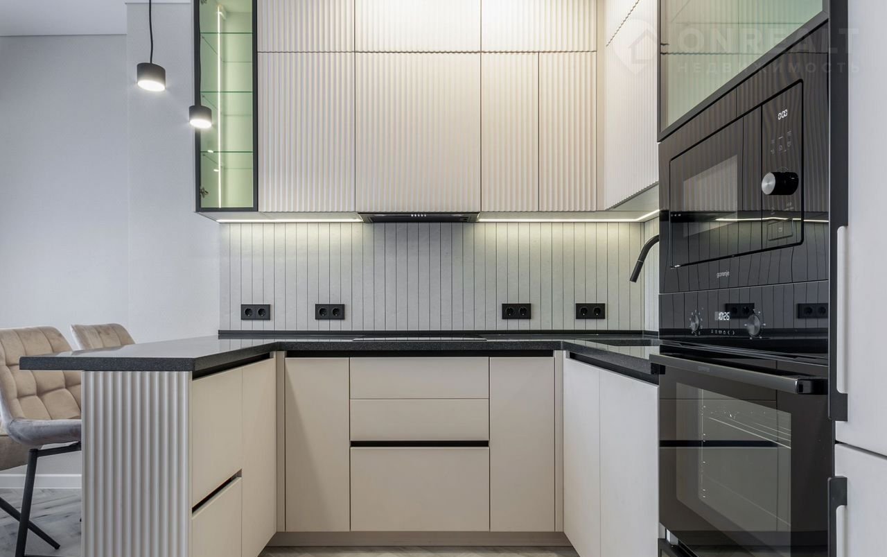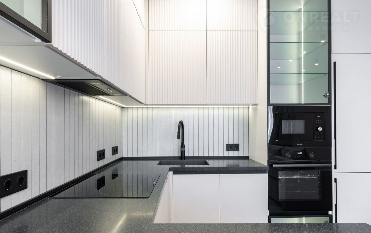 —Современная функциональная кухня с подсветкой рабочей зоны и стеклянных витрин оснащена каменной столешницей с литой мойкой, барной стойкой, немецкой фурнитурой вмещает в себя также встроенную брендовую технику Gоrеnjе-холодильник, посудомоечную машину, СВЧ, духовой шкаф, вытяжку, варочную панель.