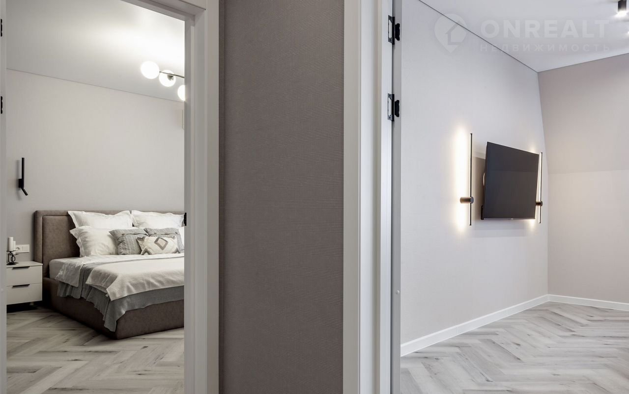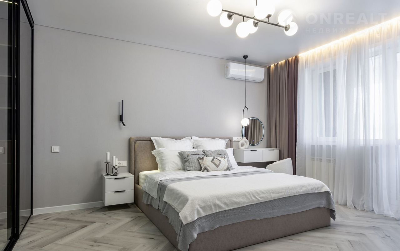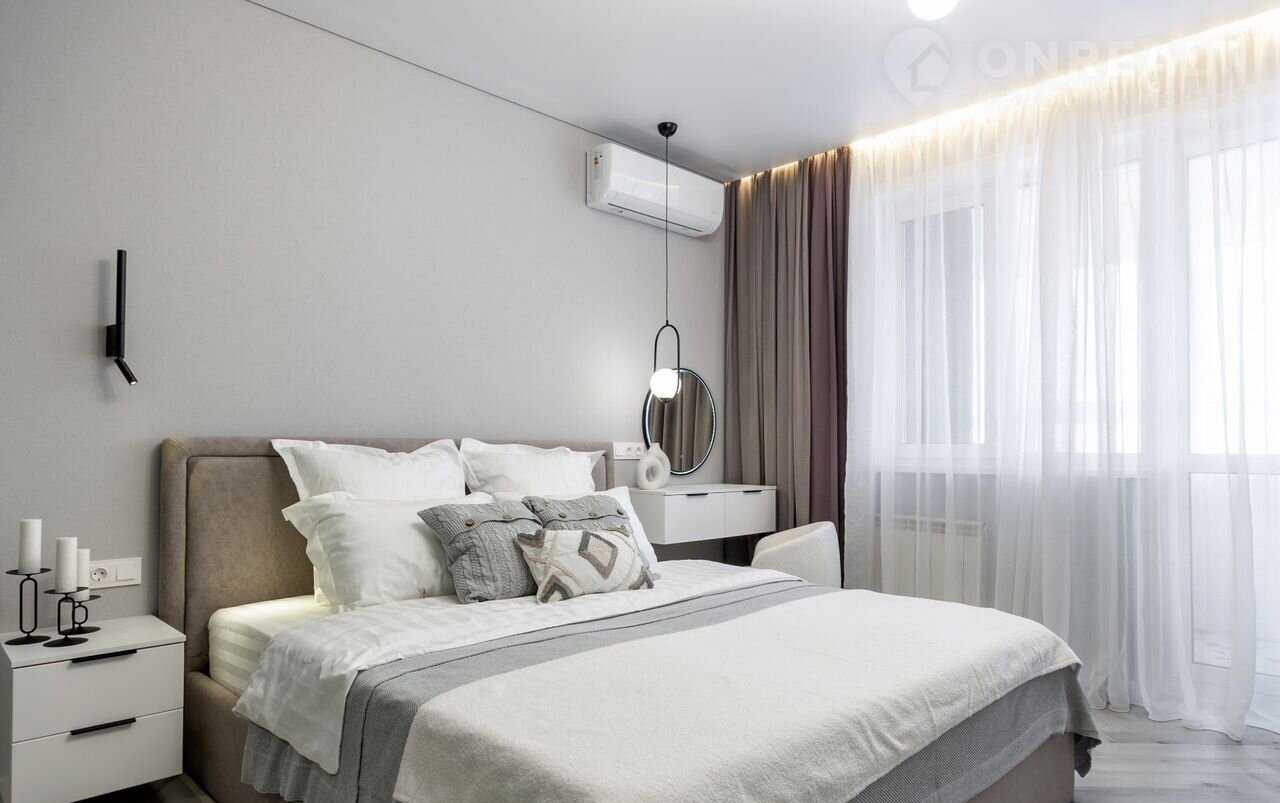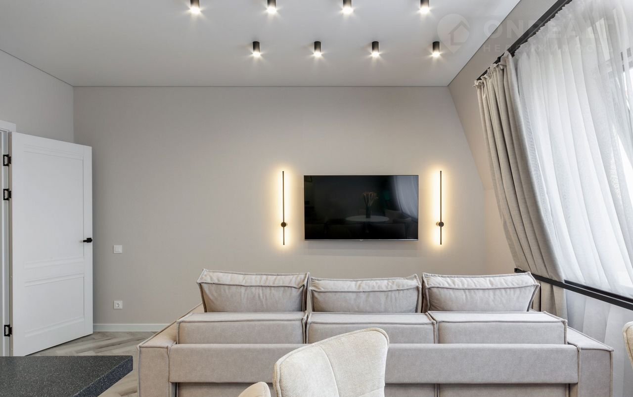 —Во всей квартире натяжные потолки класса "премиум" со встроенными светодиодными светильниками, настенными светильниками, магнитными трекинговыми системами, диодными подсветками на карнизах, что создает безусловно уютную атмосферу в квартире