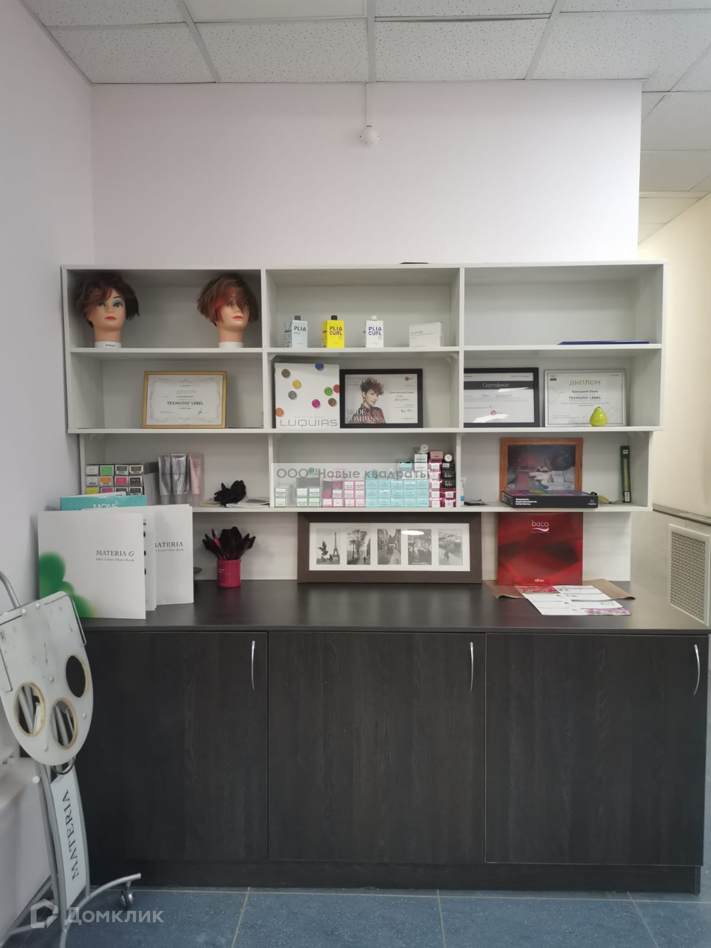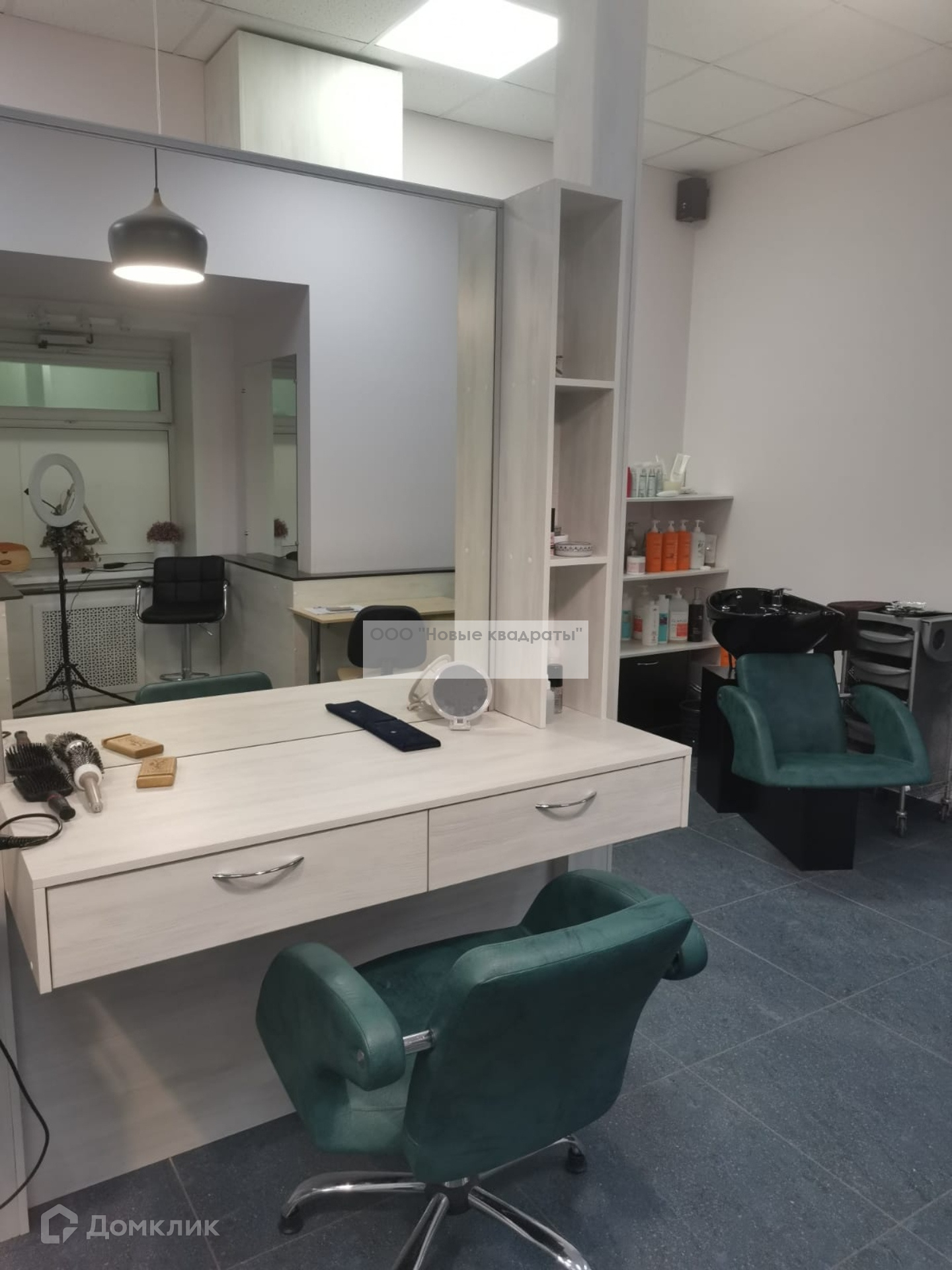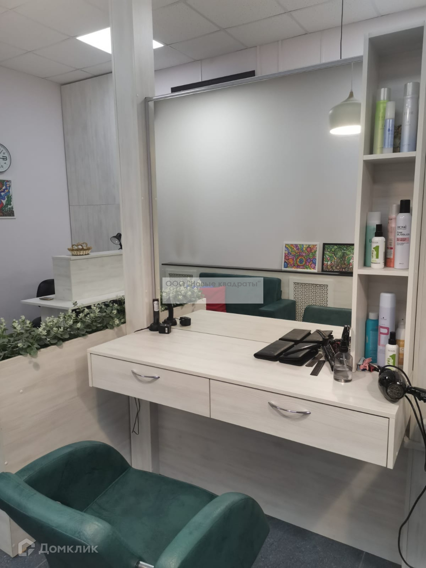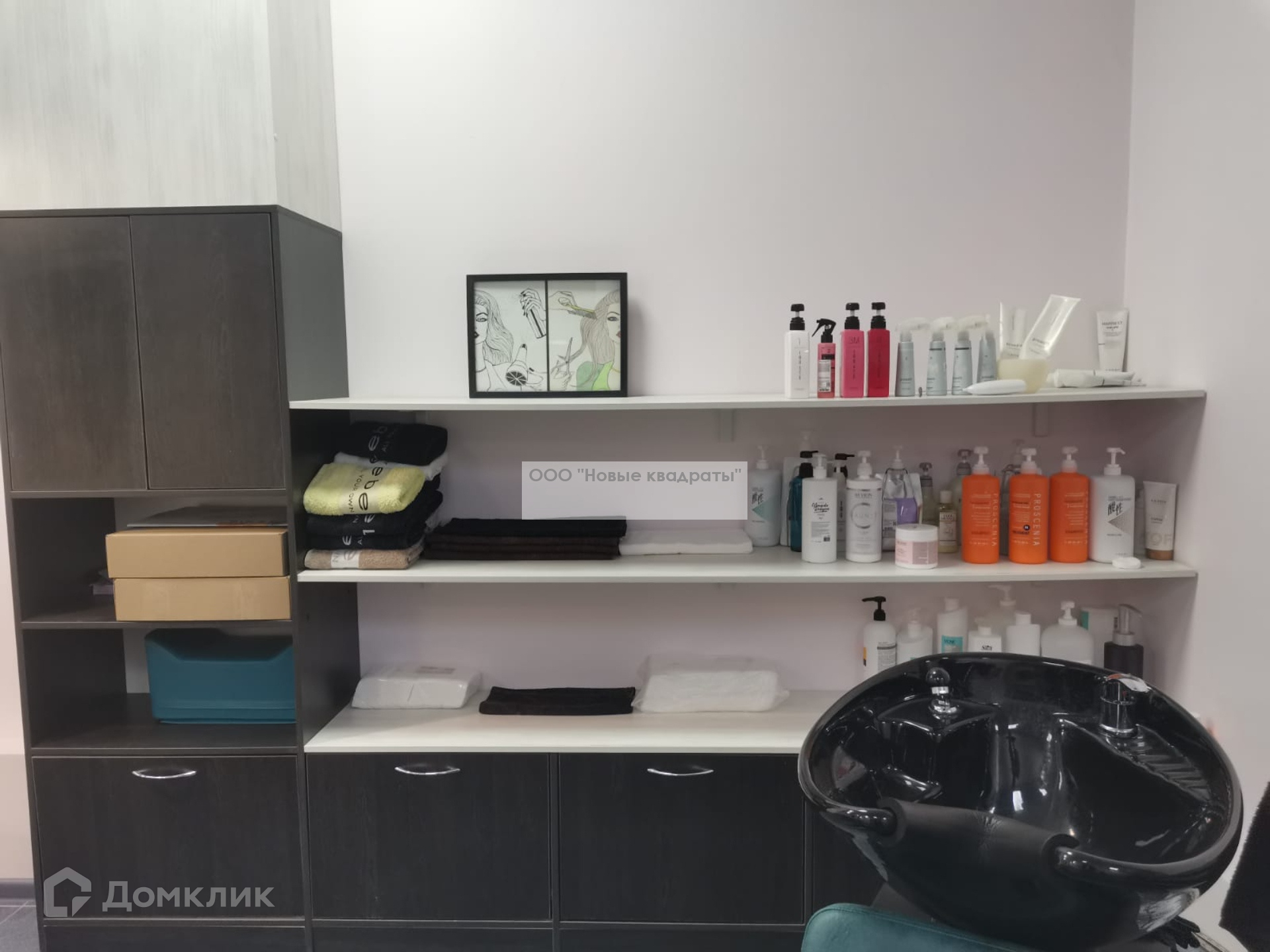 Также в помещении есть небольшая кухня (микроволновка, установлены профессиональные ящики для мастеров с замками, стиральная машина).