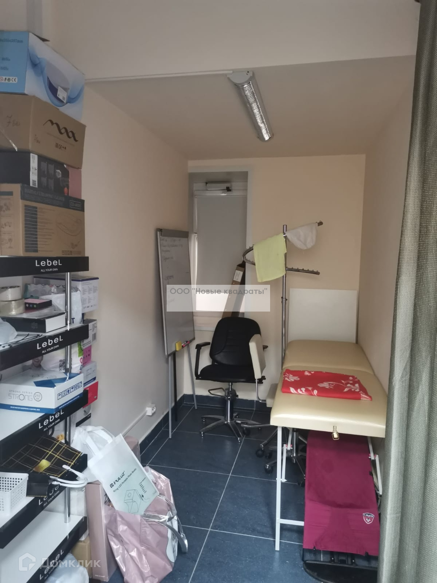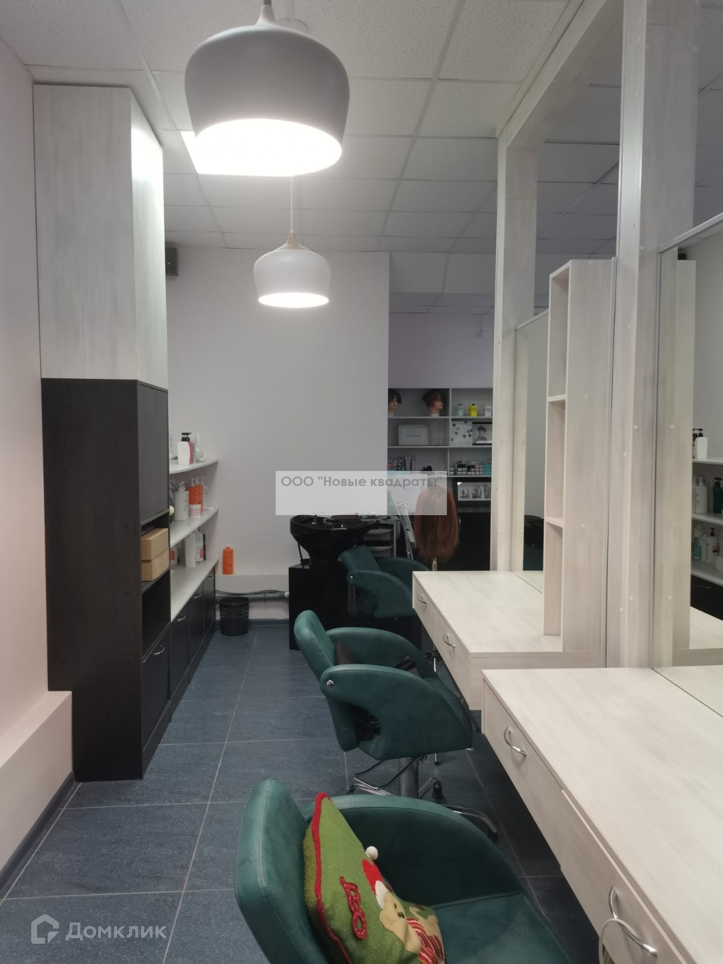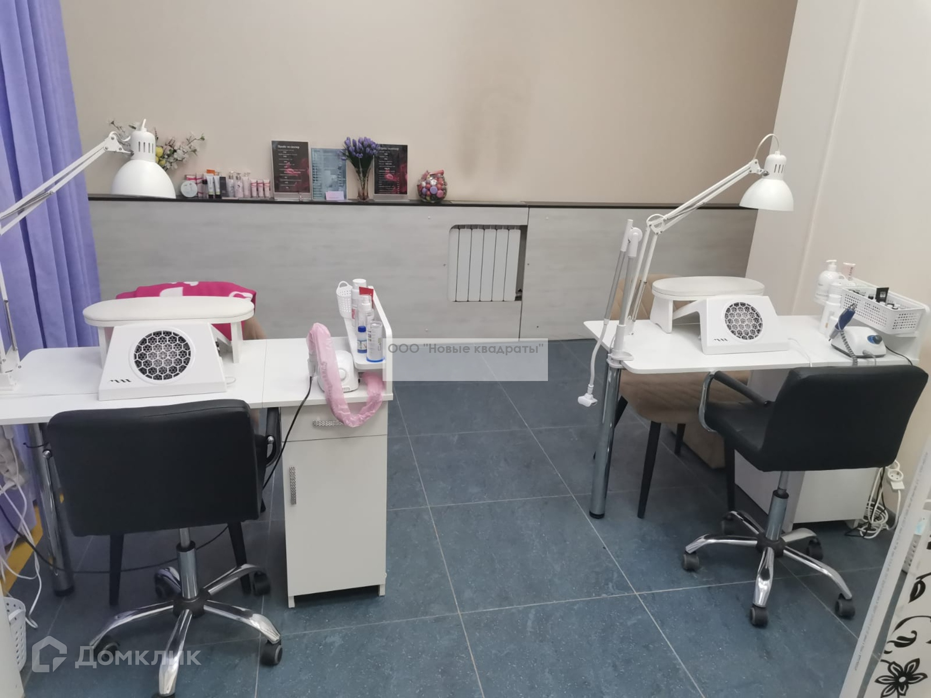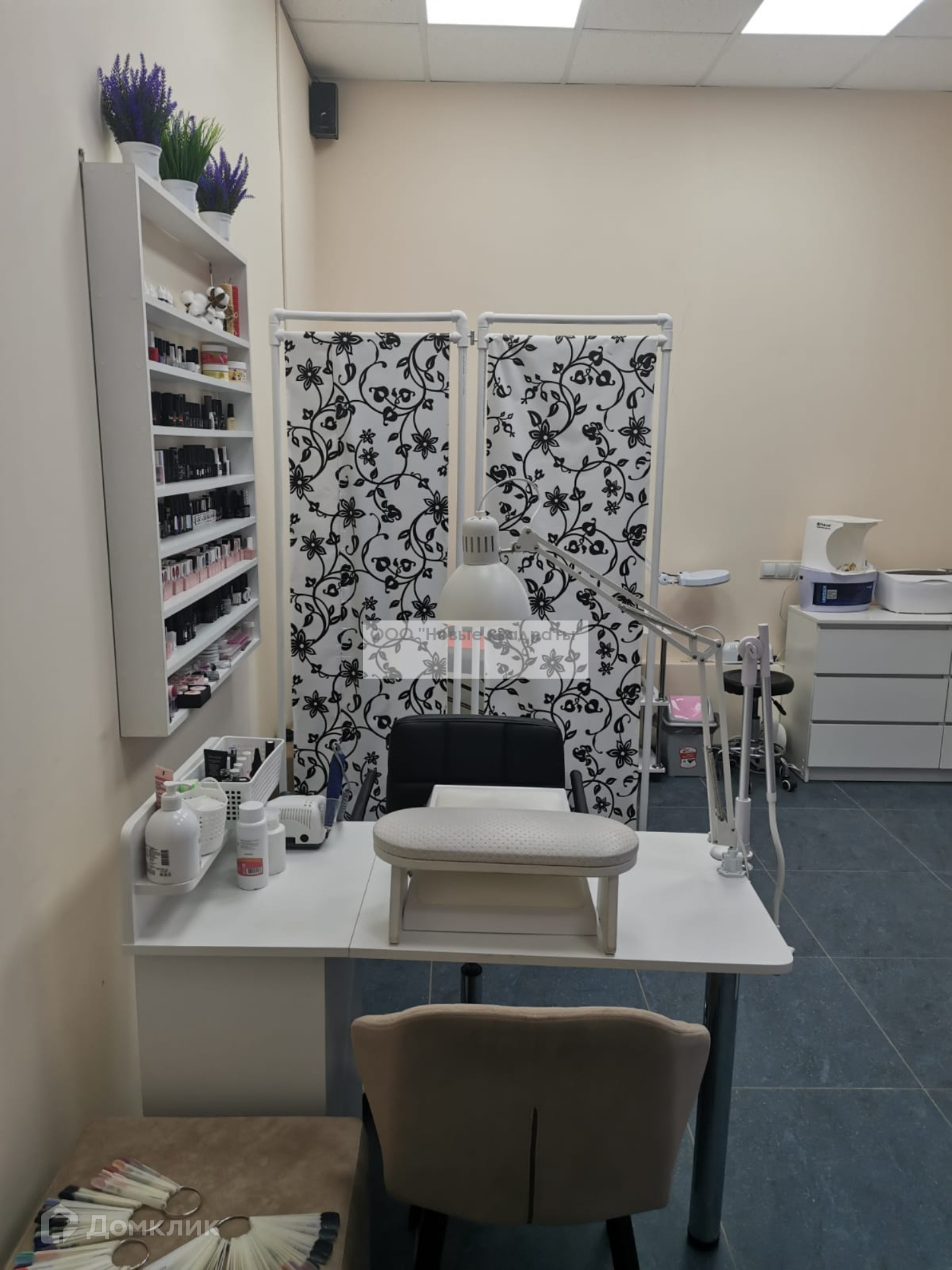Также в помещении есть небольшая кухня (микроволновка, установлены профессиональные ящики для мастеров с замками, стиральная машина).