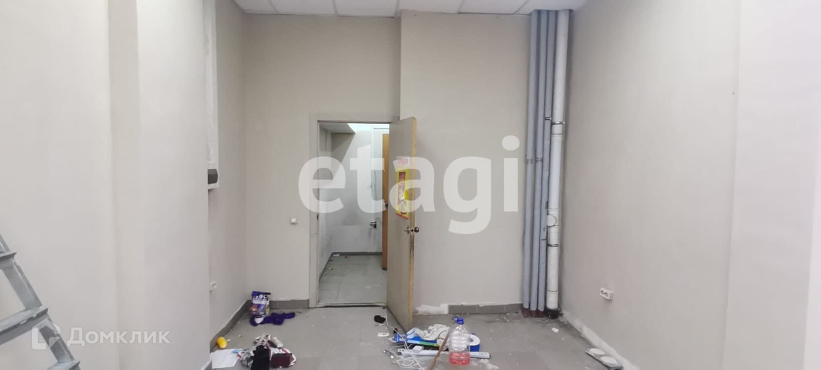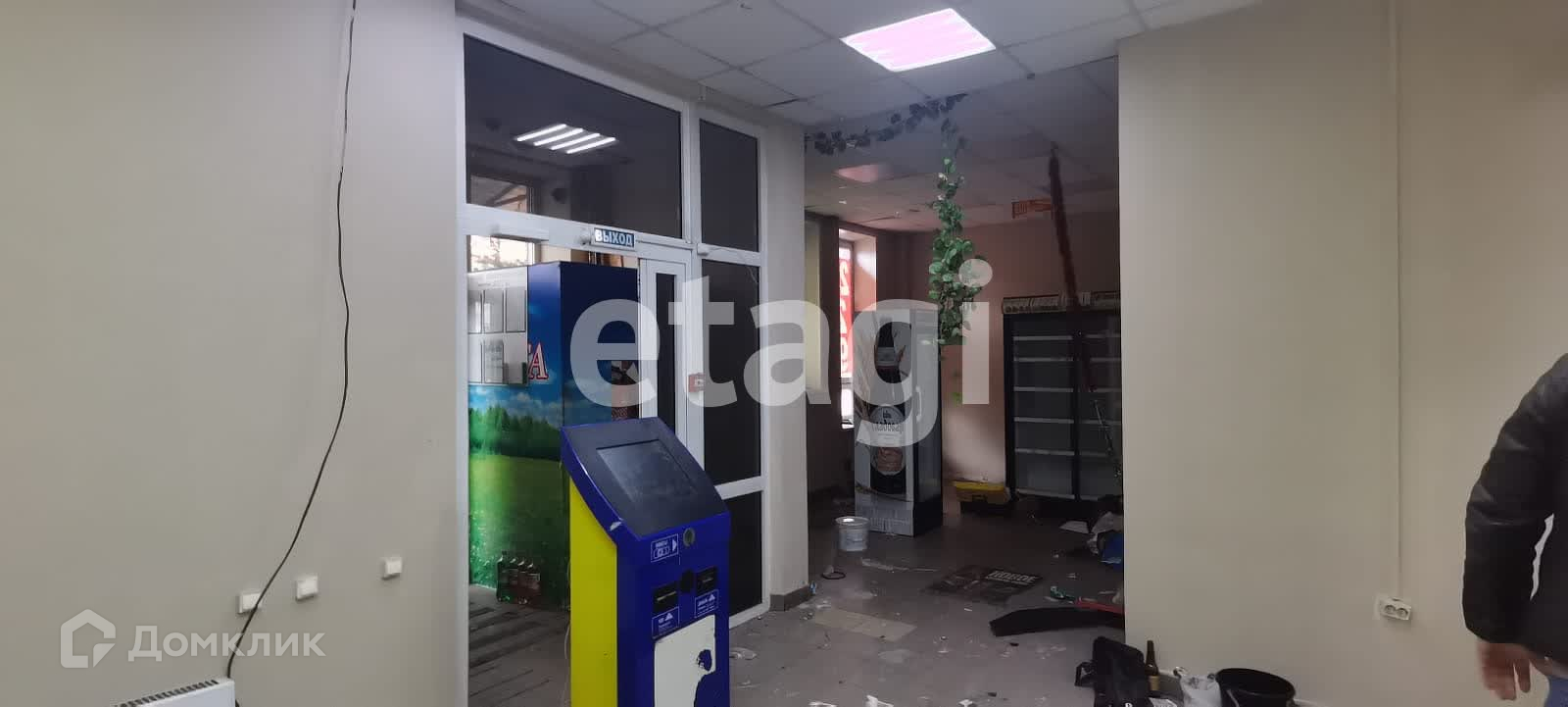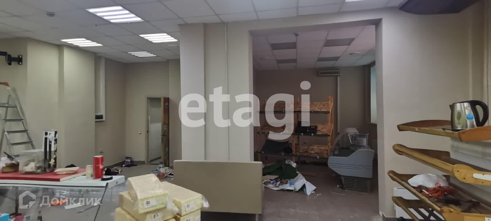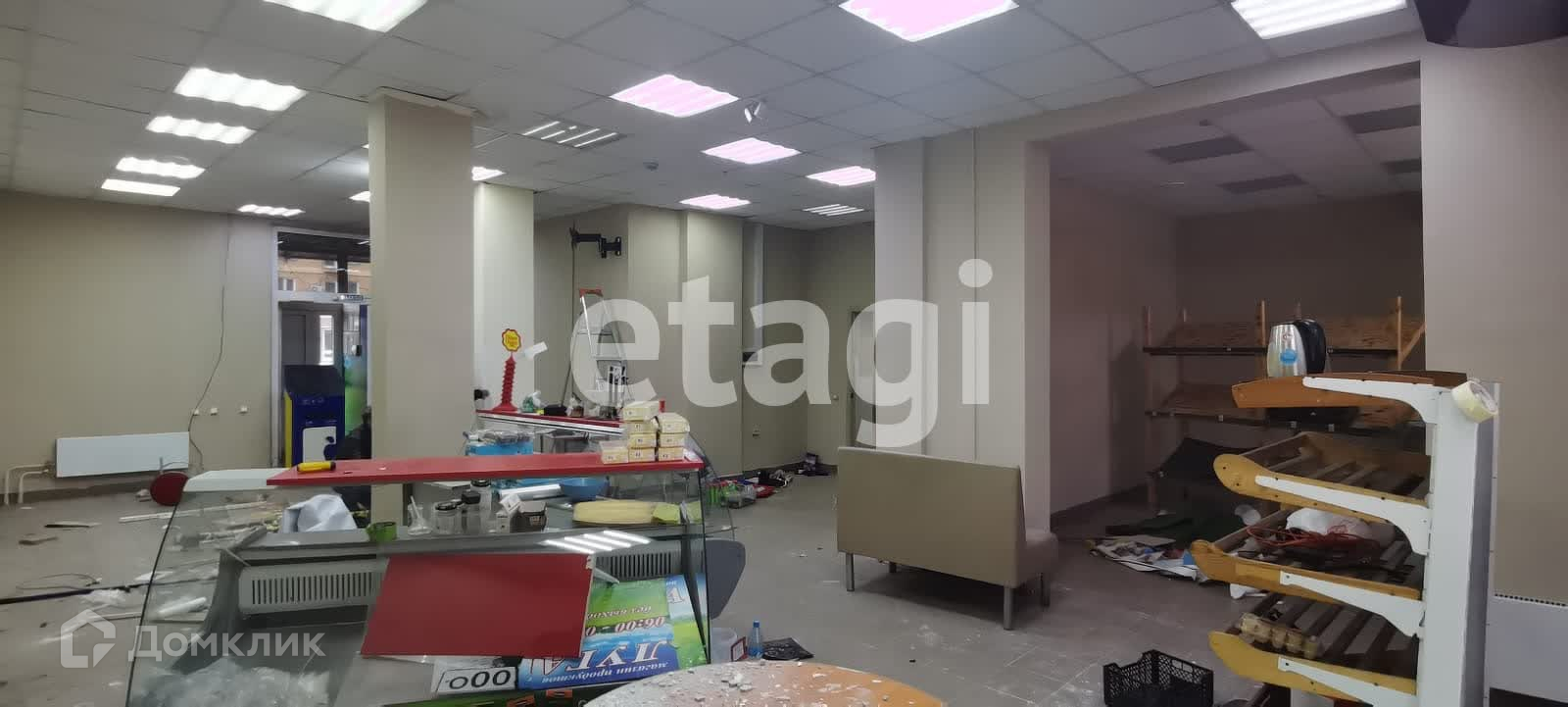 Два отдельных входа, три мокрые точки, на полу керамогранит, подвесной потолок типа Армстронг, стены окрашены. есть возможность разделить на два отдельных помещения с отдельными входами и своими санузлами.