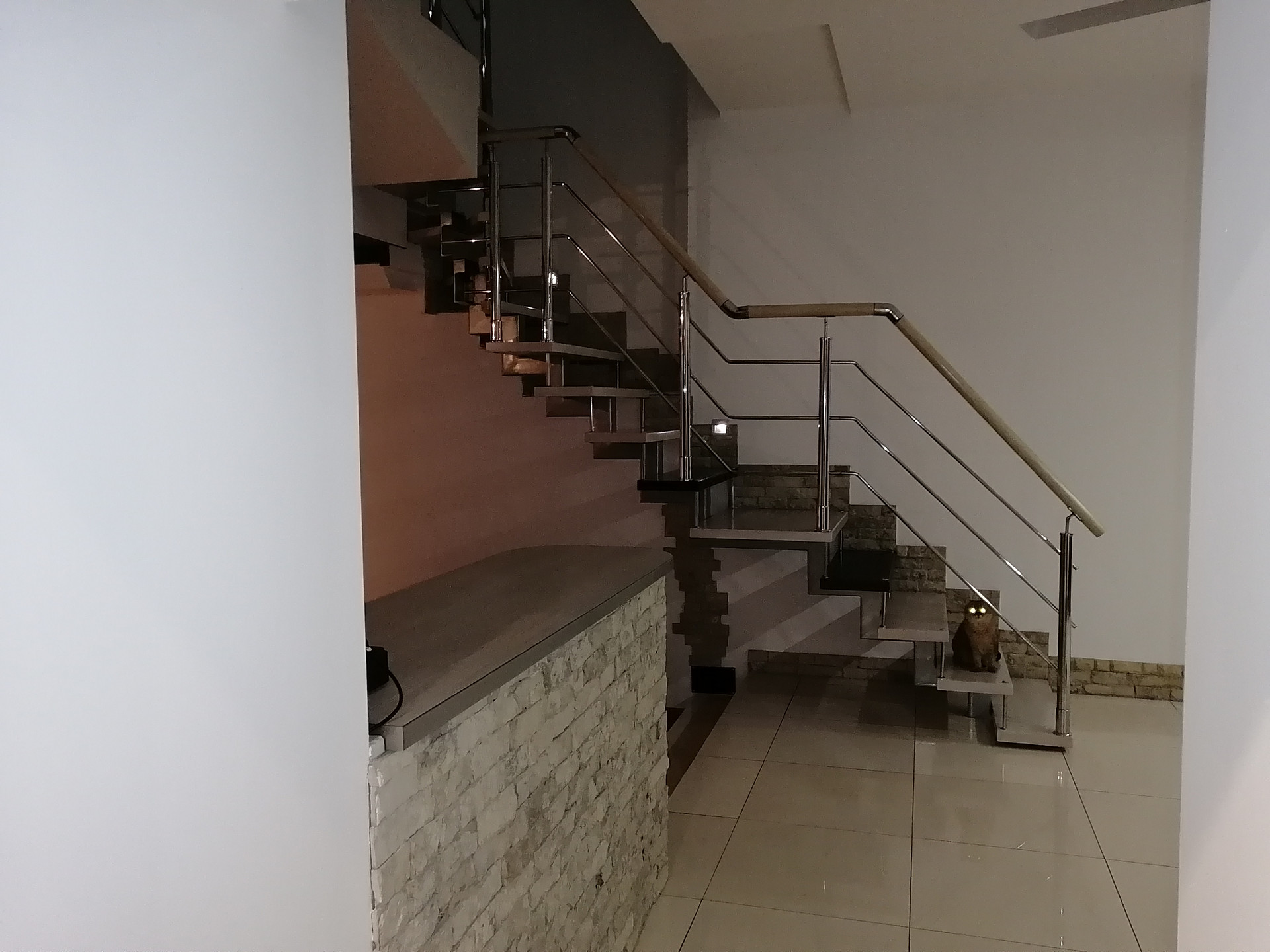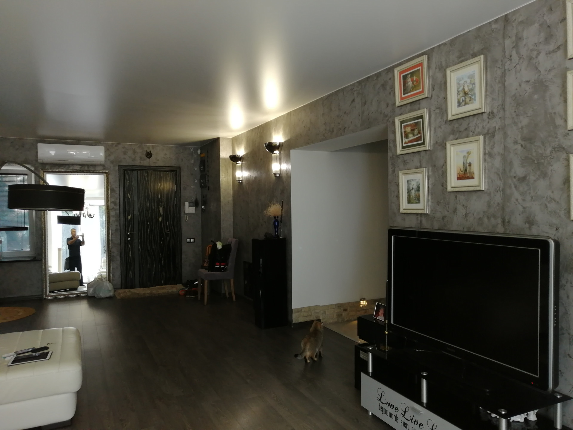 потолки - многоуровневые со светильниками, пол - ламинат, керамогранит, стены - обои, декоративная штукатурка.