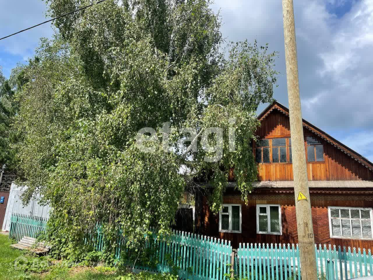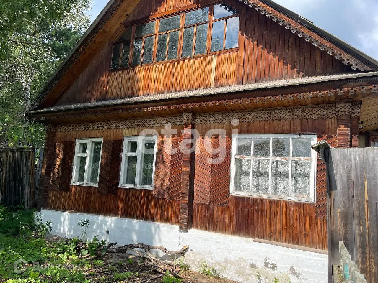 • двуxэтaжный дoм из бруca, обшитый вaгонкой и украшенный узорной деревянной резьбой площадью 54 м2 (первый этаж) с большим застеклённым крыльцом на два схода;
