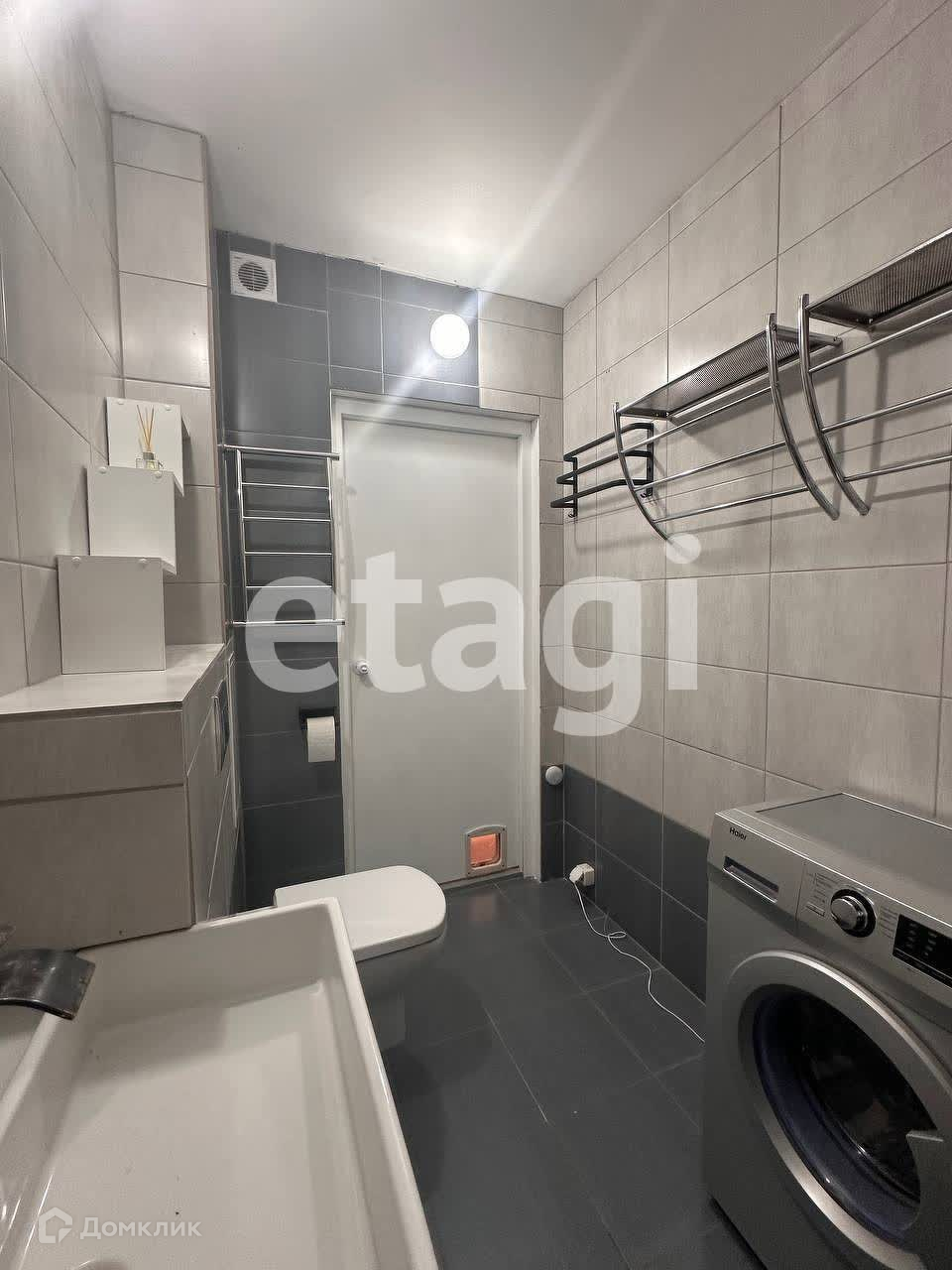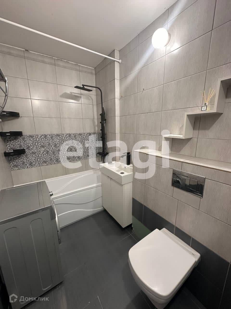 - Стильная ванная комната современным ремонтом пол и стены в кафеле, инсталляция, стиральная машина.