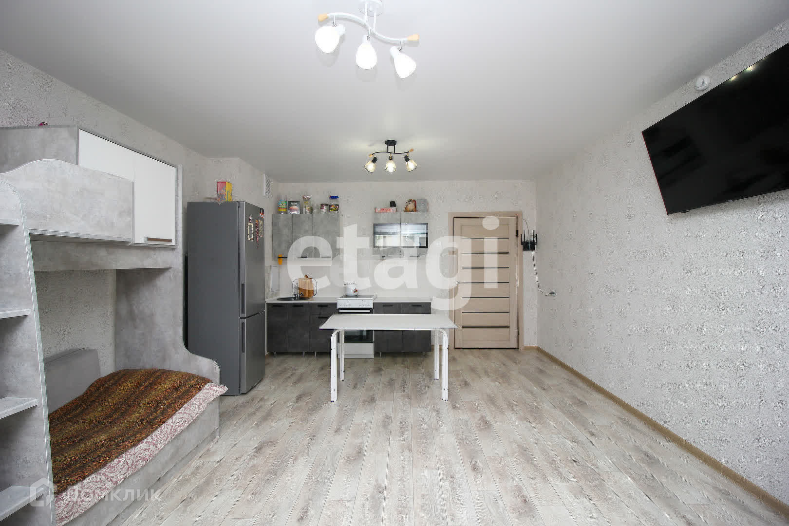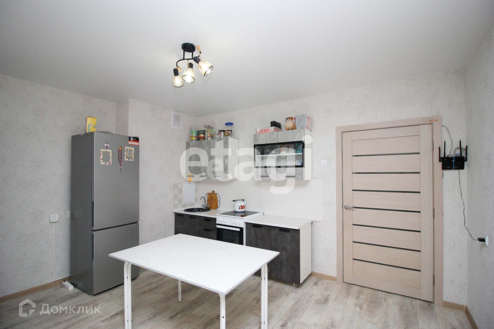 Квартира с современным ремонтом в светлых тонах: натяжные потолки, обои на стенах и линолеум на полу. Пластиковые окна обеспечивают отличную шумоизоляцию. Совмещенный санузел оформлен с натяжным потолком, покрашенными стенами и плиткой на полу. Лоджия, застекленная и выходящая из кухни-гостиной, добавляет уюта.