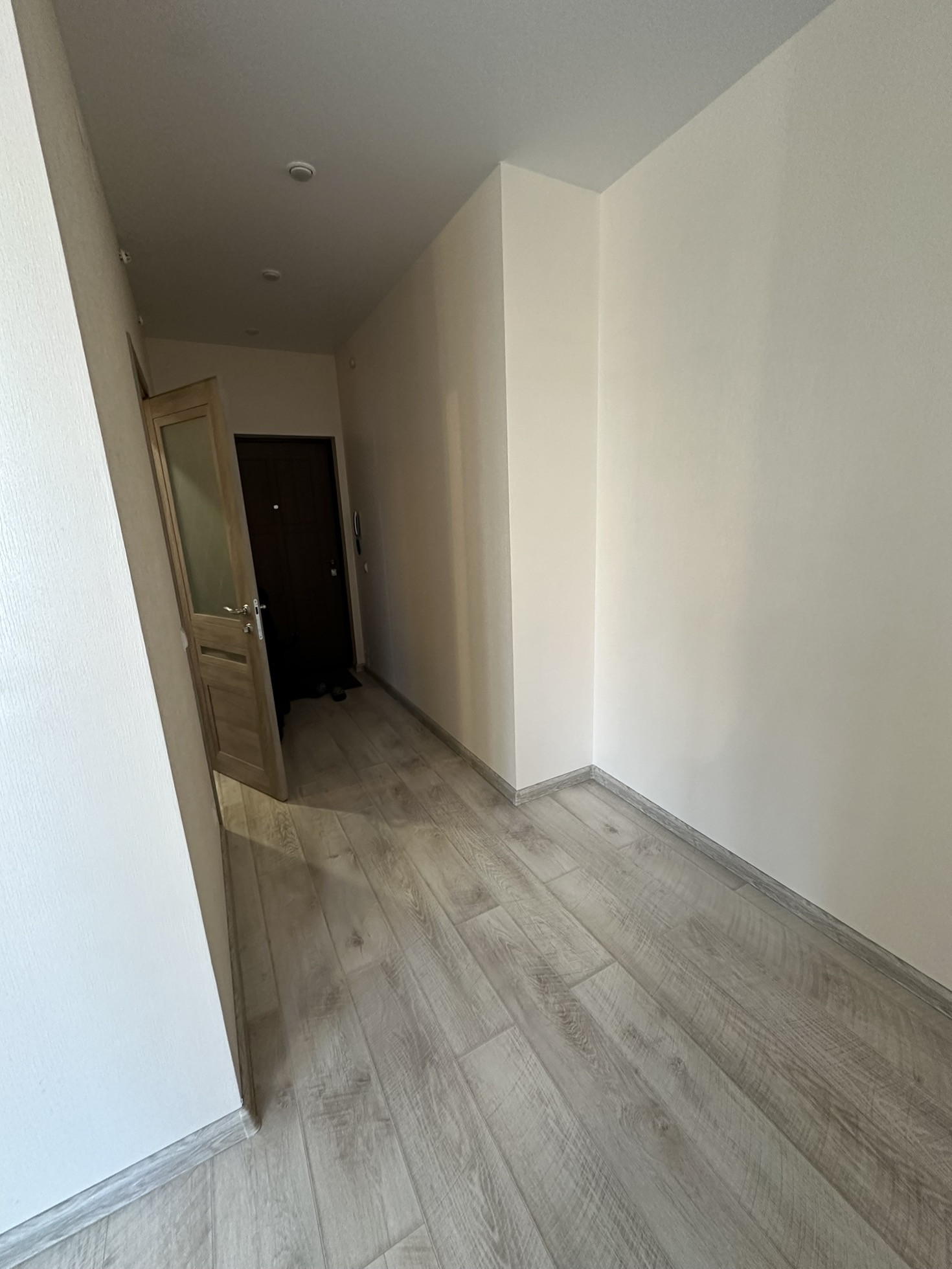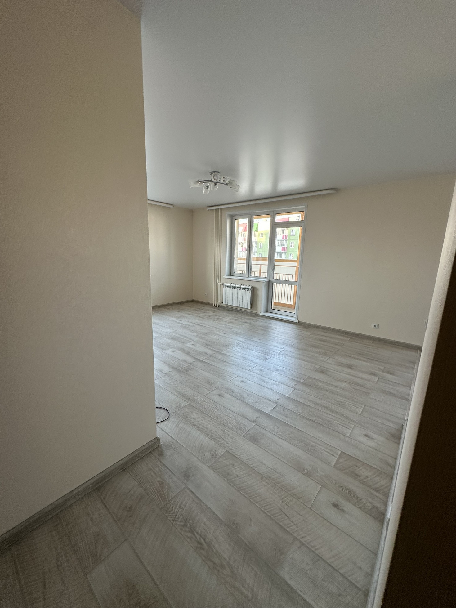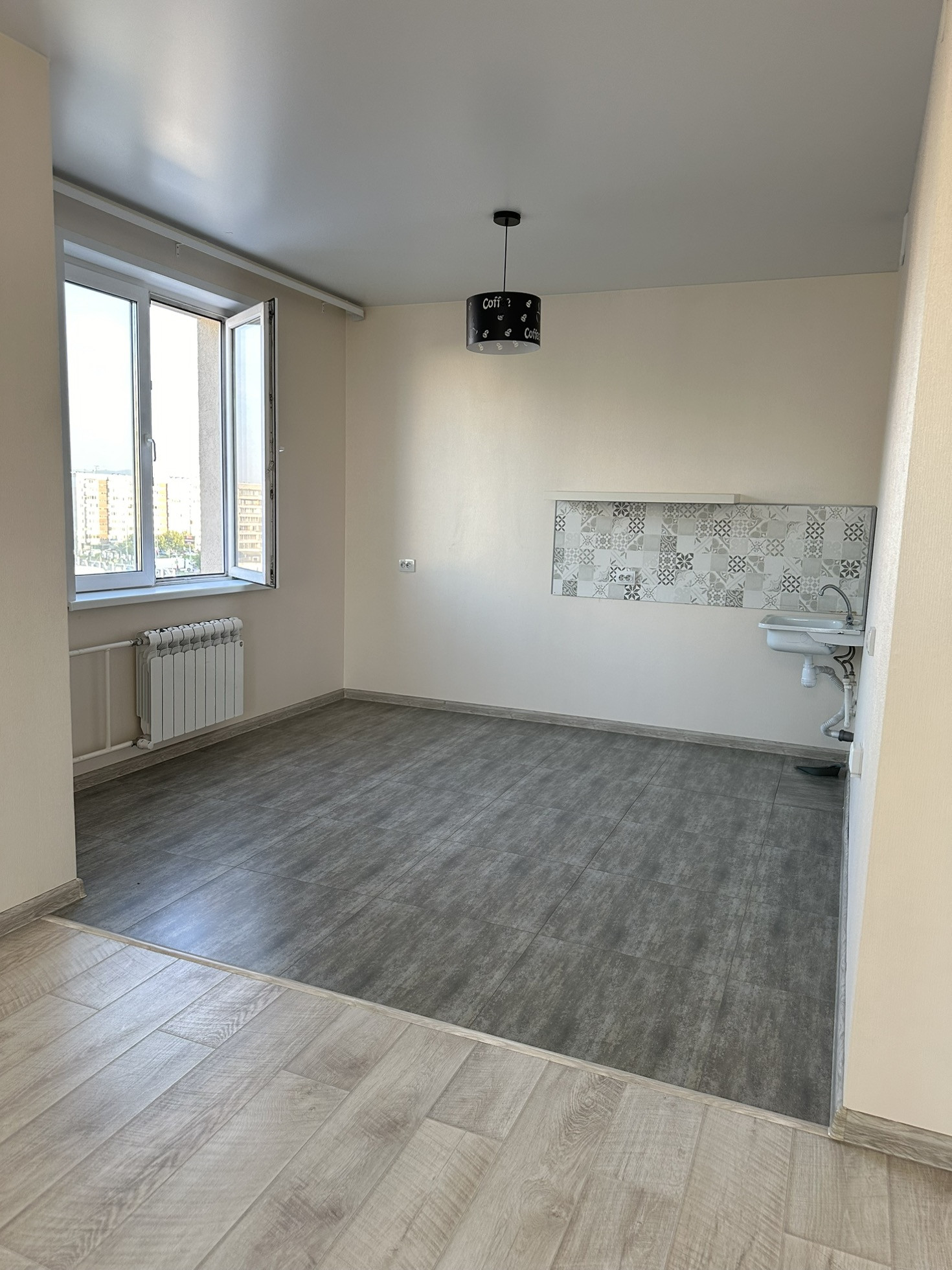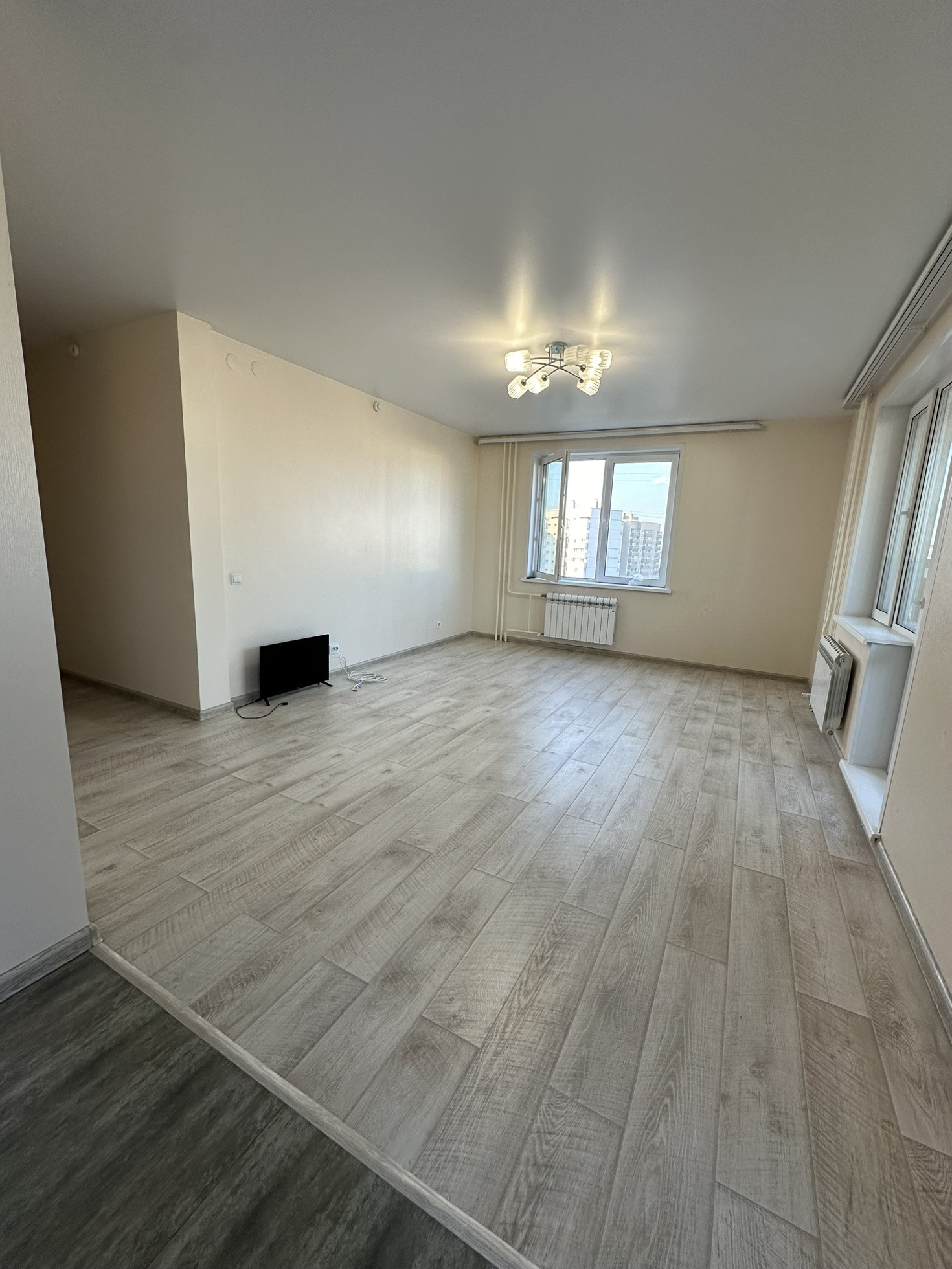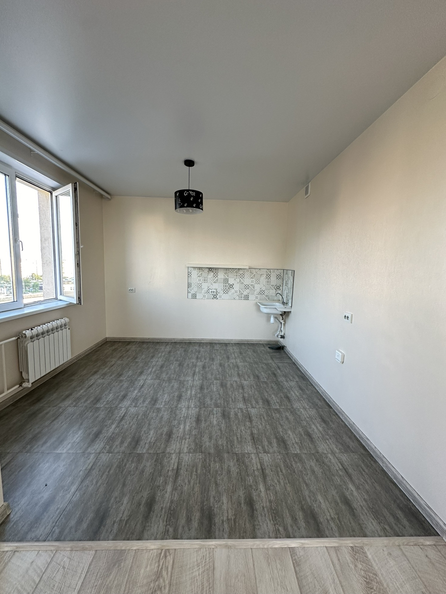 Натяжные потолки по всей квартире, дорогой качественный ламинат и в кухонной зоне  керамогранит.