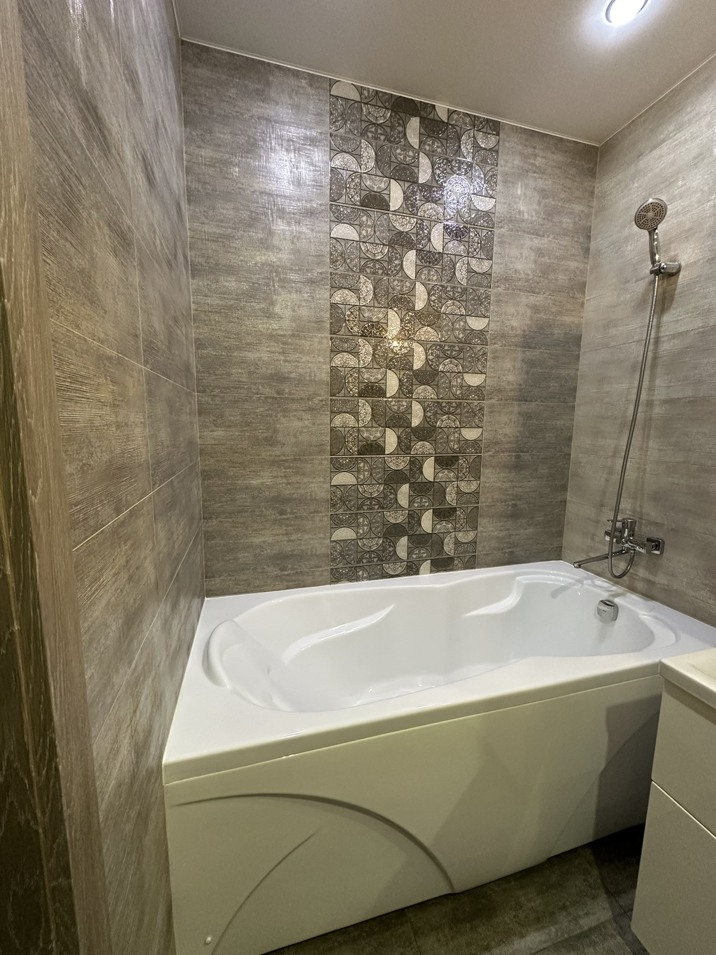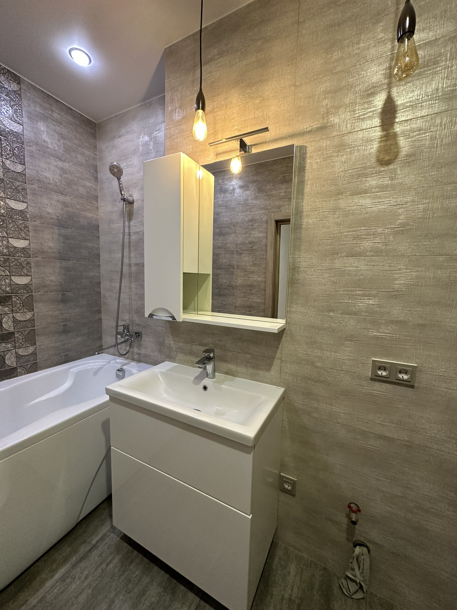 Ванная комната выложена дорогим красивым кафелем, в ванной комнате все необходимое( унитаз- инсталляция, ванная, комод, зеркало, раковина, вывод под стиральную машину).