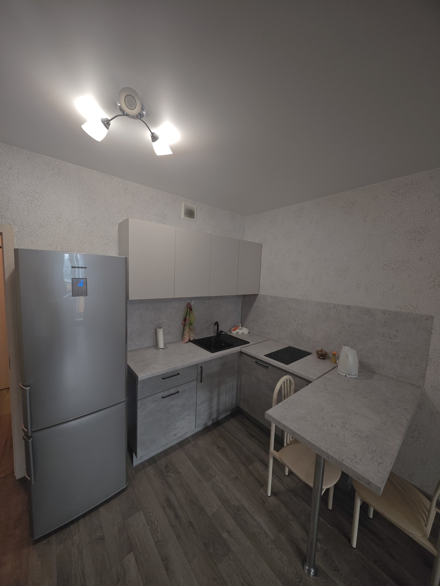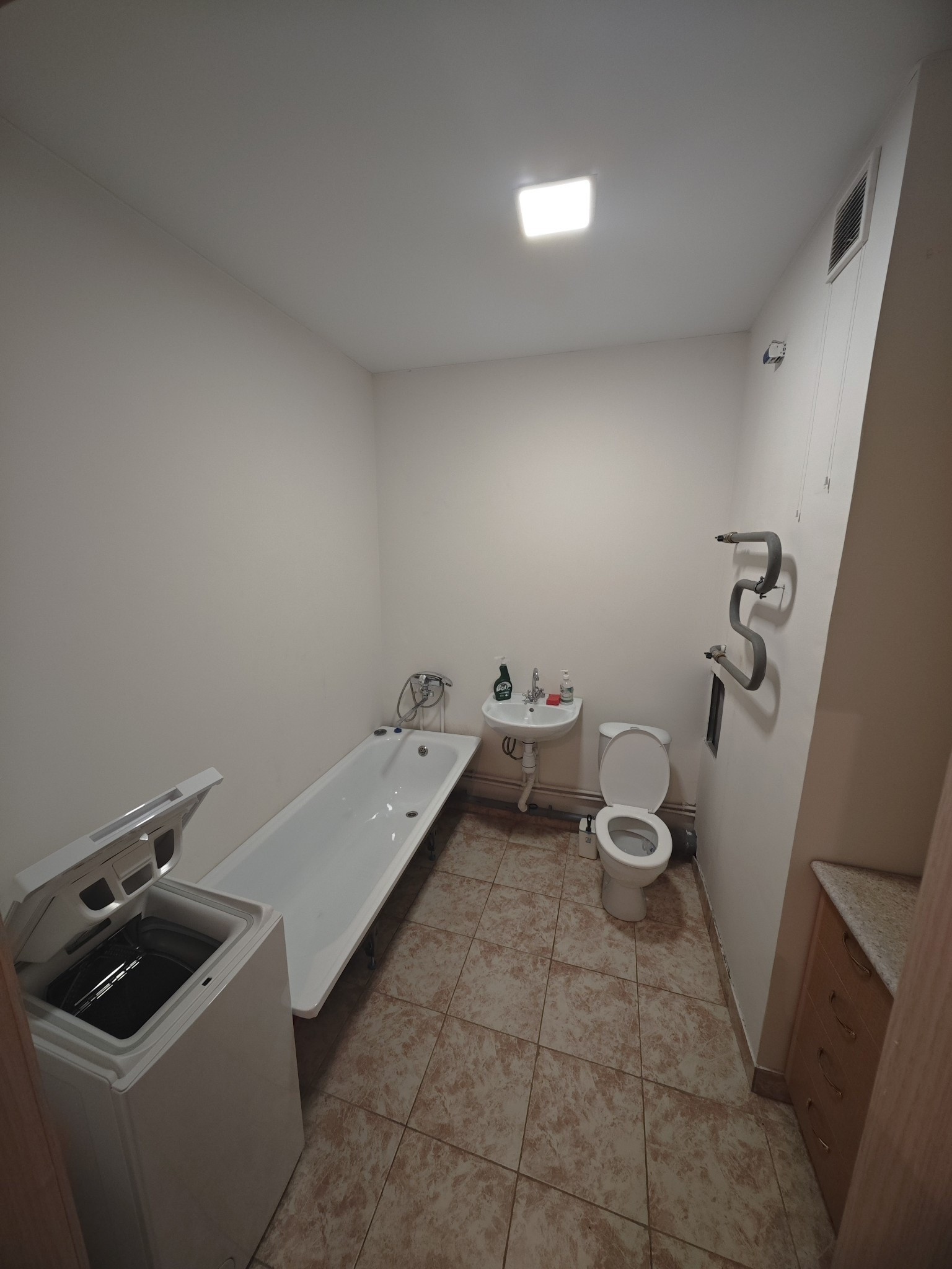 Есть всё необходимое для проживания: кухонные принадлежности, бытовая химия и прочее. Холодильник, стиральная машинка.