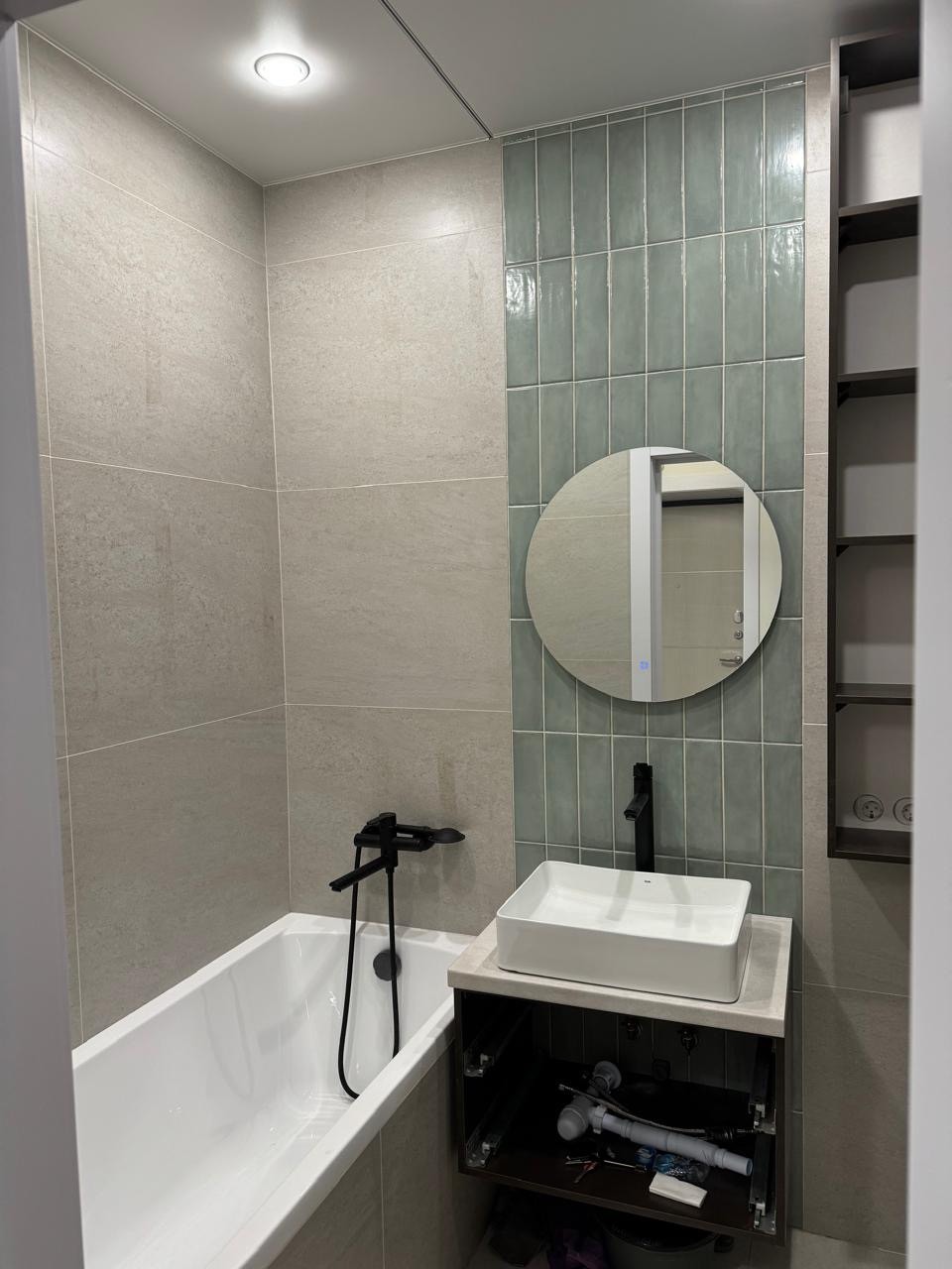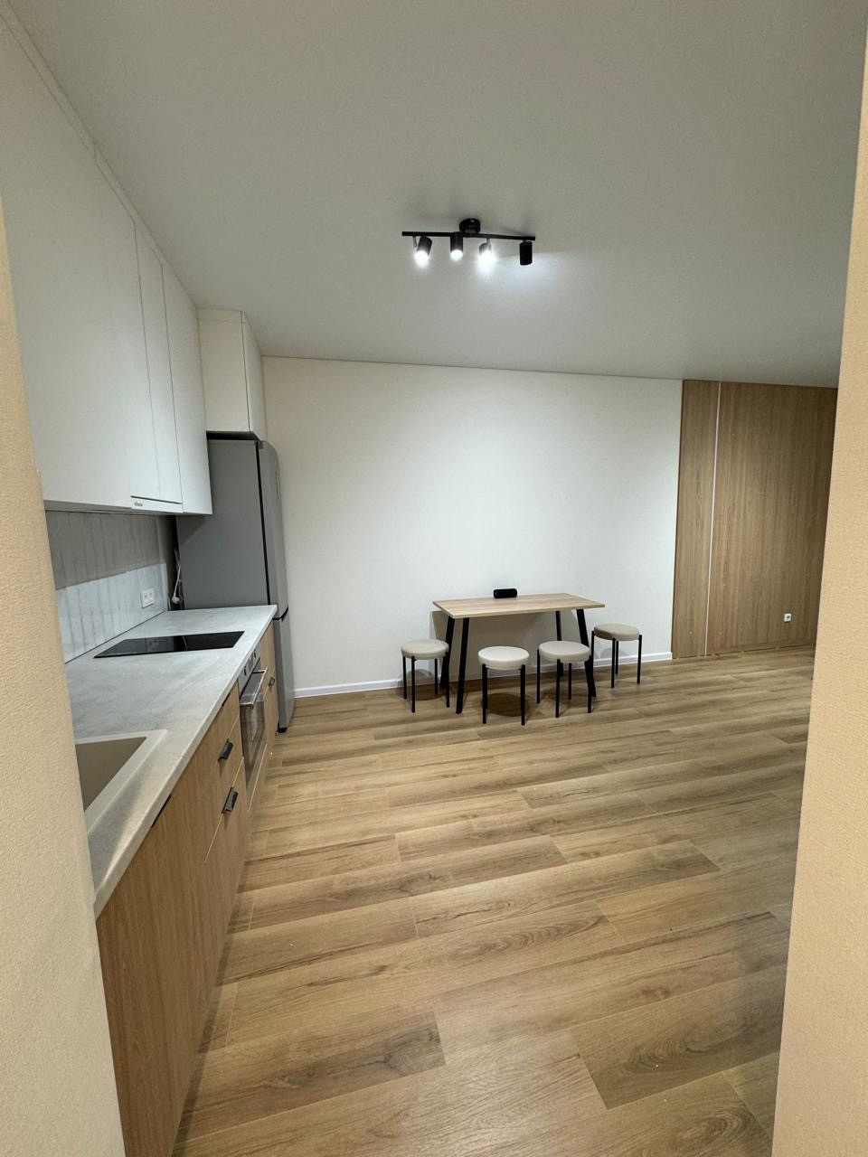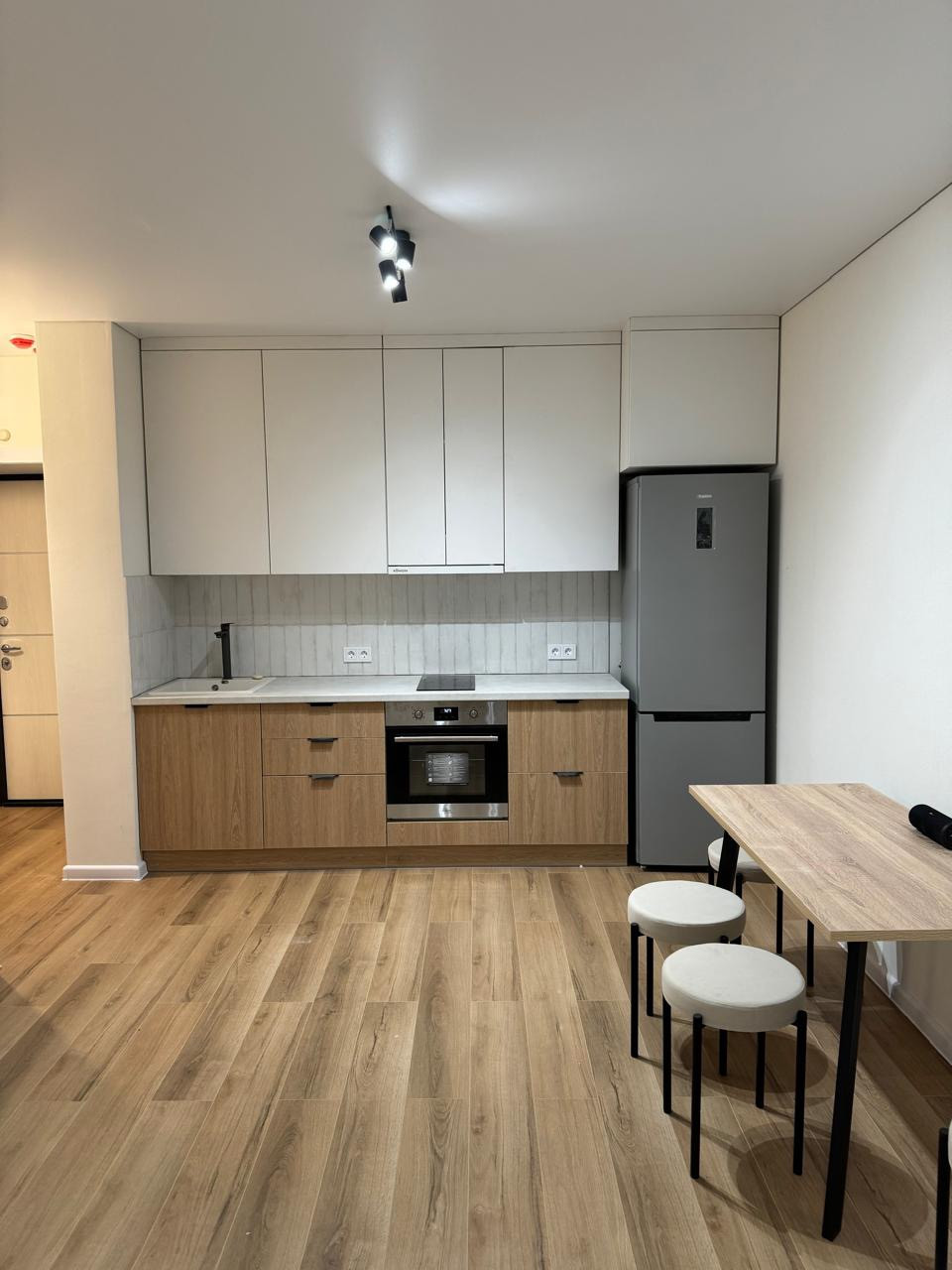 В квартире есть: кухонный гарнитур, стол и стулья, кондиционер, стиральная машина, холодильник, варочная панель, духовой шкаф.
