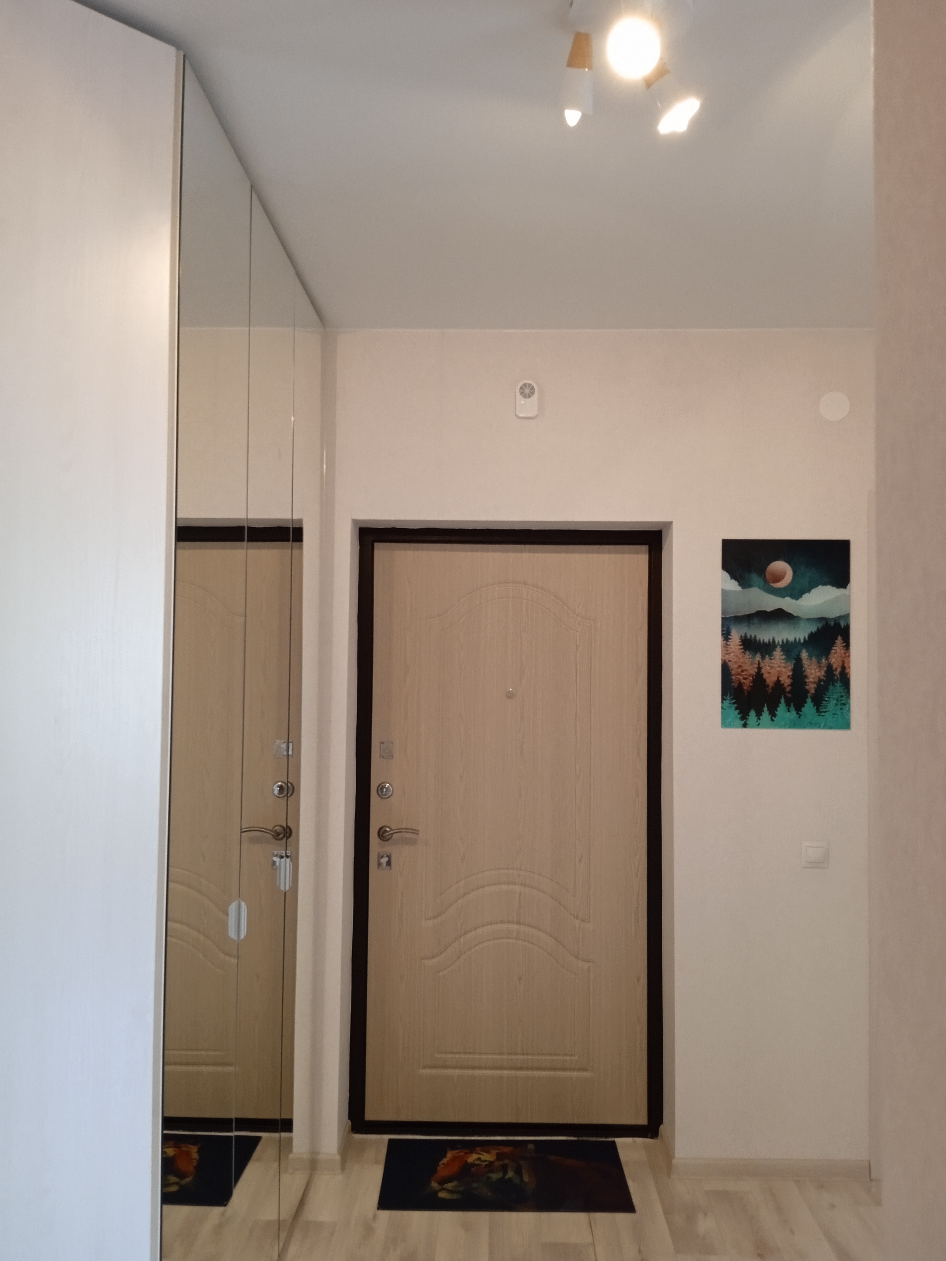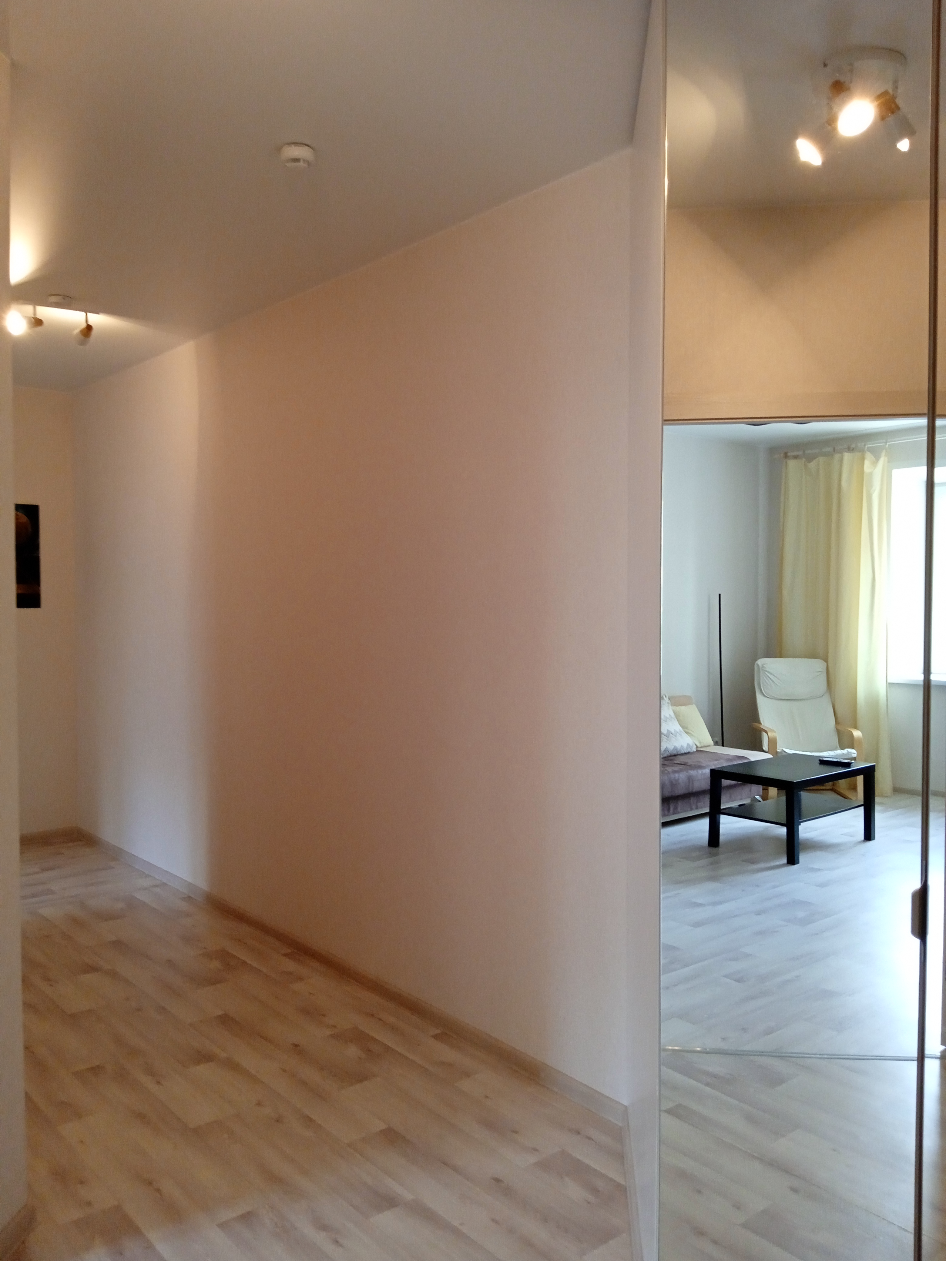 В квартире в просторном коридоре- современный встроенный зеркальный шкаф.