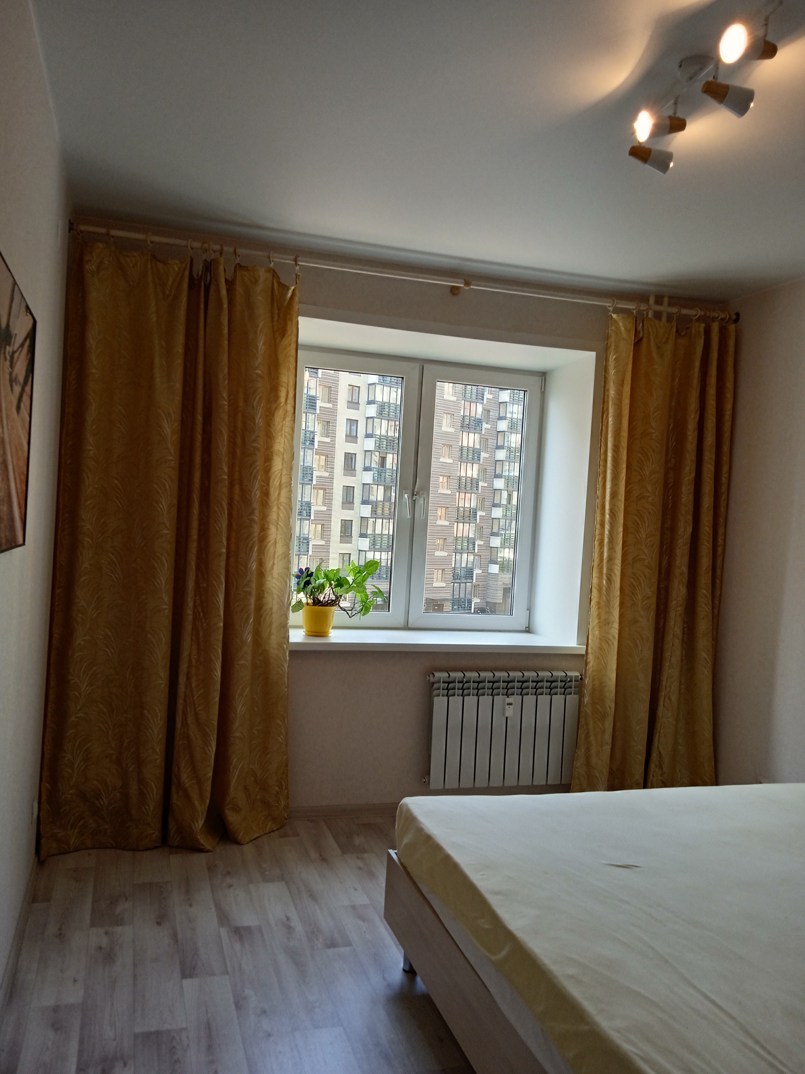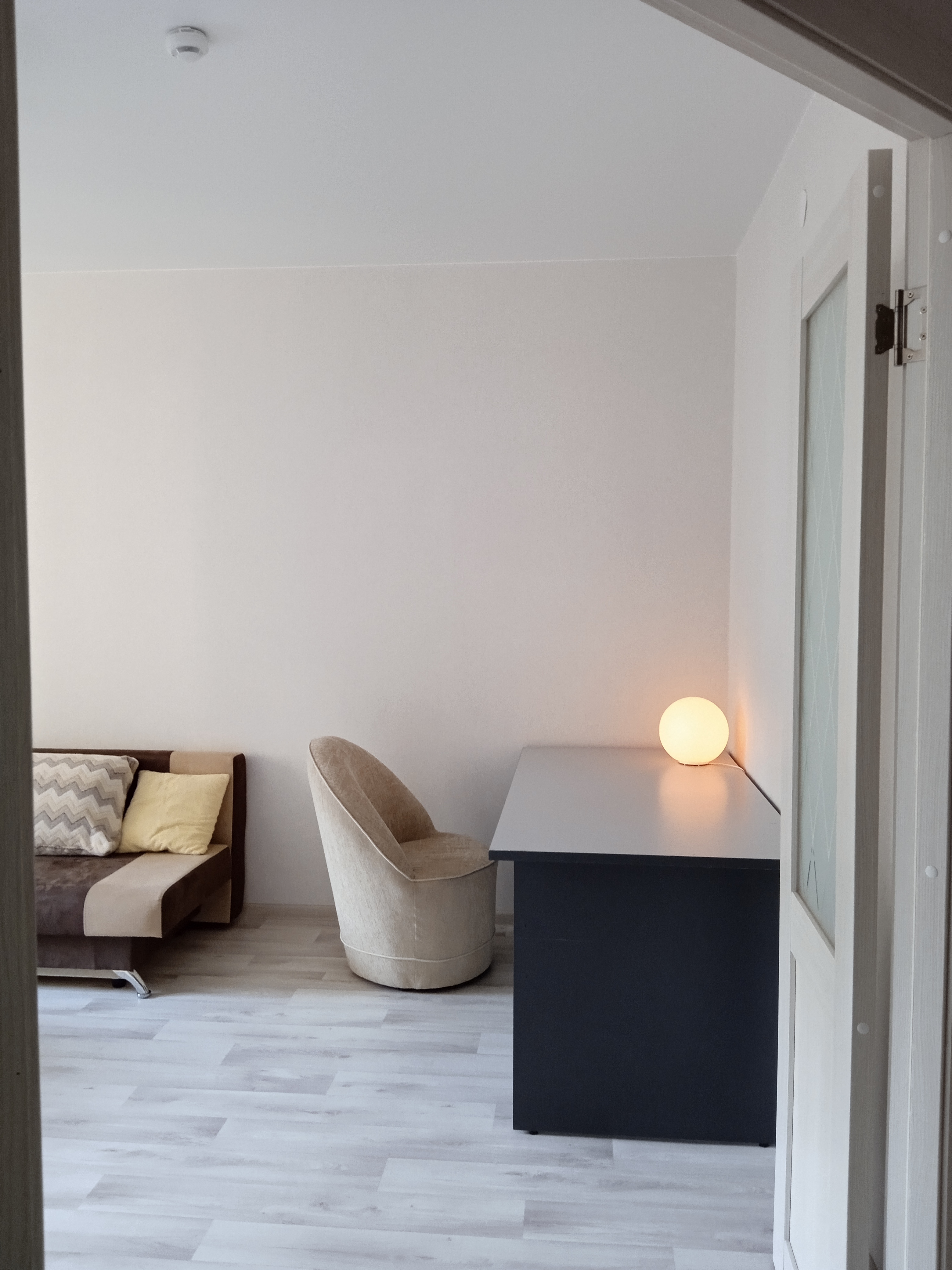 В комнате- новый раскладной двуспальный диван, кресло-качалка от Икея, журнальный стол, тонкий LED-телевизор на стене. Большой письменный стол позволяет удобно работать.