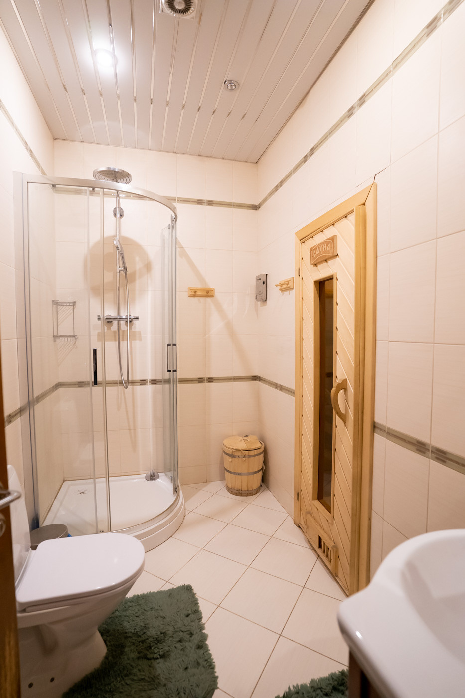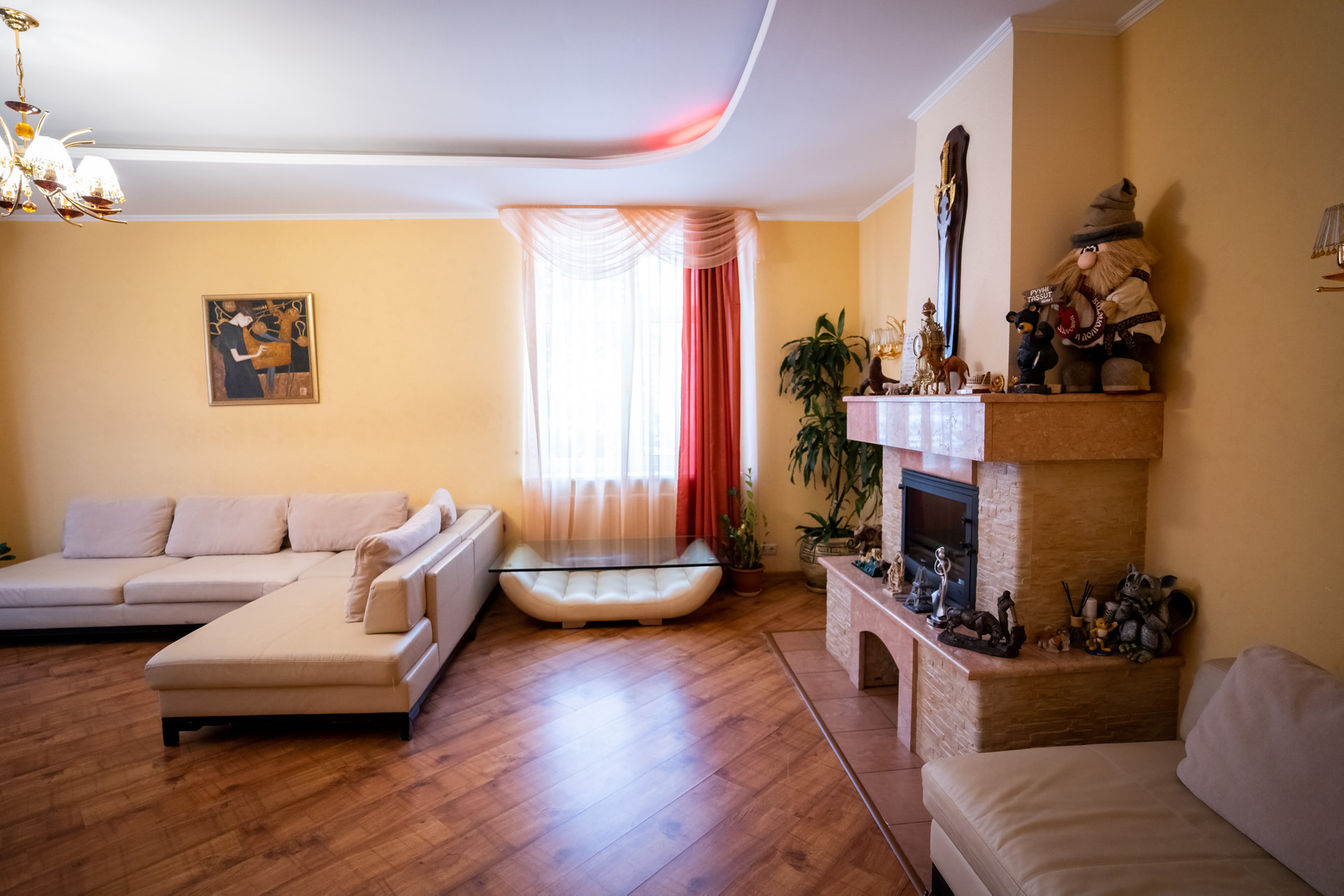 Светлая, просторная гостевая комната с камином, который согреет в зимнее время. Кухня -гостиная с вместительной кладовой комнатой и с выходом на террасу, обеденная зона. Бойлерная (котельная), сауна, кабинет, где всегда можно обдумать рабочие моменты. Между первым и вторым этажами расположена игровая комната с выходом на балкон.