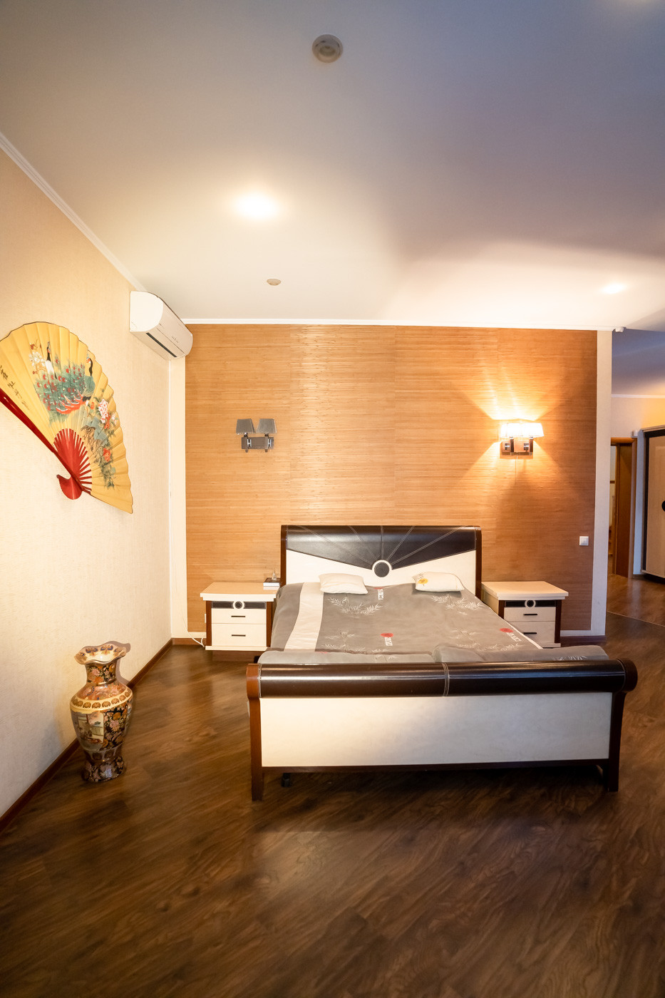 Просторная спальная комната в китайском стиле, с выходом на французский балкон и с вместительной, светлой гардеробной комнатой.