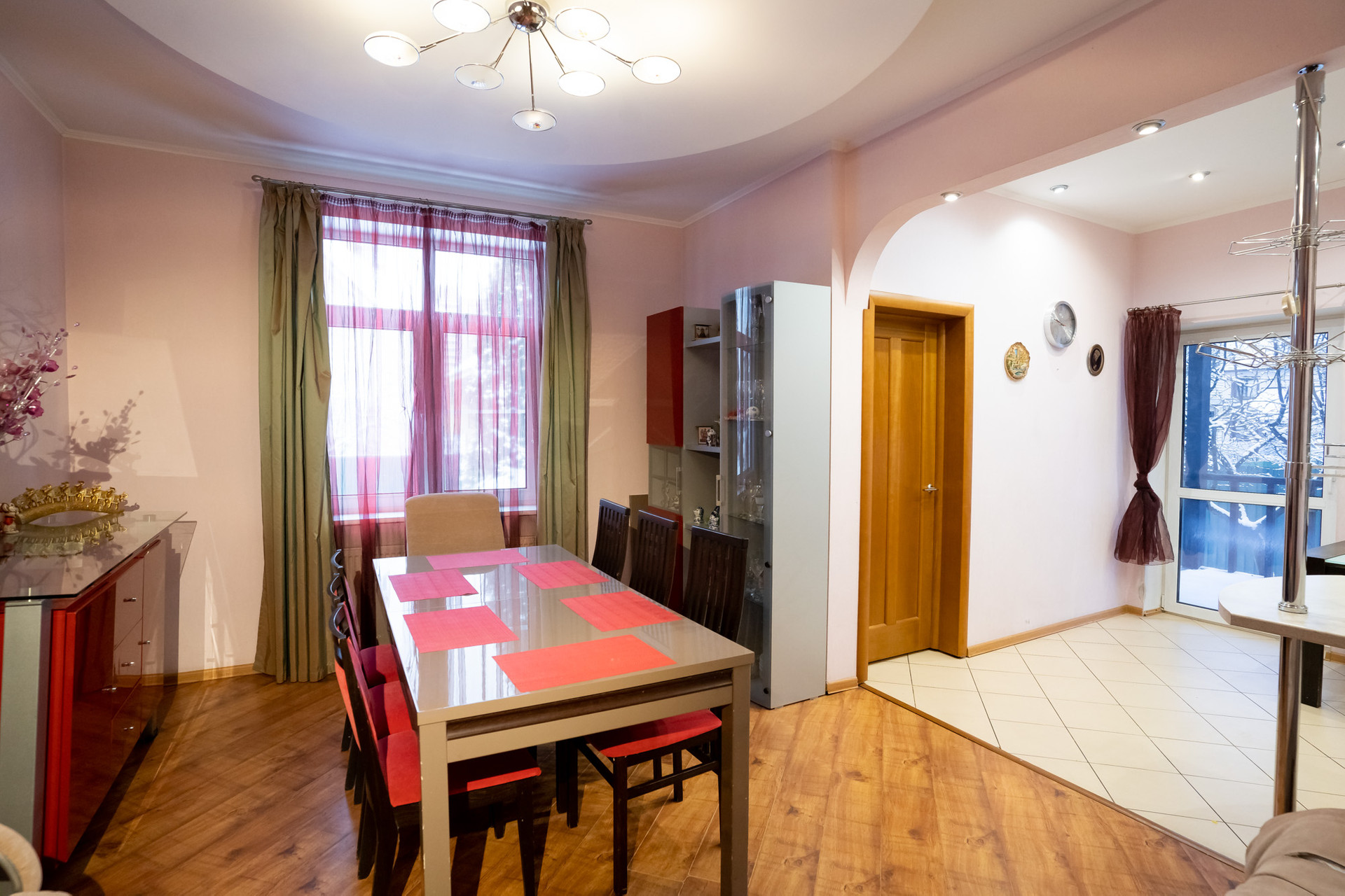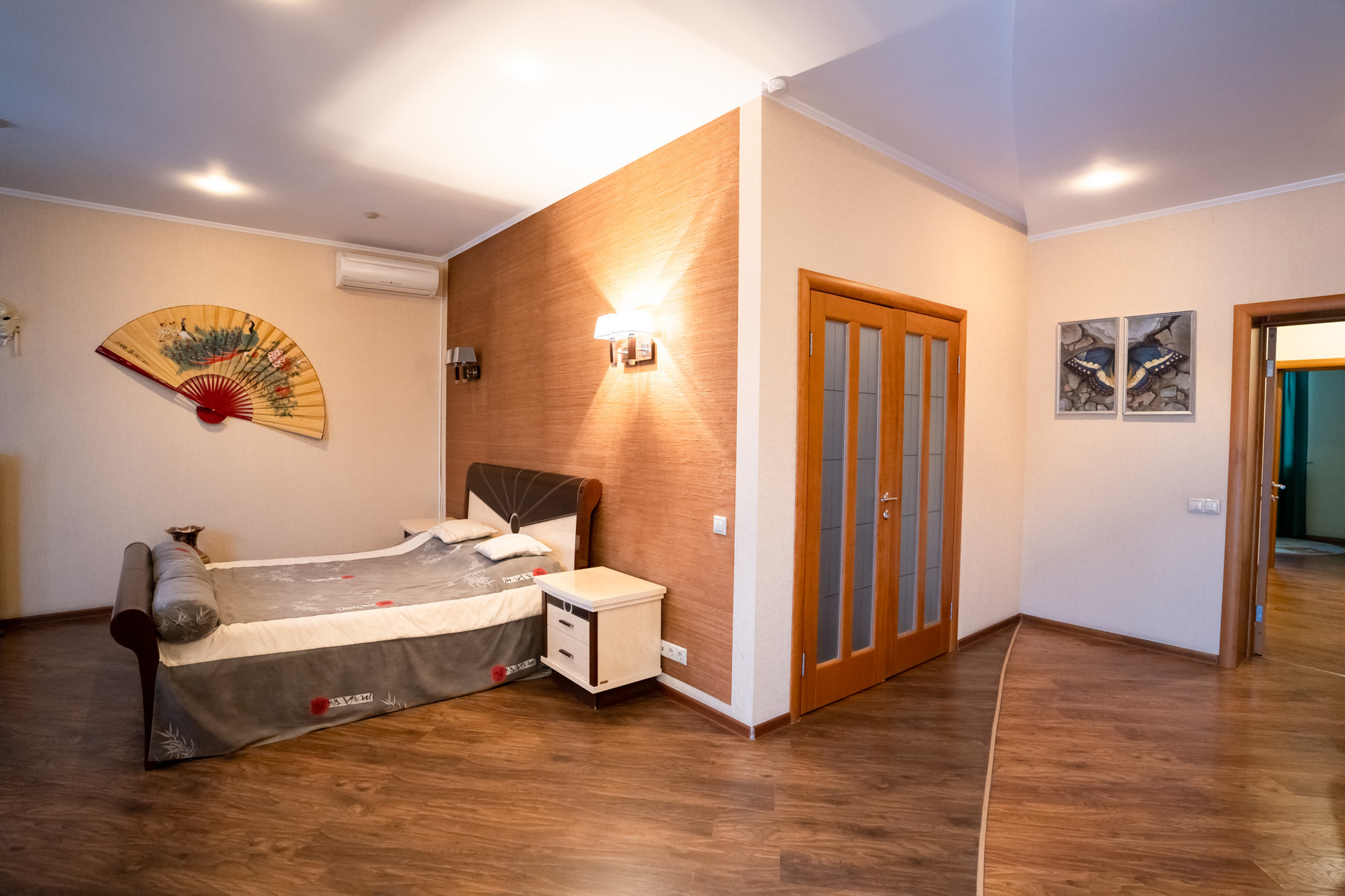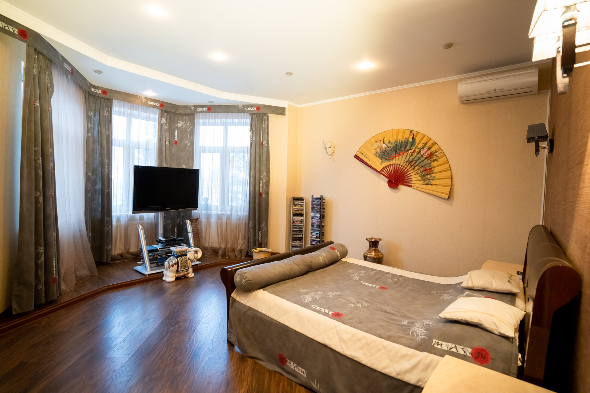 Просторная спальная комната в китайском стиле, с выходом на французский балкон и с вместительной, светлой гардеробной комнатой.
