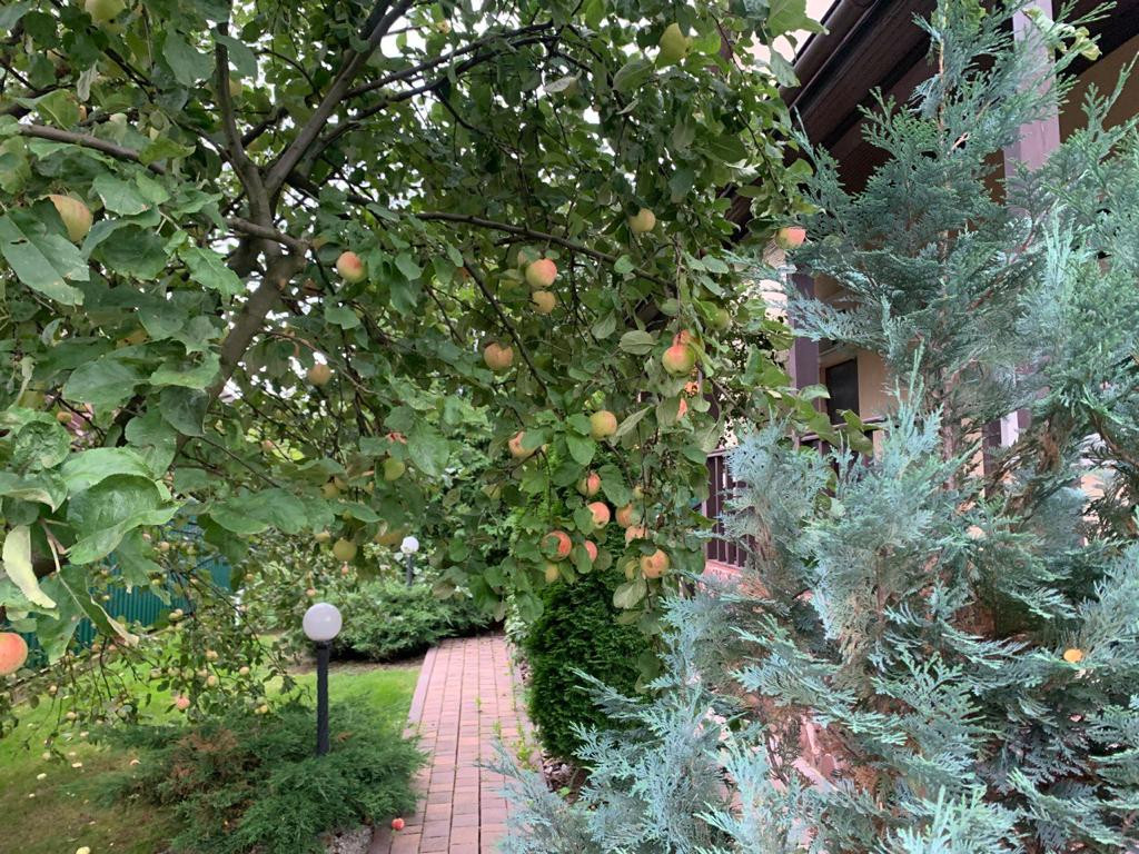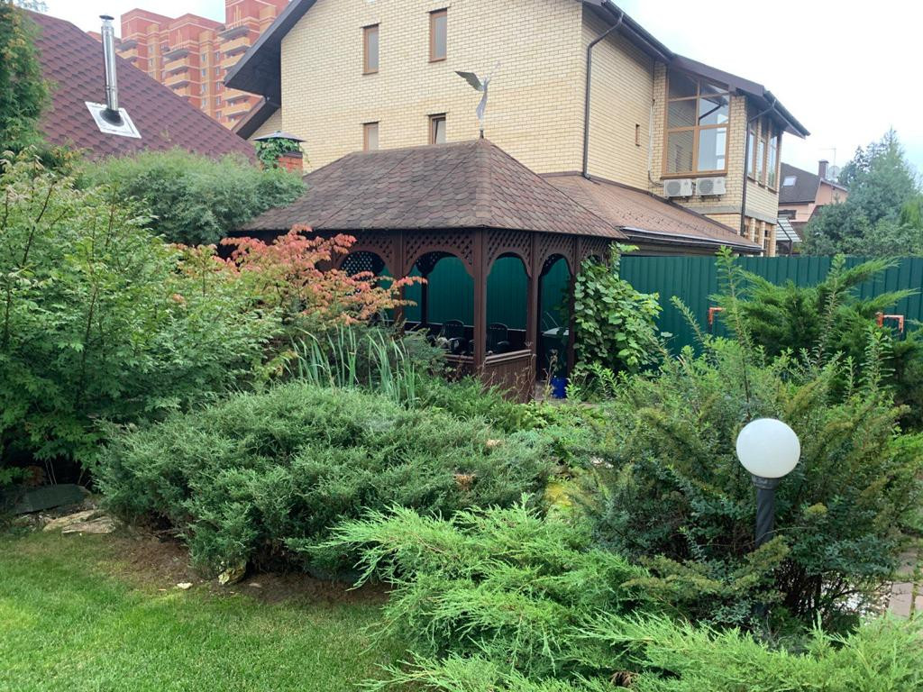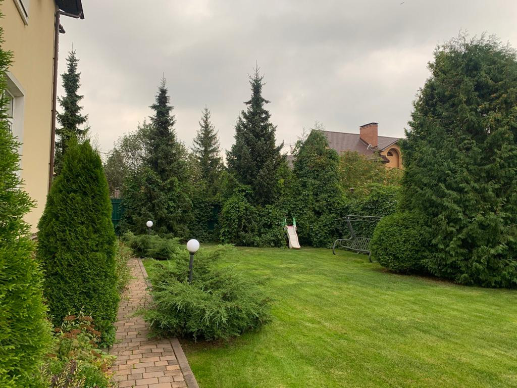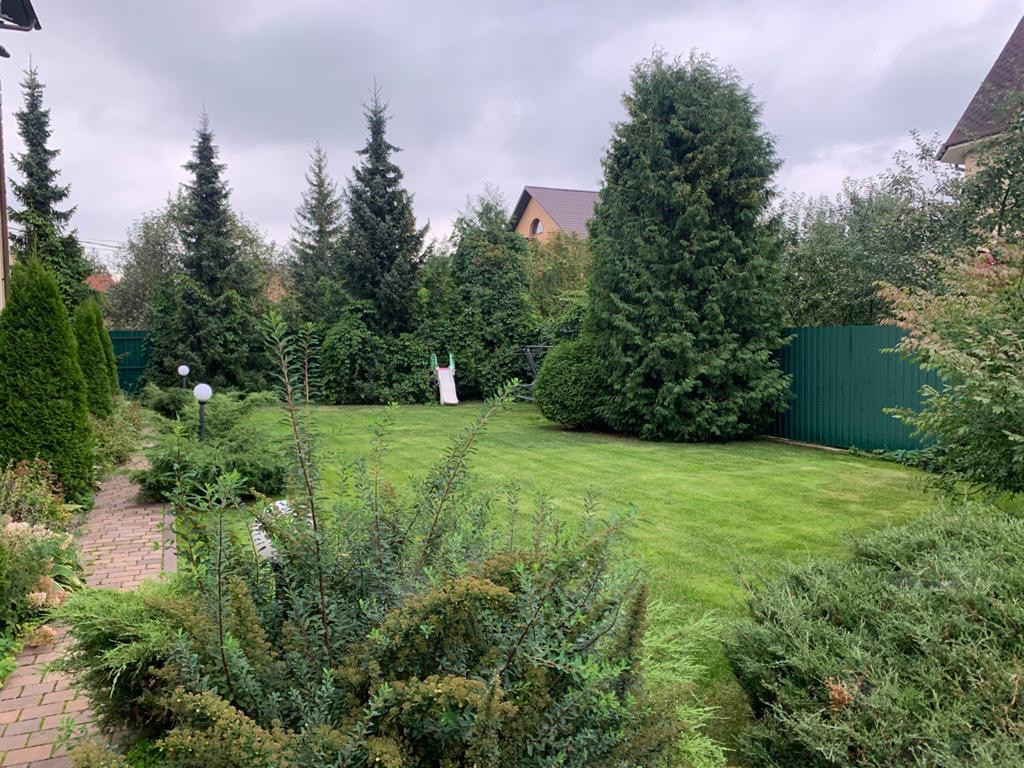 На участке выполнены ландшафтные работы, разбит газон, мини водопад , установлен автоматический полив , обустроены дорожки и декоративное освещение которое в вечернее время придает магию и сказку. Растут ели, пихты, плодовые деревья, малина, цветы. Так же на участке расположена зона барбекю. Территория дома огорожена забором -металлопрофиль с бетонным основанием, откатные ворота на пульте управления. Охрана.