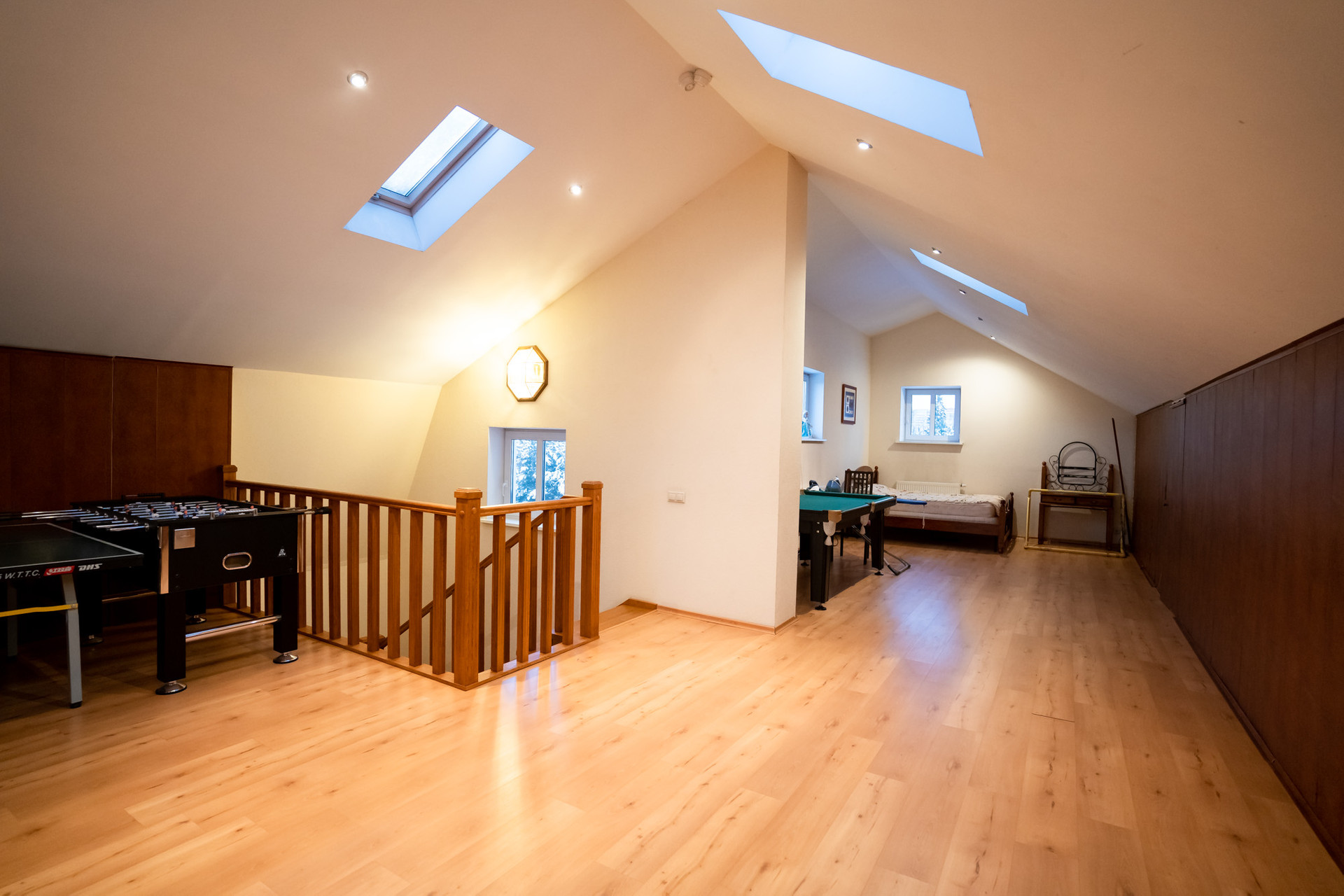 Мансарда свободной планировки: здесь можно играть в мини футбол, бильярд, настольный теннис. Или можно создать еще пару комнат по своему вкусу. Много зон хранения.