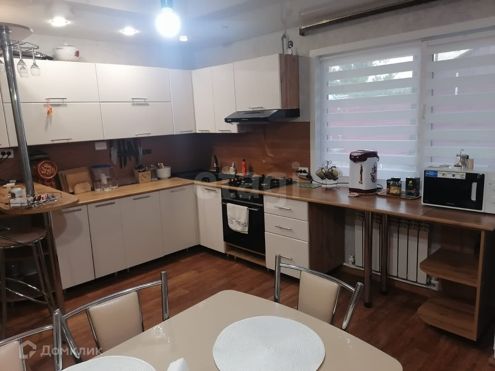 В доме просторная кухня гостиная +холл ( теплый пол), две изолированные комнаты и гостевая, по всему периметру дома установлены современные системы отопления, пластиковые окна, натяжные потолки, ванная+туалет в плитке, просторная гардеробная, во дворе уложена плитка, большой гараж с ямой.