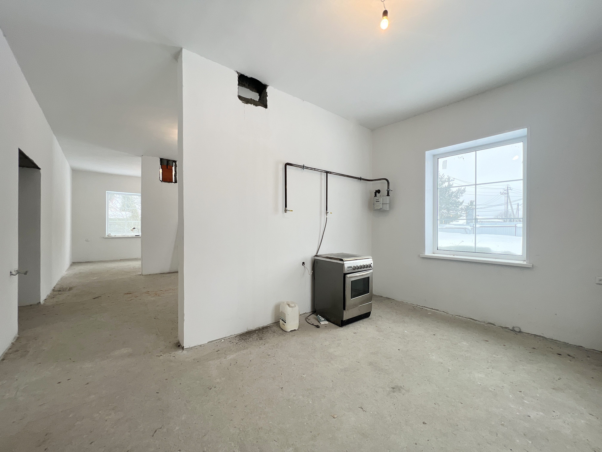КОММУНИКАЦИИ: Электричество по всему дому до розеток и выключателей. Магистральный газ заведен в дом, установлен счетчик.