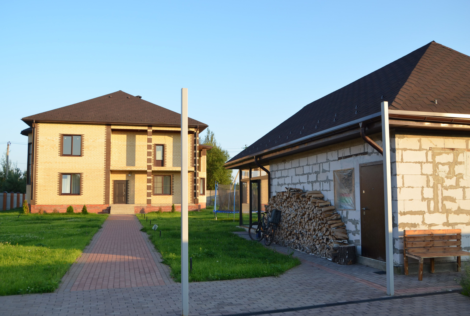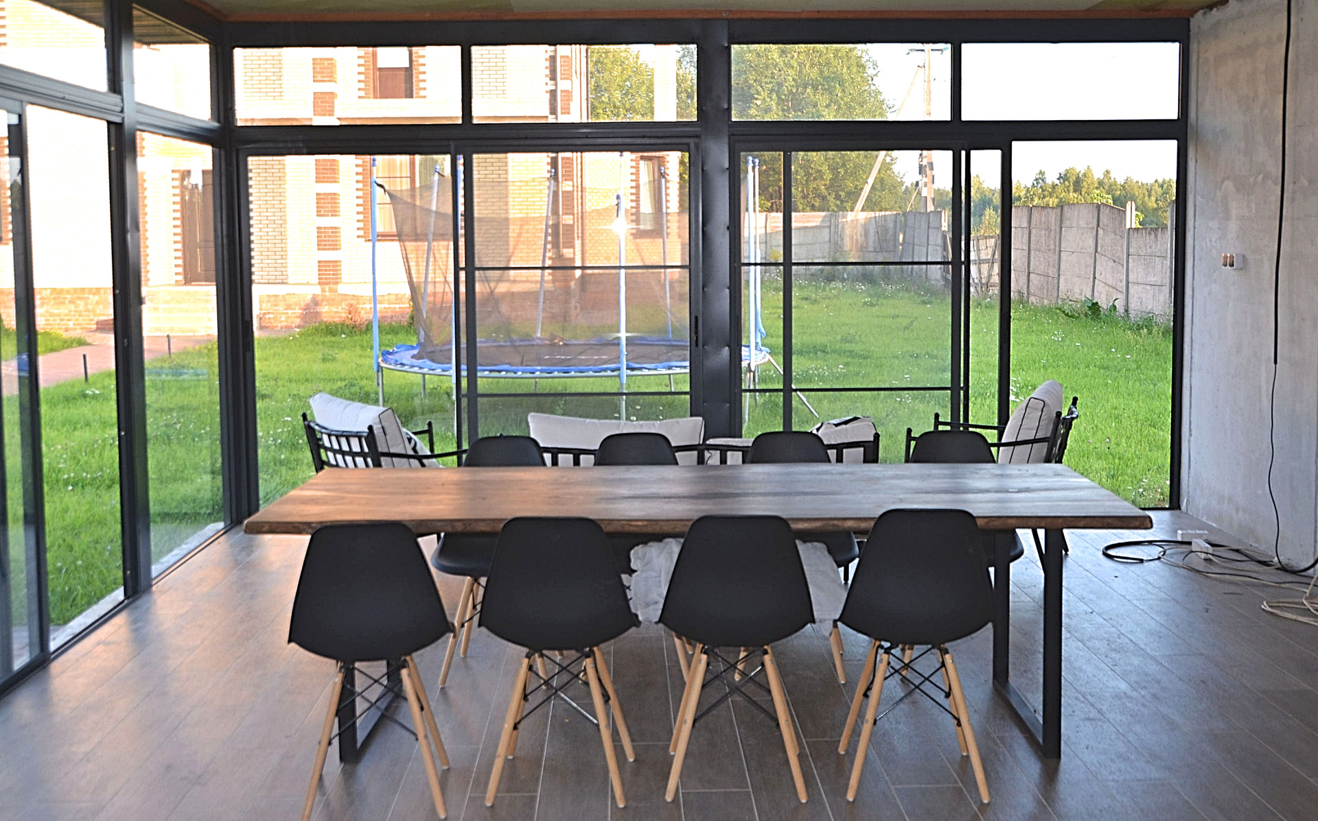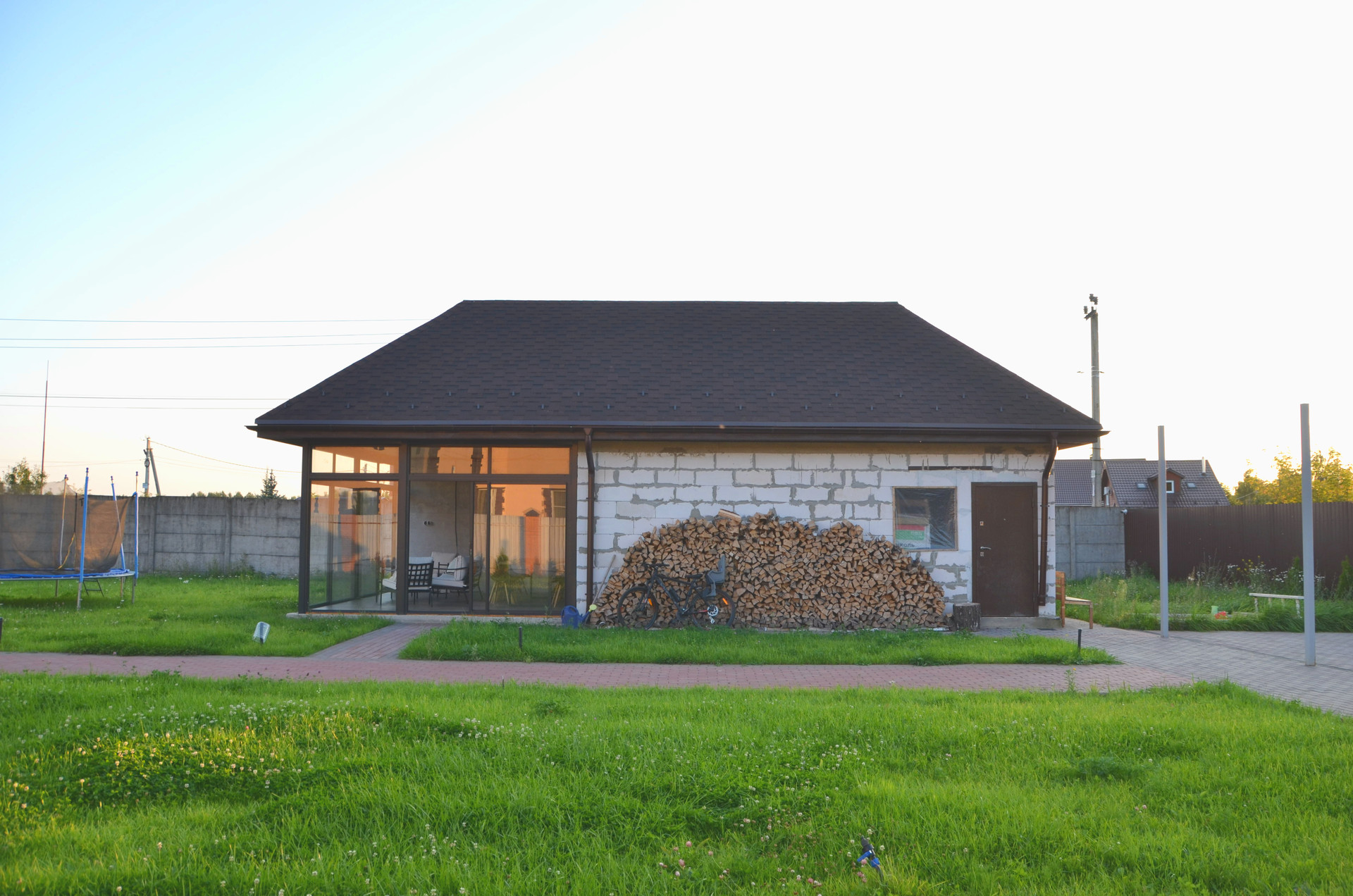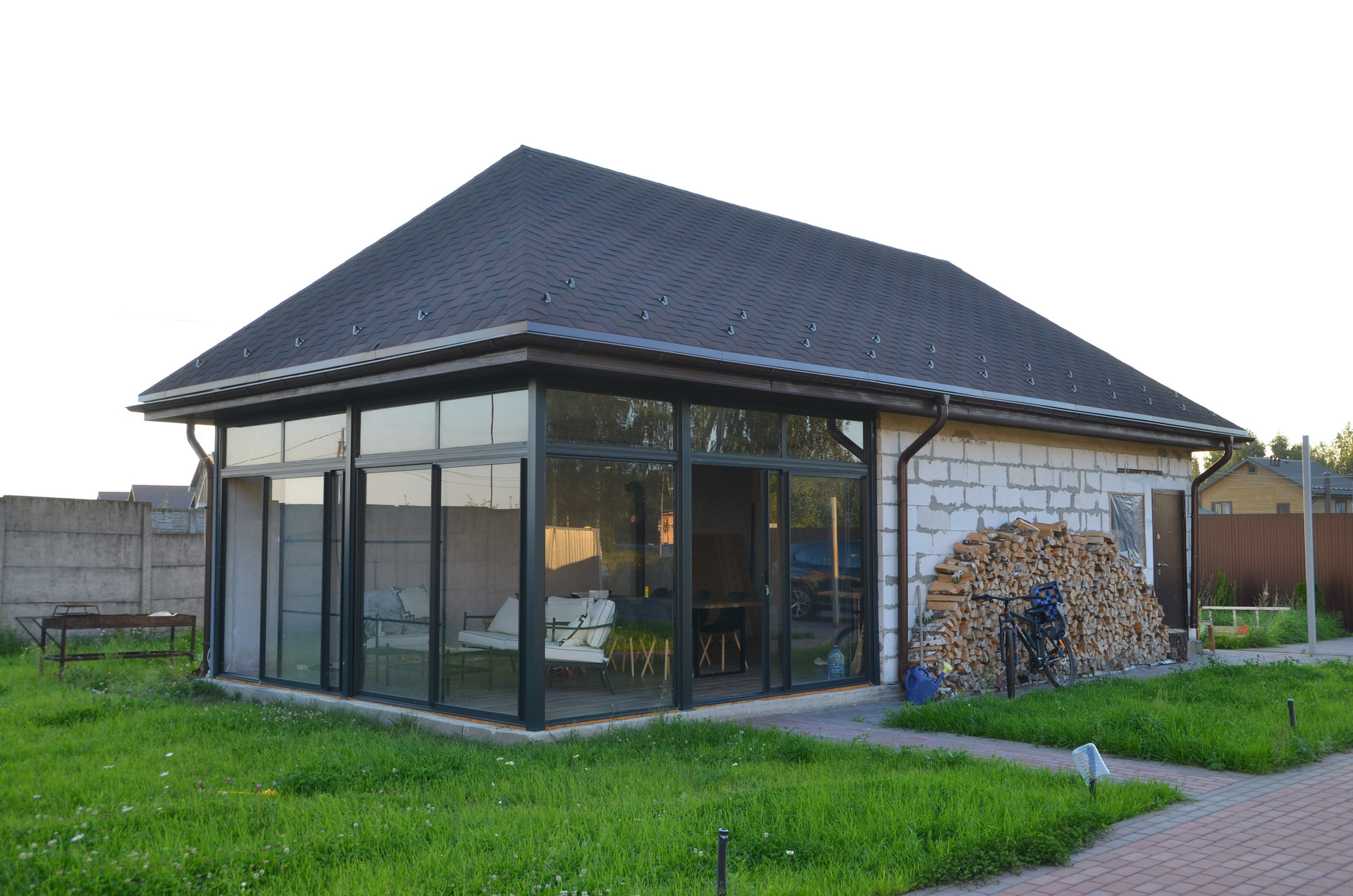 На участке гостевой дом, раздвижное панорамное остекление, отапливается электрическим обогревателем или печь на дровах.