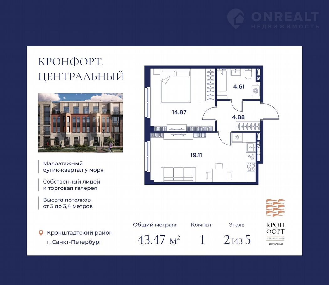 «Кронфорт.Центральный» — малоэтажный бутик-квартал, формирующий образ жизни на морском побережье в окружении актуальной архитектуры и современных инфраструктурных решений для жизни и досуга.