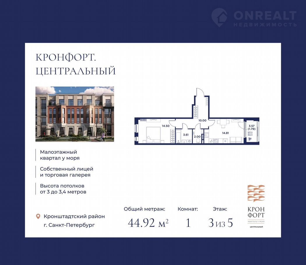 Продается 1-комнатная квартира, 44,92 кв.м. по адресу: Россия, Санкт-Петербург, ЖК «Кронфорт.Центральный». Квартира от Застройщика.Возможна покупка квартиры по льготным и специальным ипотечным программам. Условия и актуальные ставки уточняйте у менеджера отдела продаж.