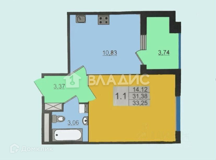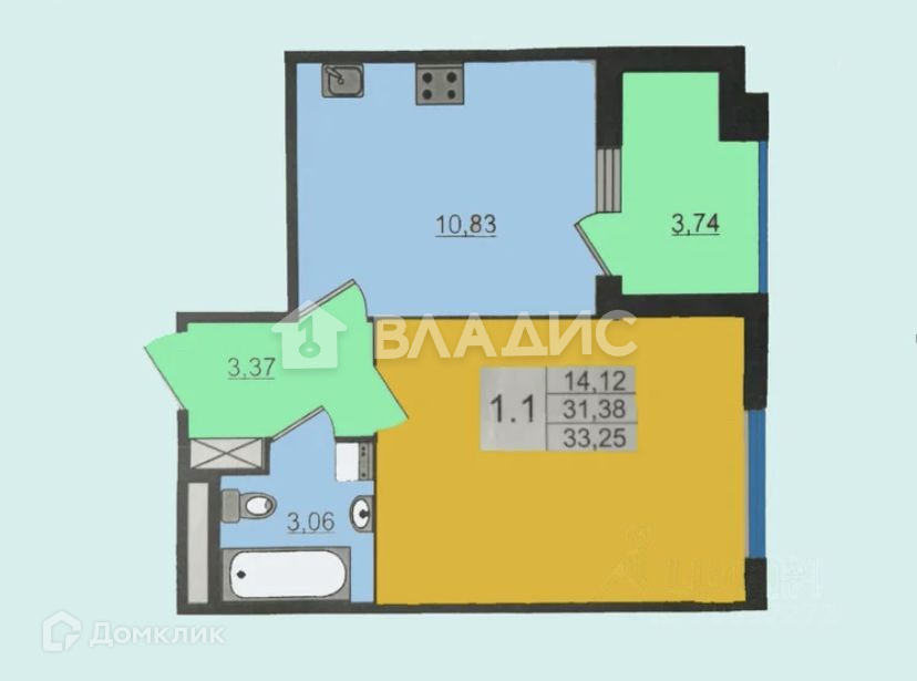 1 комната с просторной кухней.