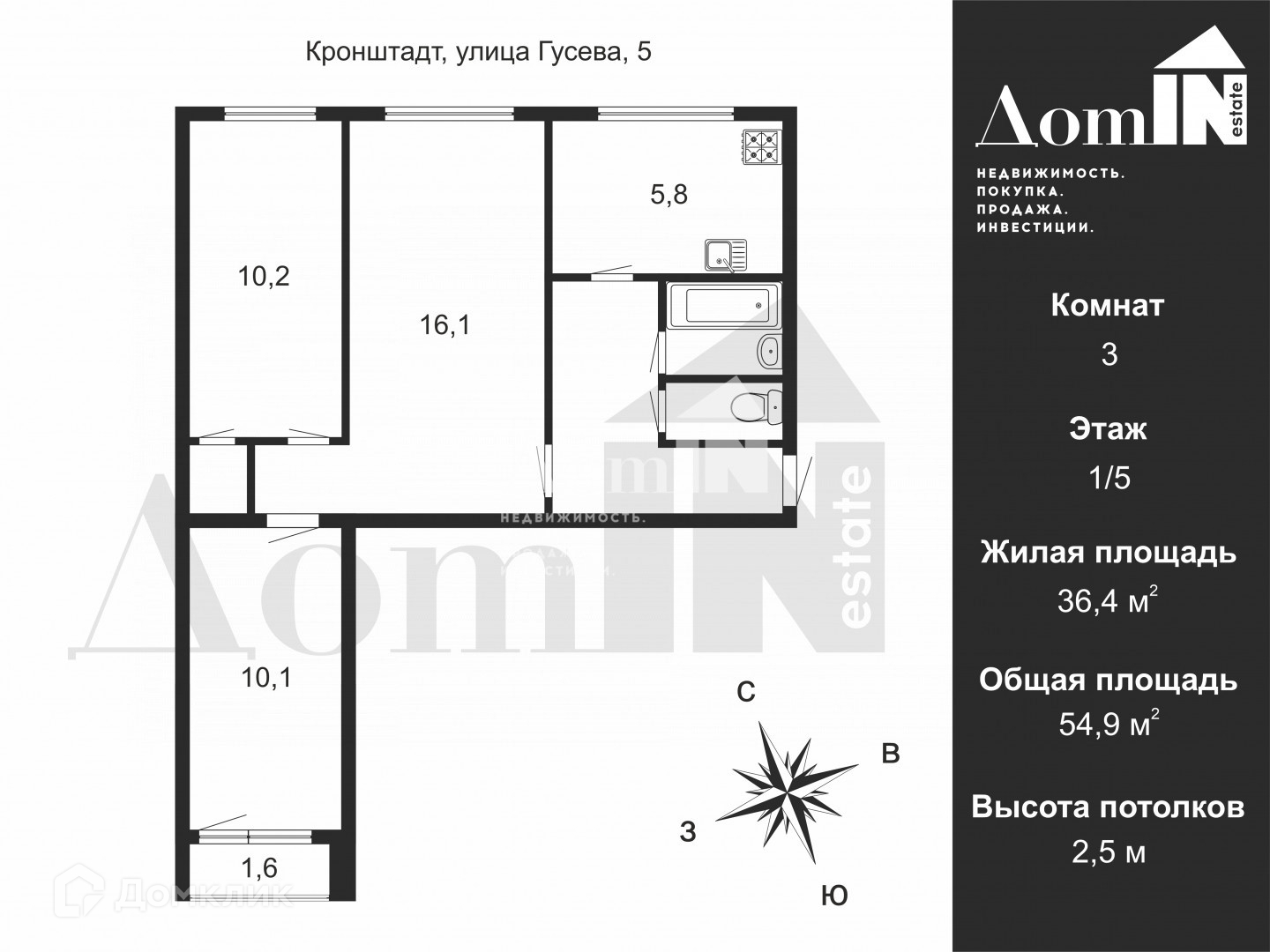 3-комнатная квартира, 54.9 м2, этаж 1 / 5, на продажу в Кронштадте, улица Гусева, 5