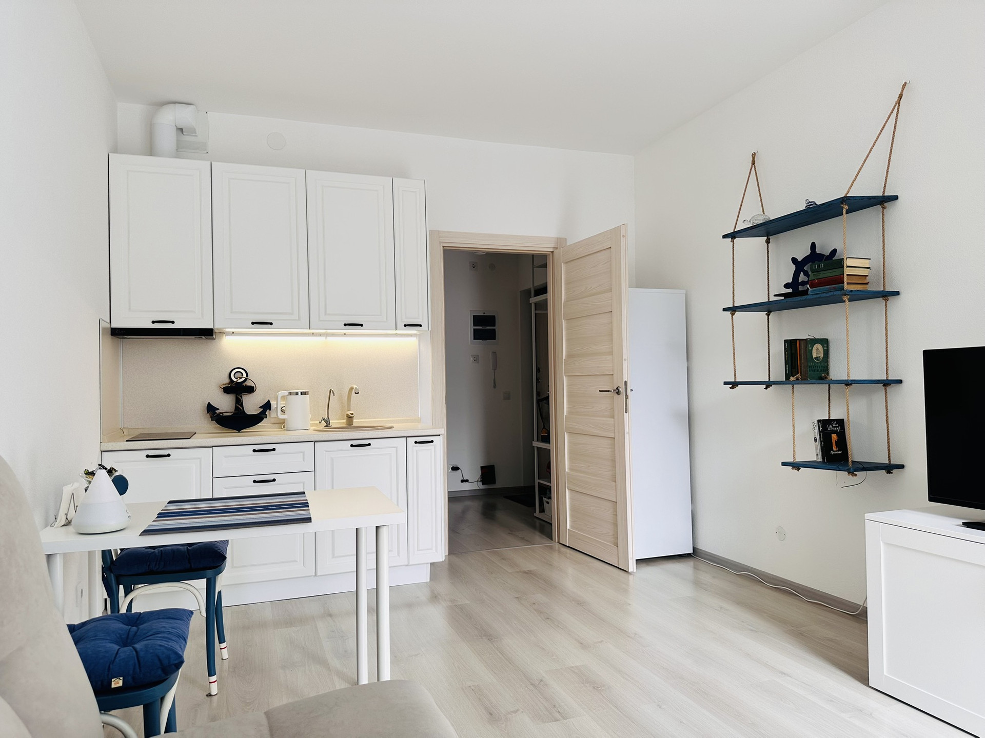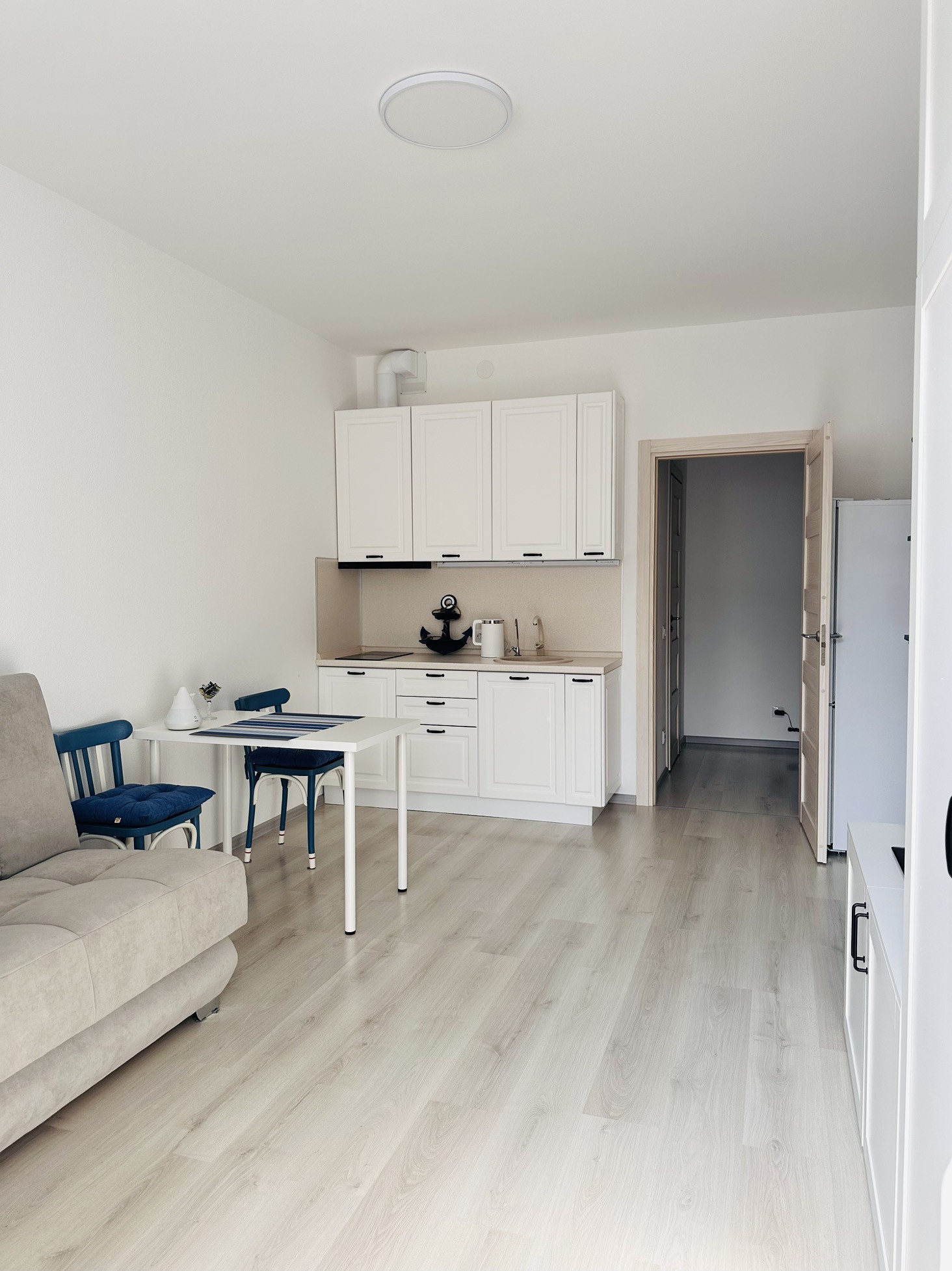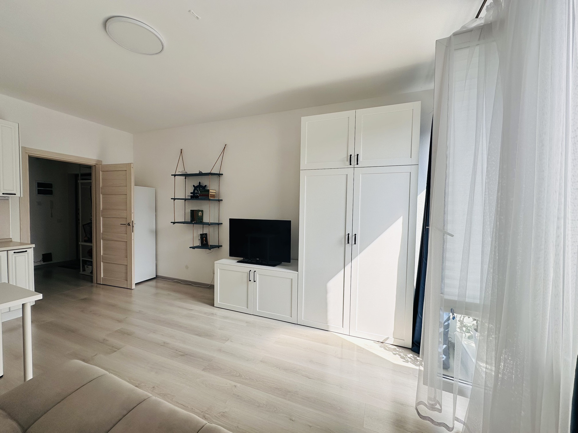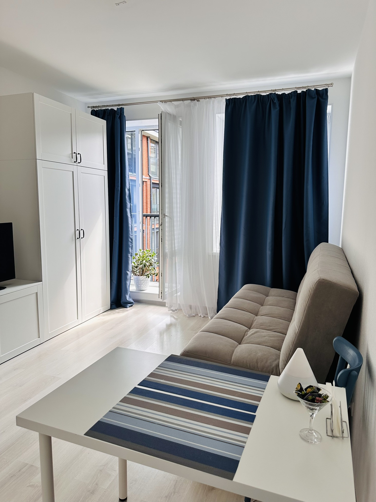 Студия с мебелью, техникой и французским балконом с видом на акваторию.