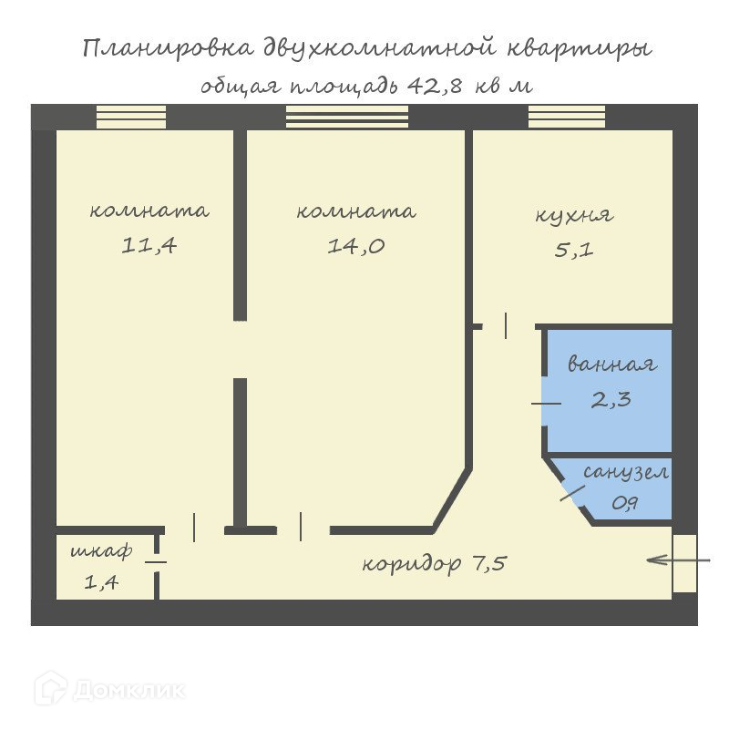 Общая площадь 42.8 м2