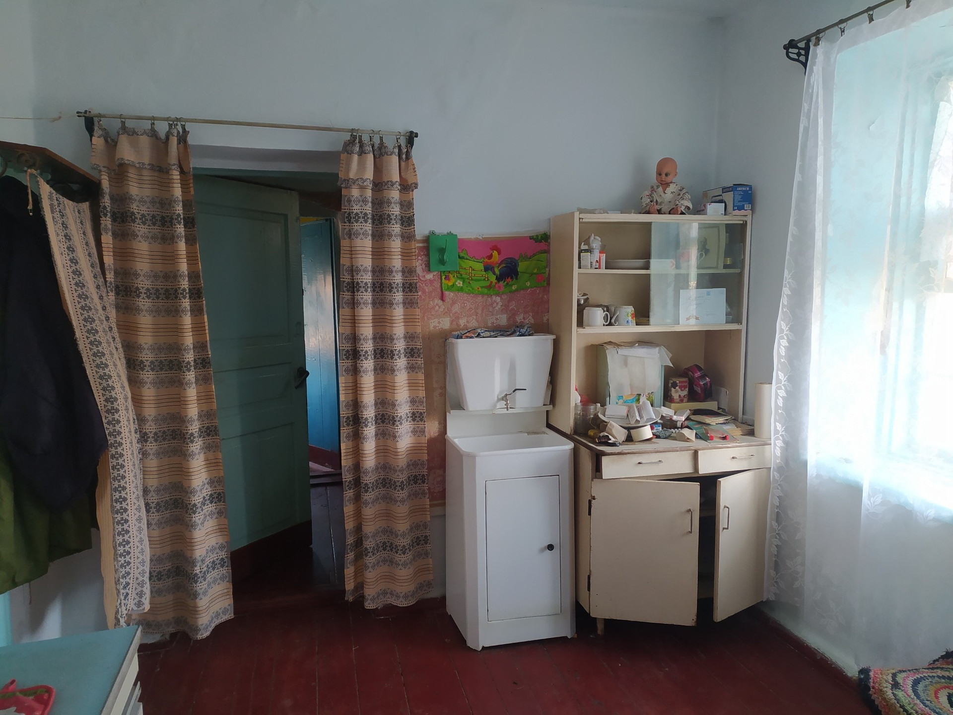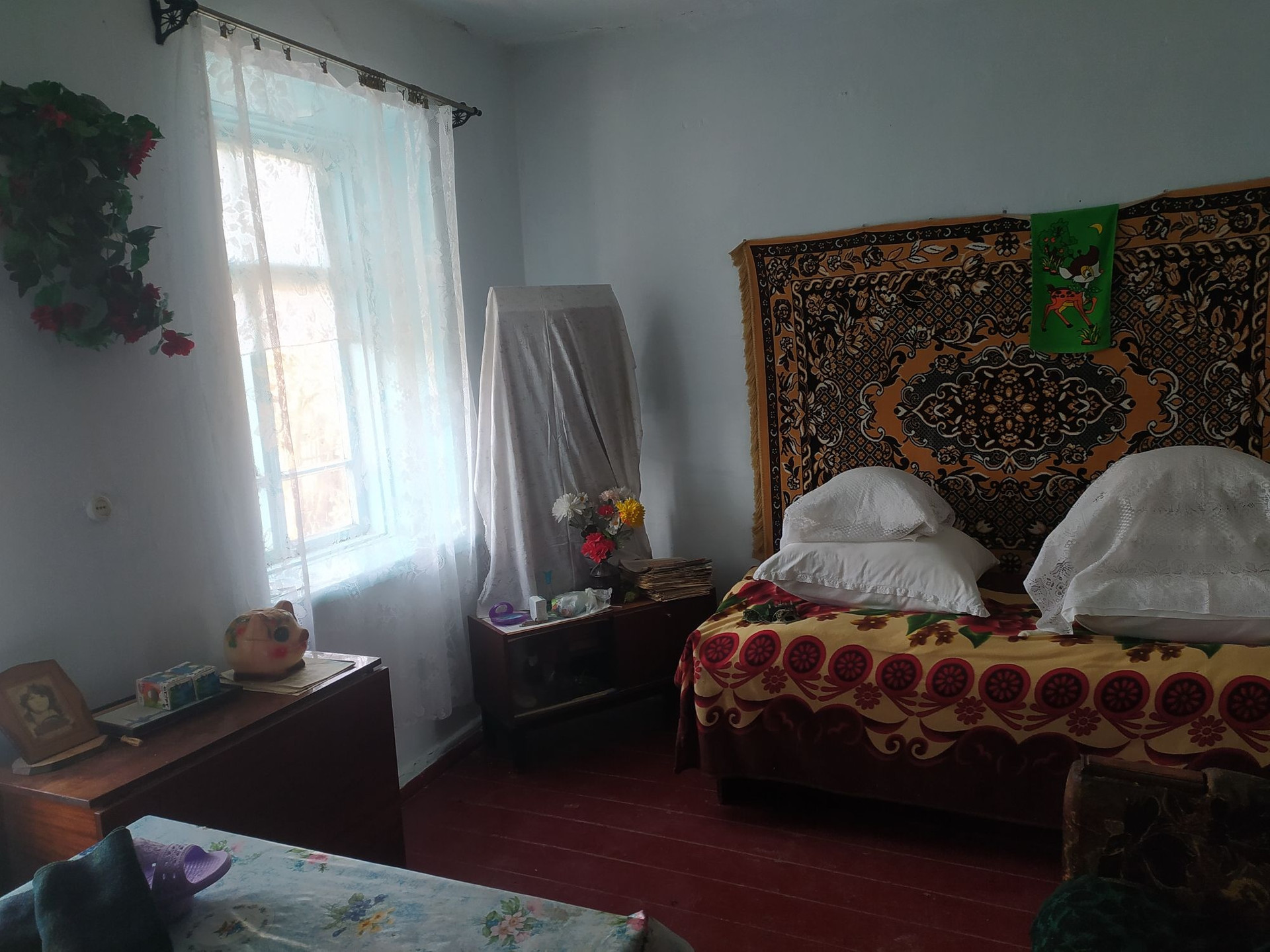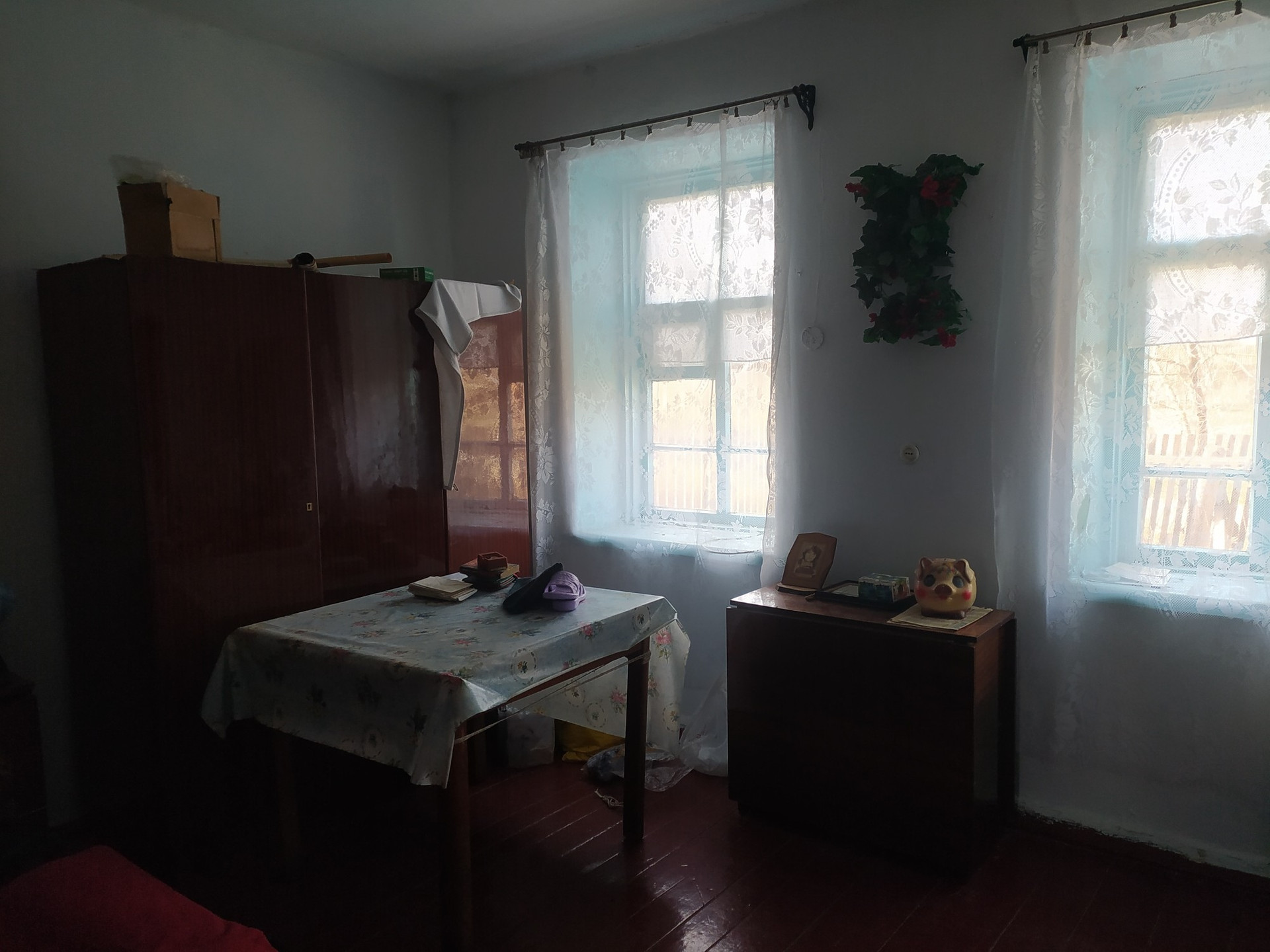 Дом состоит из двух комнат,кухни,кладовой,веранда.дом саманный.Остается вся мебель,шкаф,трюмо с зеркалом,два стола,стулья, занавески,шкафы кухонные,две кровати,диван,умывальник с бочком,ковры настенные, закрутки!!!