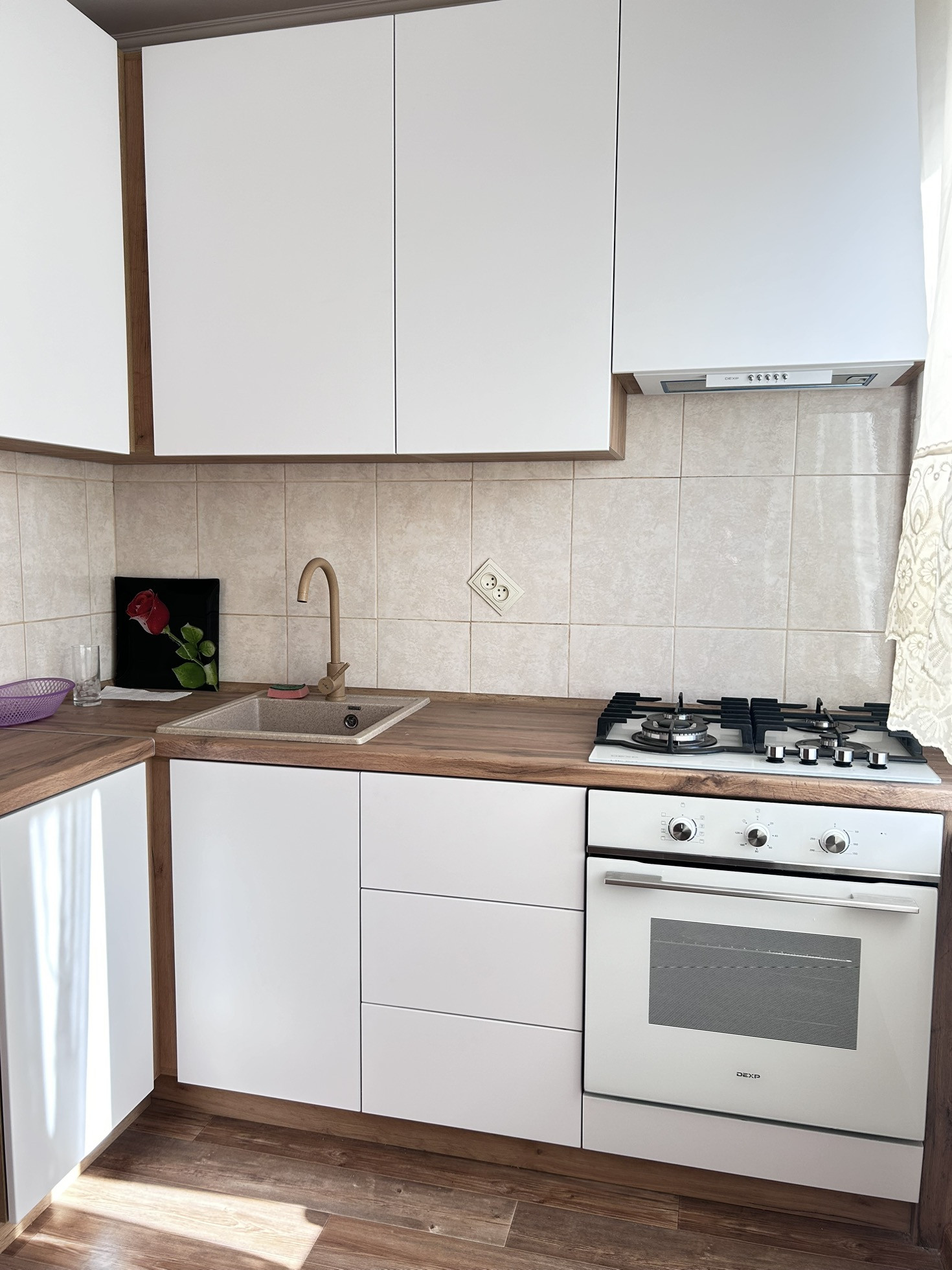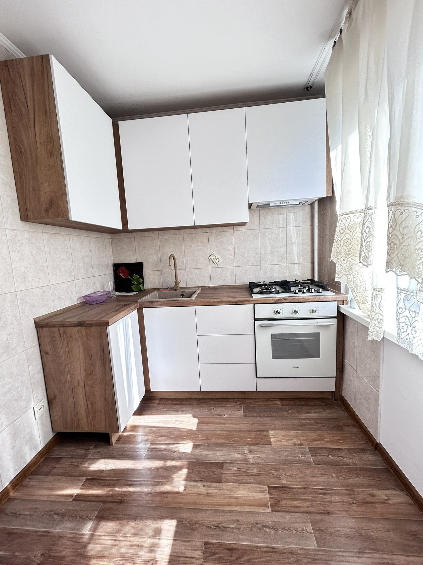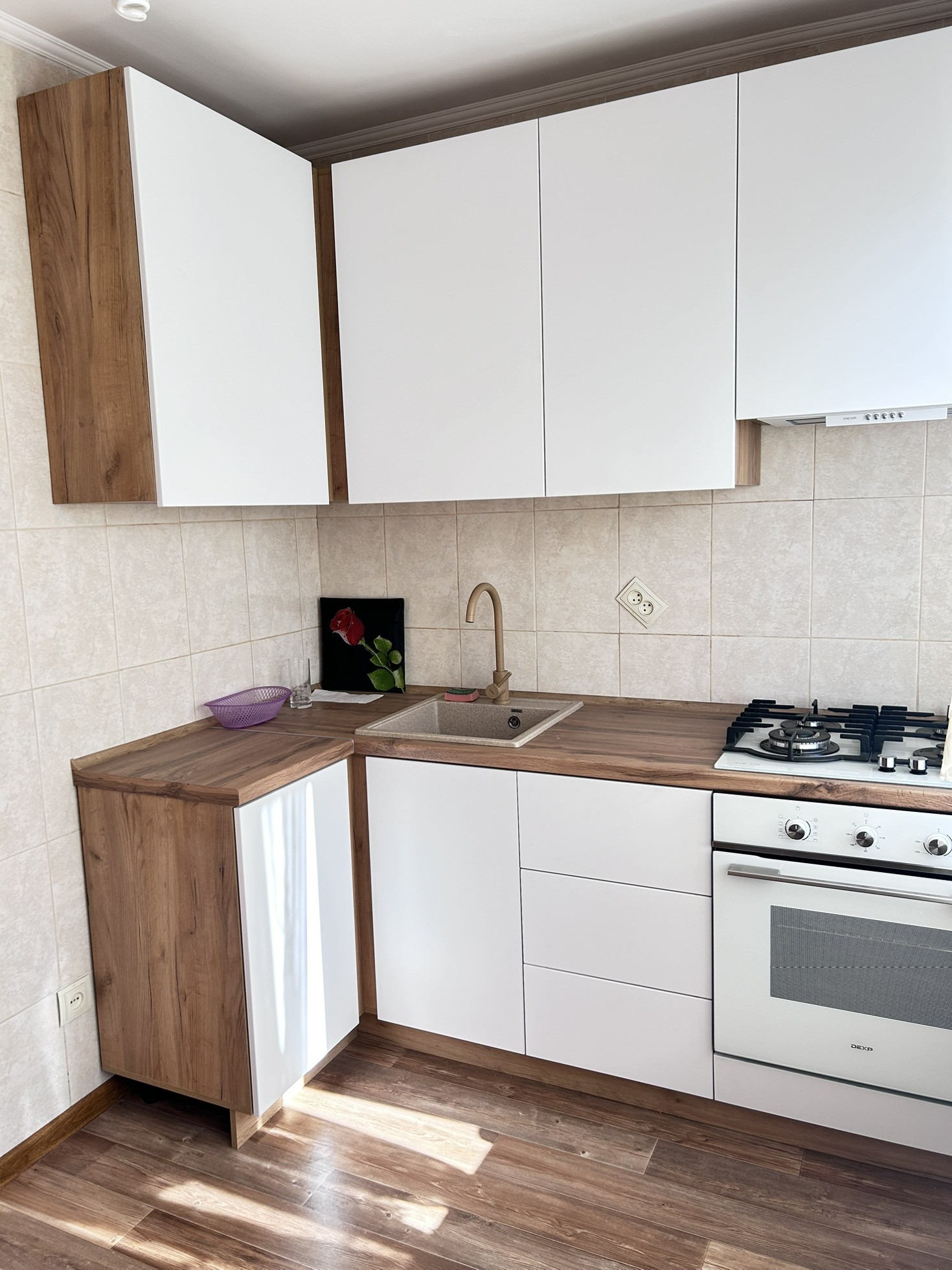 Остается кухонный гарнитур и встроенная бытовая техника. Все новое, в употреблении не было.