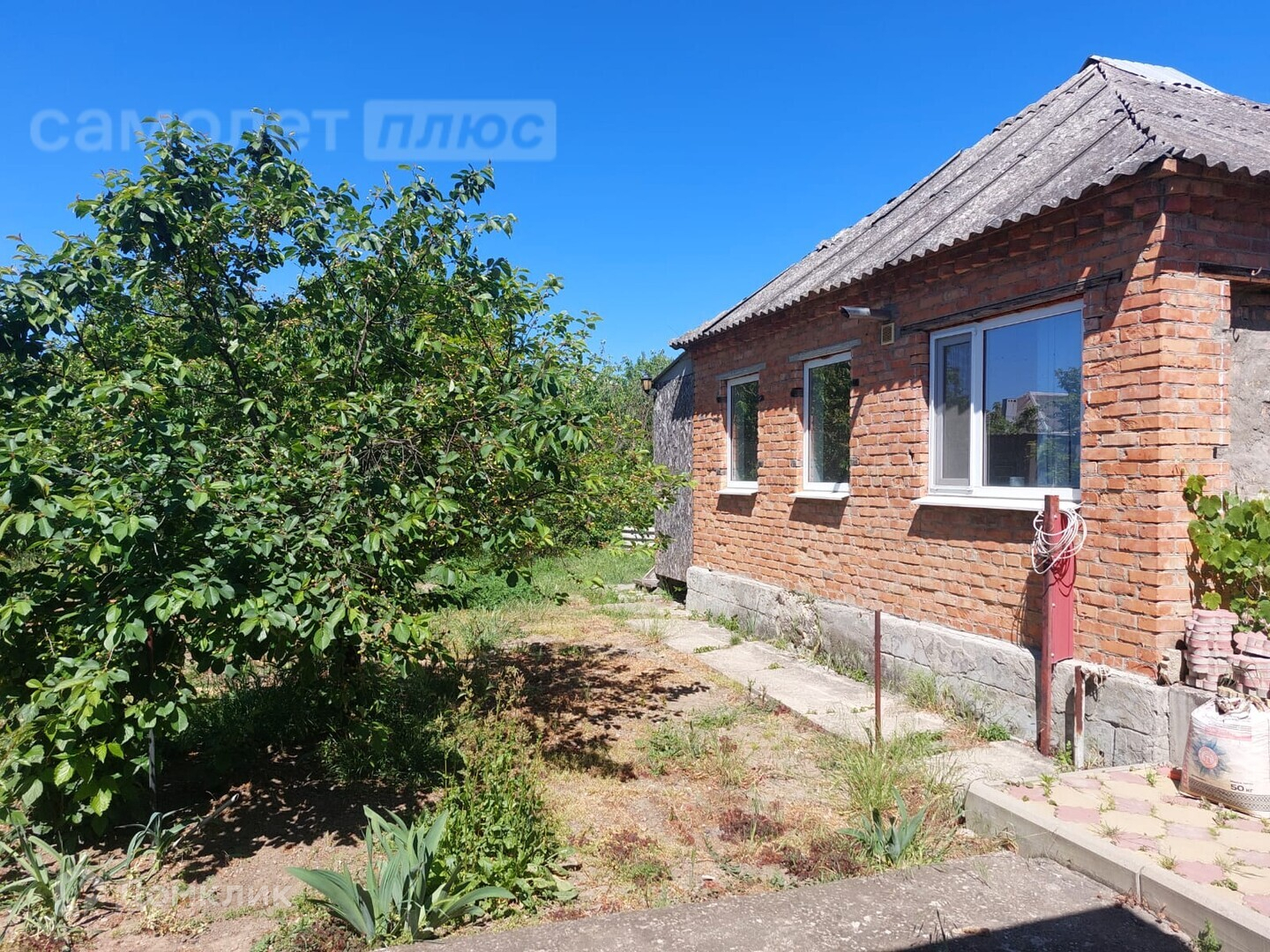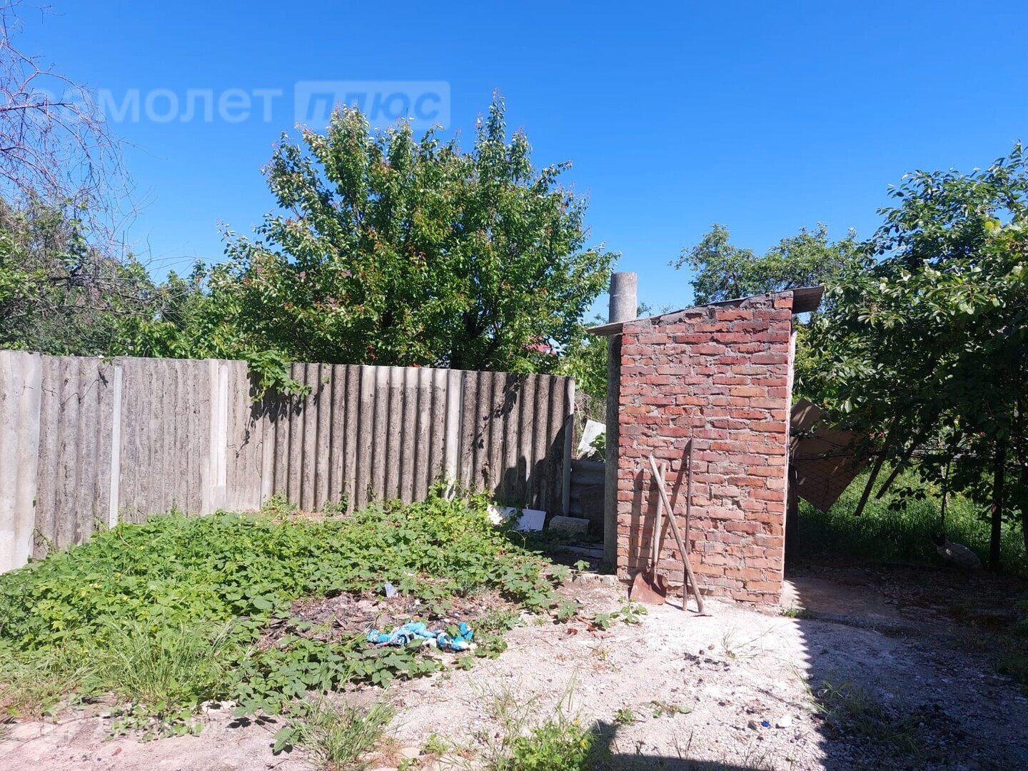 во дворе: навес, плитка , хоз постройки, плодовые деревья