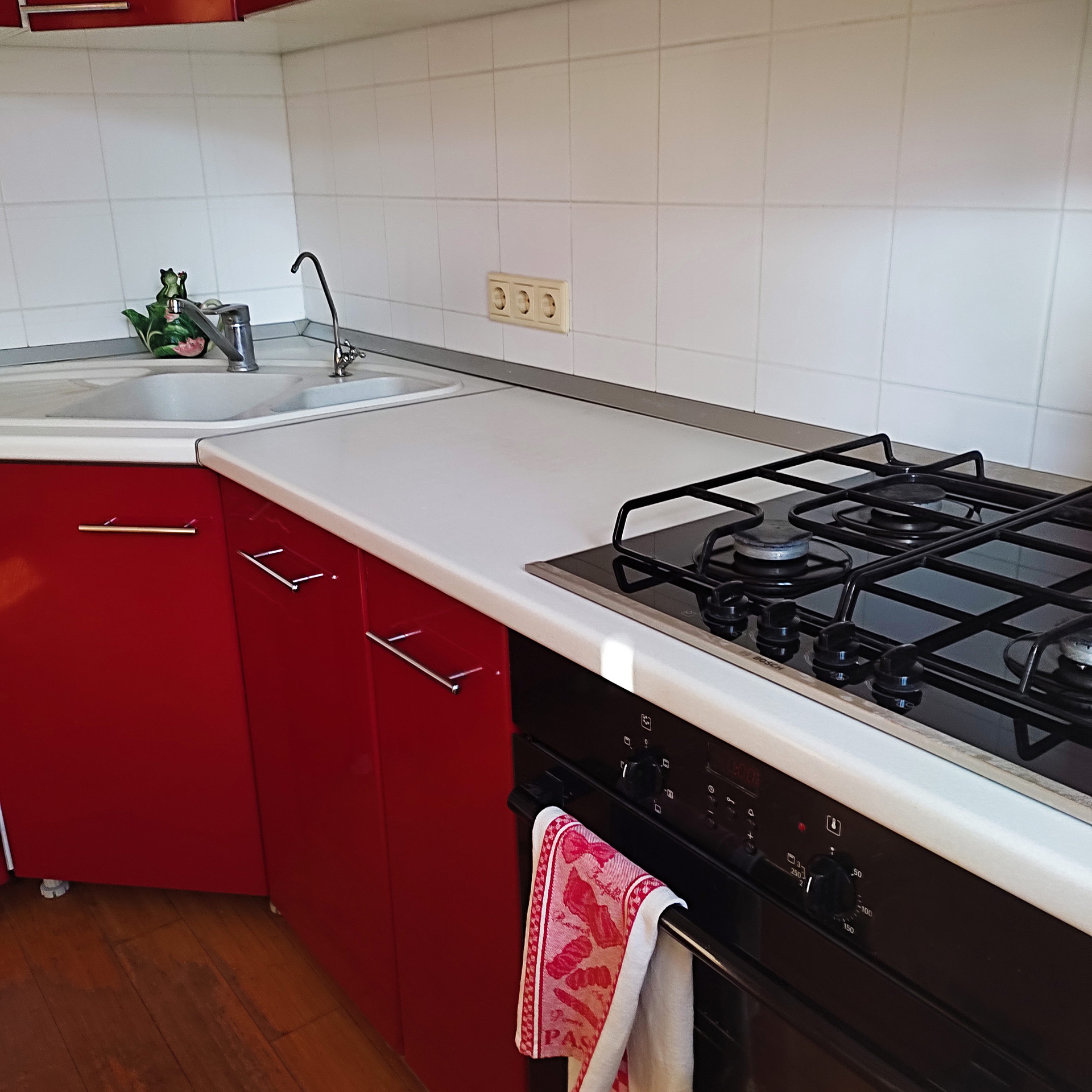 Площадь 10 м, в плитке. Кухонный гарнитур со встроенной посудомоечной машиной BOHS, газовая плита BOHS и хорошая электродуховка.